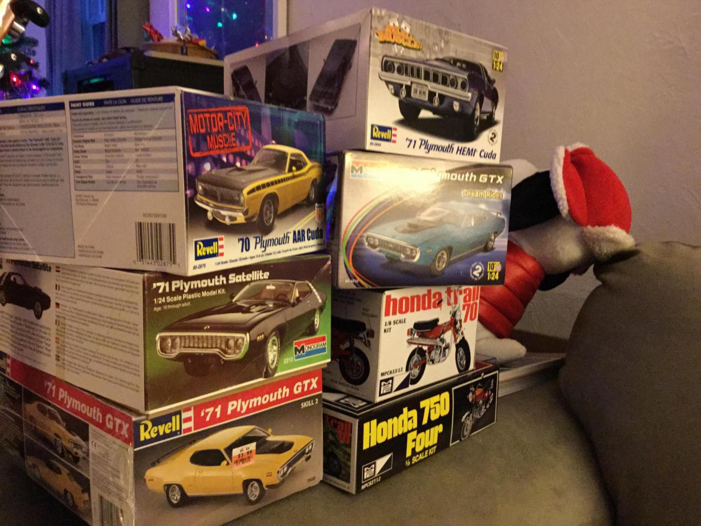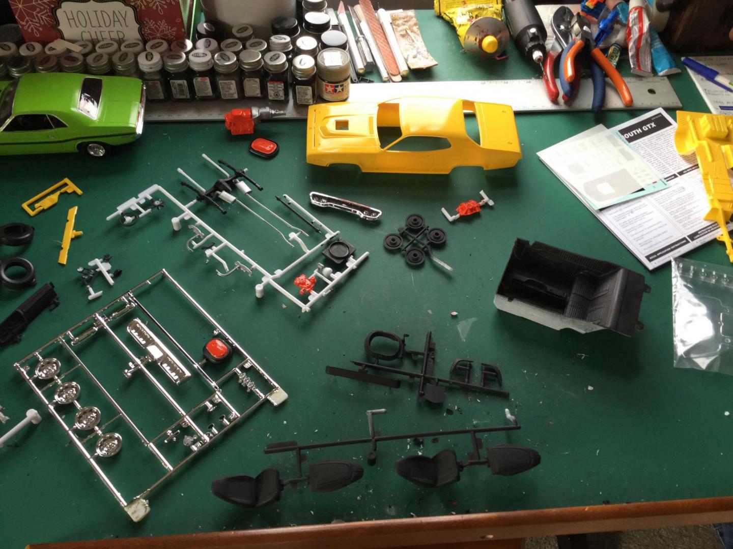 My brother gave me the latest release of monogram's '71 GTX/Satellite for Christmas this morning and I didn't waste any time getting to work... body is painted with Rust-Oleum paint, interior and other bits are done in Dupli-Color black primer, gives a nice texture for interiors. Grill is already detailed, most parts are painted, now it's time to start gluing The extra 340 in the background is going in a Chally T/A or AAR 'cuda. Merry Christmas everybody!