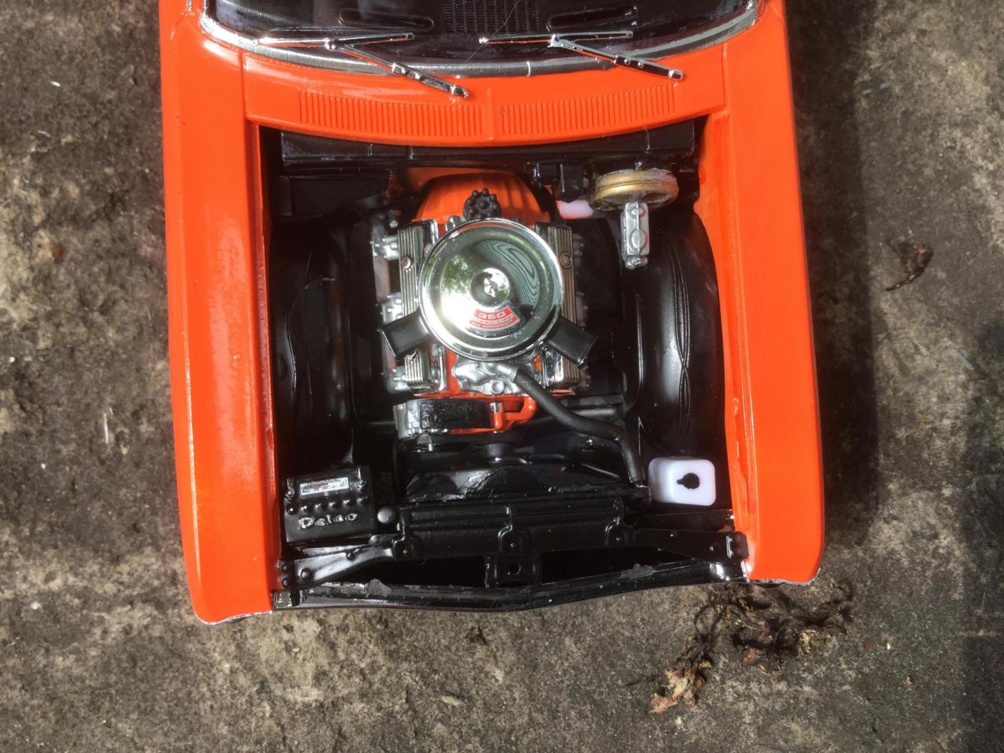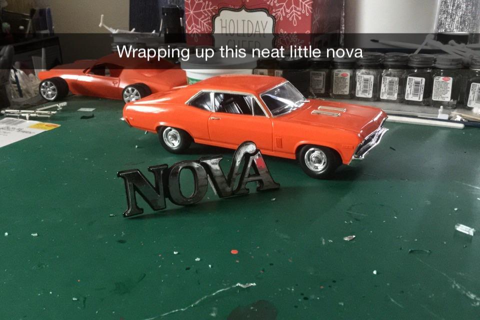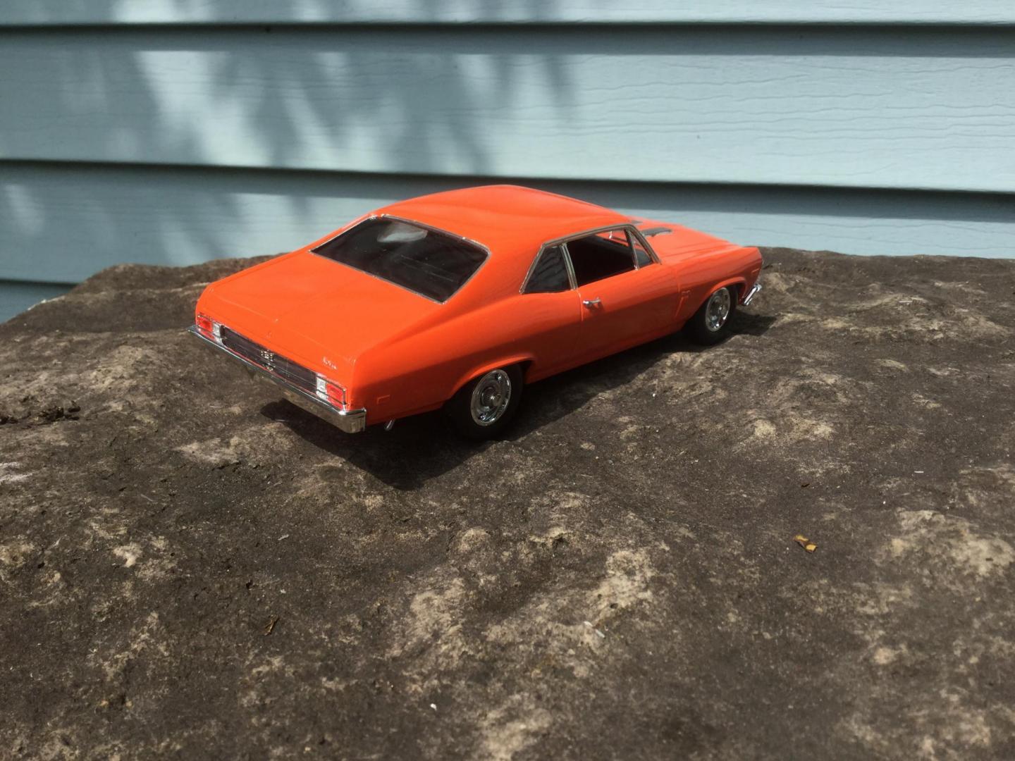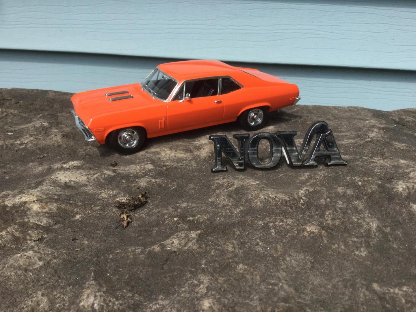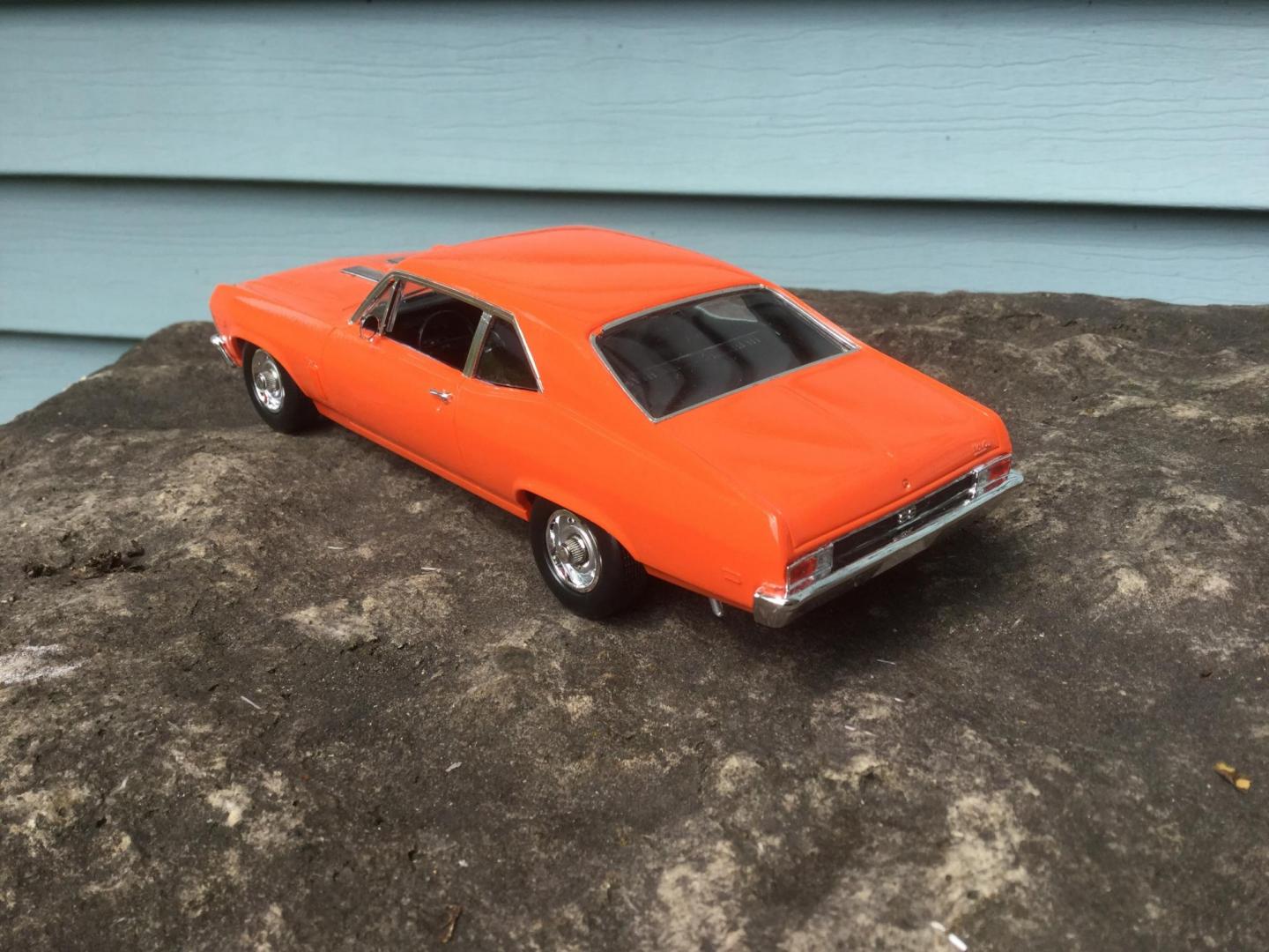 Hi everybody, sorry I haven't been on in months, my '72 GTO project took a tumble off a dresser a few months ago and between honors classes in school and work I haven't had any time to start putting it back together. Hopefully I'll get that project back on track eventually. Anyway heres my latest build, a '69 Nova SS 350. Paint is Rust-Oleum Orange with no clear coat. The front end was way too high out of box so I ripped out the axle pins and dropped the front end all the way, the right front wheel gave me trouble but it's good enough for me. I still need to paint up the side marker lights and put on the license plates, but here she is. I took the pics with a neat little nova badge my brother got me from a pawn shop.
