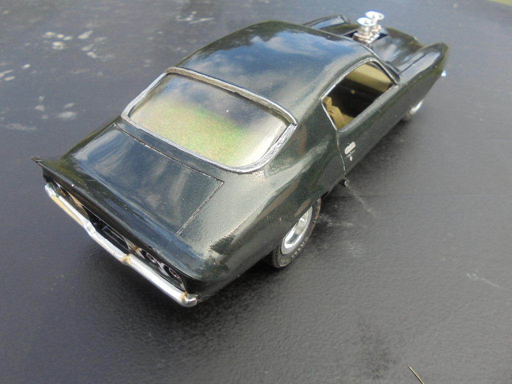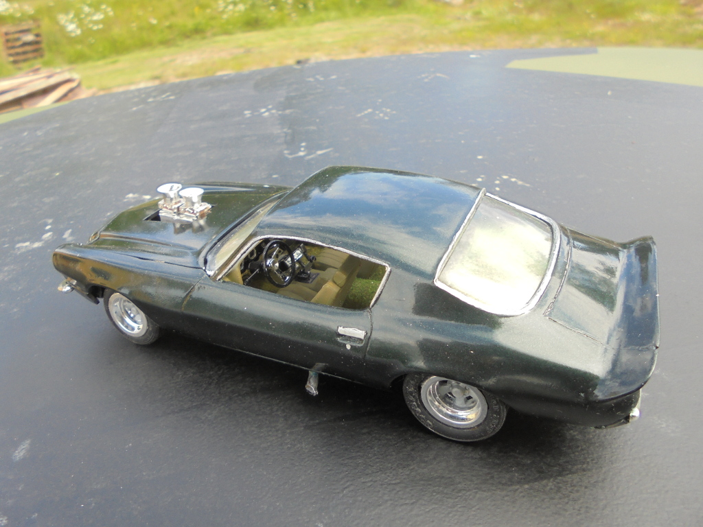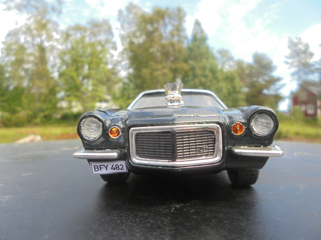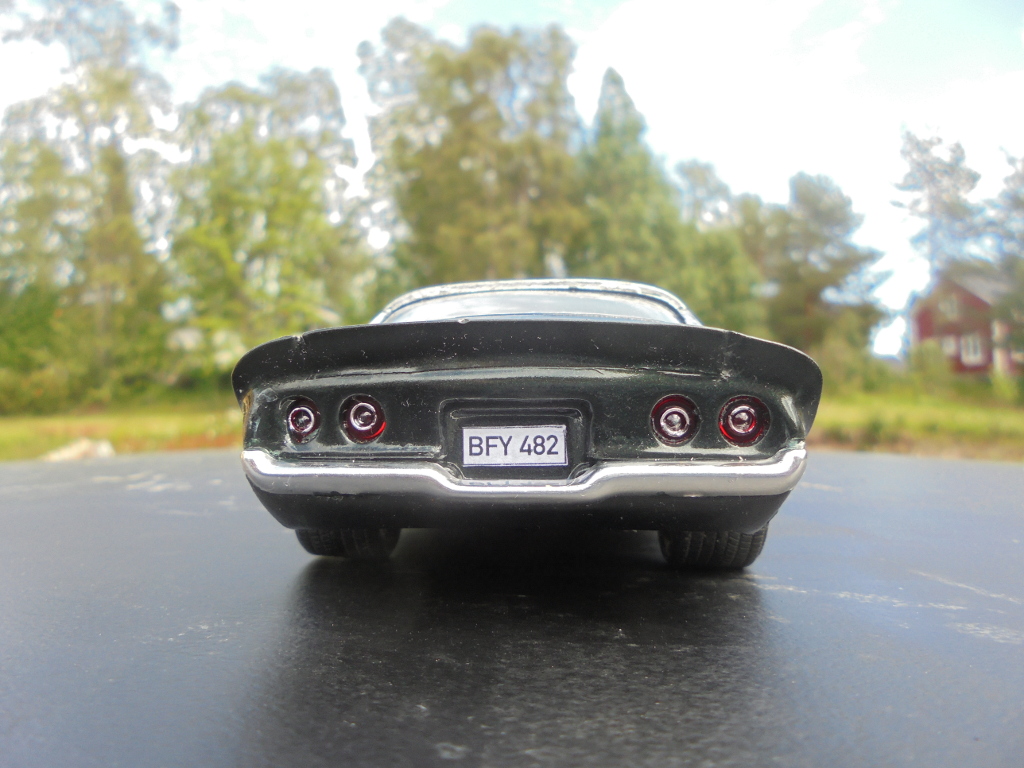 The rear spoiler in the kit was ill-fitting and strange looking, besides I like the large spoiler more, so it was cut out from a Monogram 78 Camaro body since I probably will never build that one anyway. Badges and side markers shaved for a cleaner look. Grant steering wheel, CB radio and wheels from AMT Chevy van, tyres from unknown source. Sidepipes from MPC 69 Mustang Mach 1. Home printed Swedish license plates. Pretty much box stock otherwise.