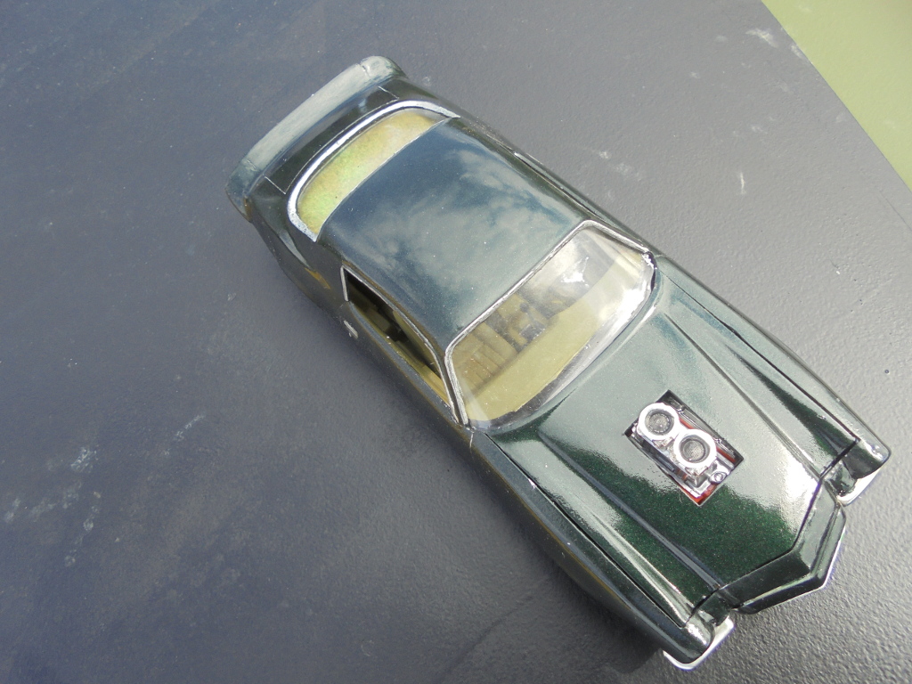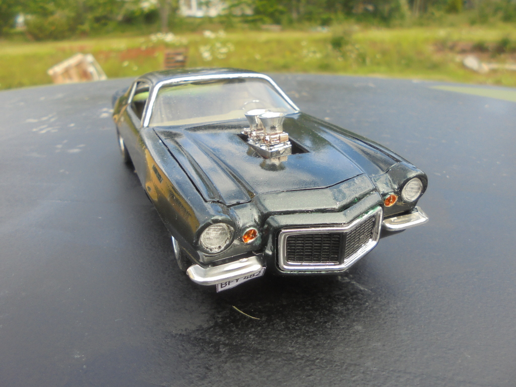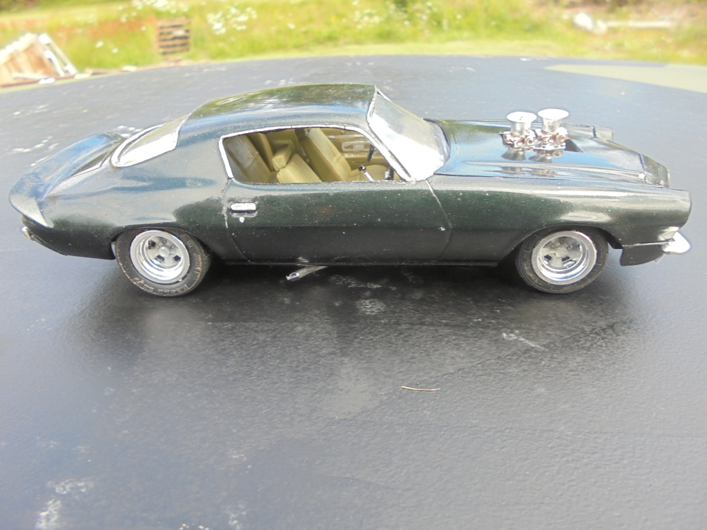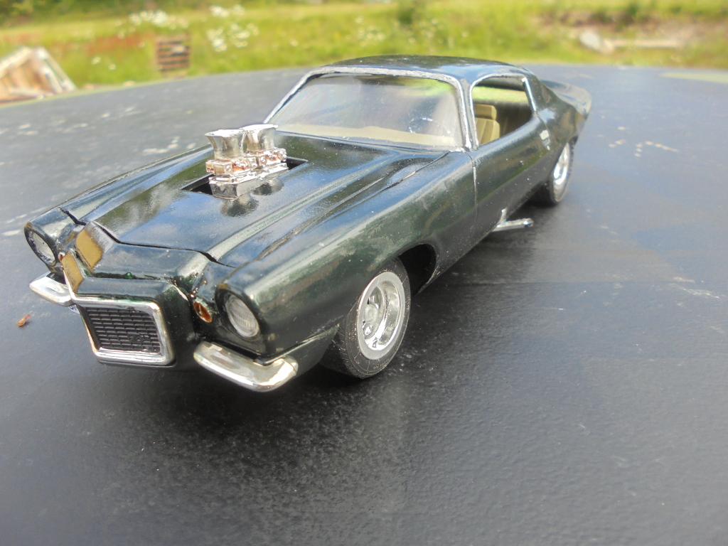 The rear spoiler in the kit was ill-fitting and strange looking, besides I like the large spoiler more, so it was cut out from a Monogram 78 Camaro body since I probably will never build that one anyway. Badges and side markers shaved for a cleaner look. Grant steering wheel, CB radio and wheels from AMT Chevy van, tyres from unknown source. Sidepipes from MPC 69 Mustang Mach 1. Home printed Swedish license plates. Pretty much box stock otherwise.