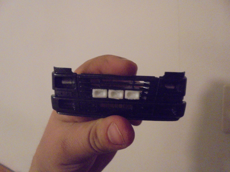 I got a bit upset when this one did hit the floor and shattered into pieces, but I gave it another chance now. Maybe not too bad looking? I was a bit nervous when I got the idea that three auxillary lights would look good recessed into my freshly painted grille, but I managed to cut it mostly unscratched, so.... A little mockup. -