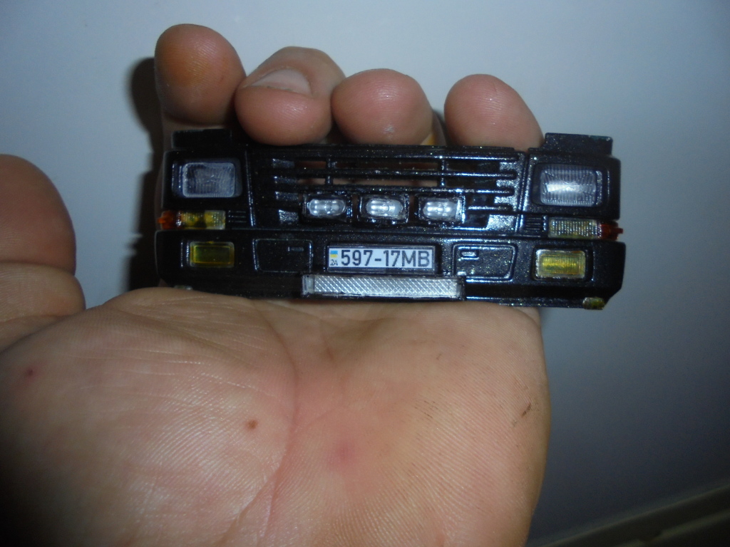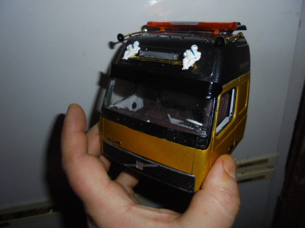 Made an LED light bar from some Evergreen profiles and the foil from a medicine package. I think that it looks convincing enough. Also, Ukraine plates, dont know why but they felt like they did fit into the theme, lol. LED light bar and two Michelin men above the windshield, air horns (painted with yellow candy for brass look since it felt more fitting here than chrome) and a hazard light bar on the roof. -
