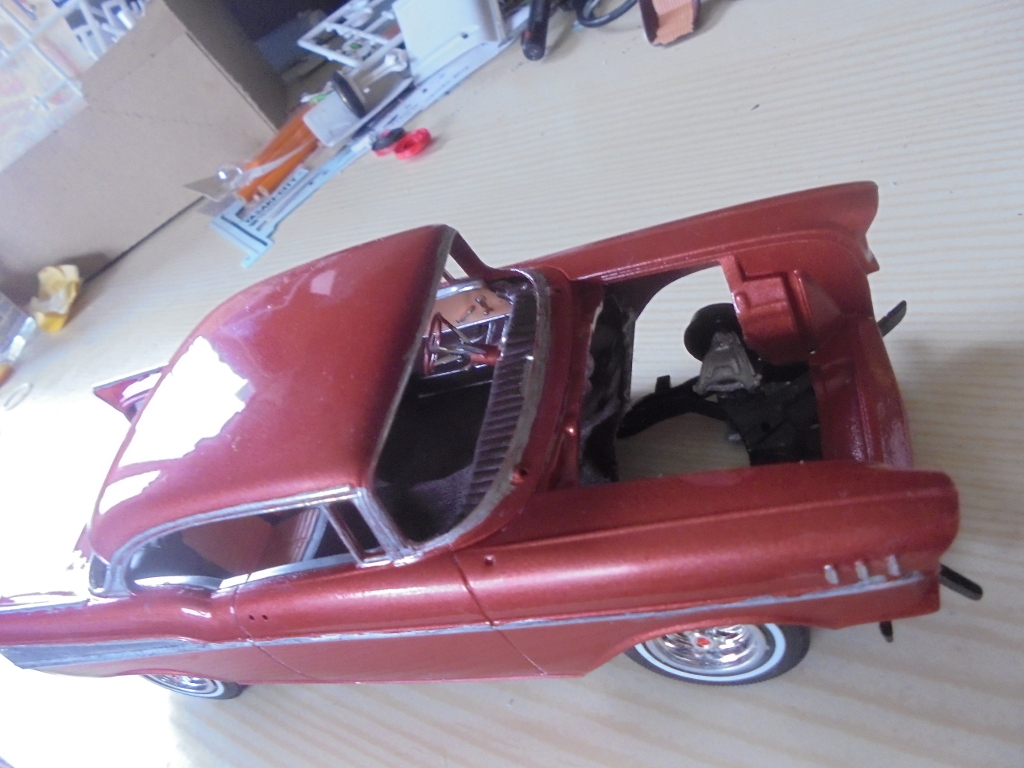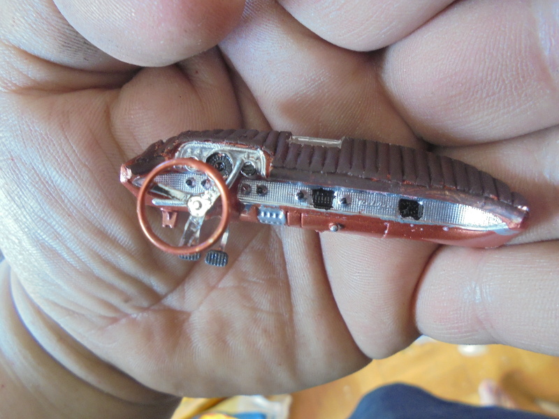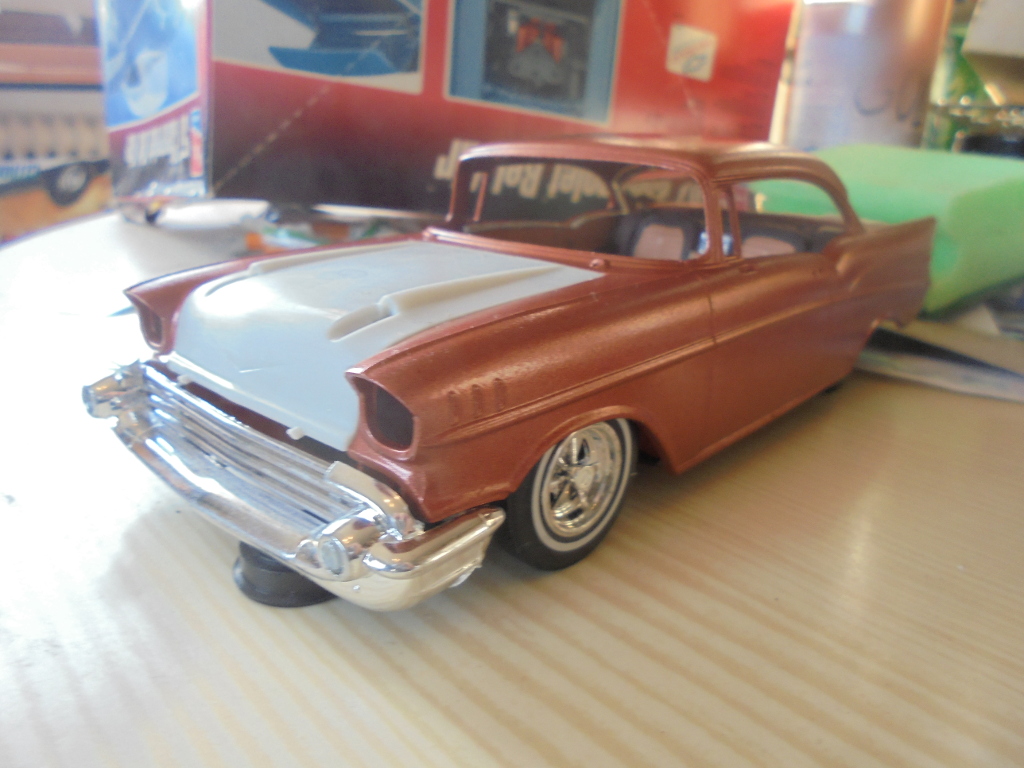 AMT new tool 57 I got very cheap at a swap about five years ago. It has been stalled for a while. Now I found some good front seats though, which was why it was stalled last time.... Carpet from a towel painted with acrylics, AMT 49 Mercury front seats (from what I've heard, never owned one), and a modified 64 Galaxie XL seat in the rear to get something more bucket like. Tuck n roll on the dash and steering wheel from Monogram 55 Chevy Cragars with spinners from the stock hubcaps Mockup.... No clearcoat on the body here, that's why it's not shiny.