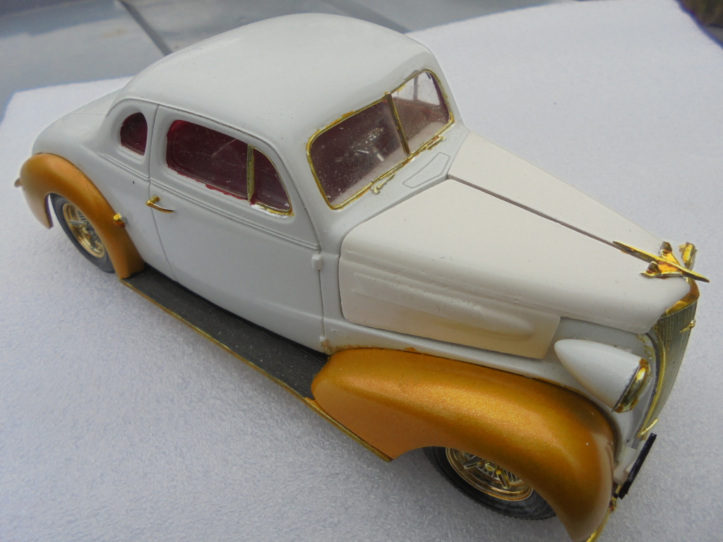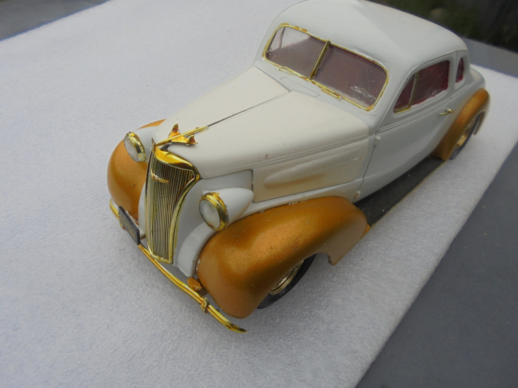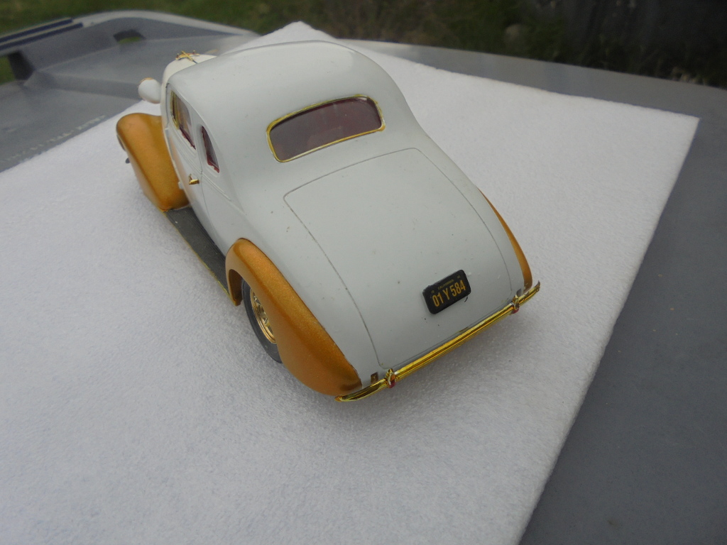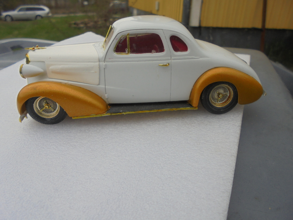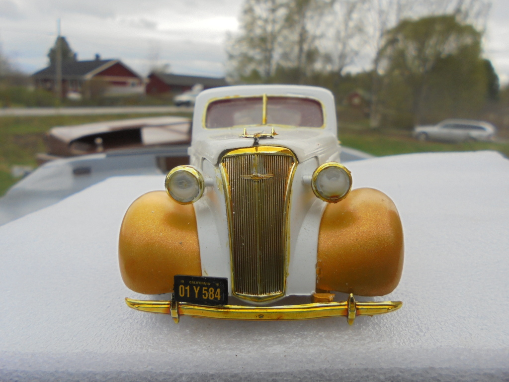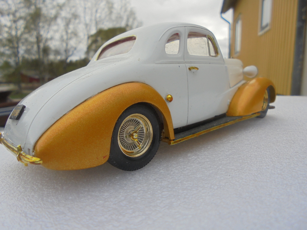 Galaxie 48 Chevy Fleetline Aerosedan. Moebius 54 Hudson wheels with the kit supplied tyres. Coontail made out of cotton and acrylic paints, swampcooler scratch built out of a 32 Chrysler headlight, a plastic pen, a piece of cloth and what I think was a 57 Ford headlight bucket. Front spotlights from the parts bin, don't know source. Otherwise, pretty much OOB. Painted some cheap 1-coat rattlecan copper metallic that wasn't the easiest to lay down smooth.....