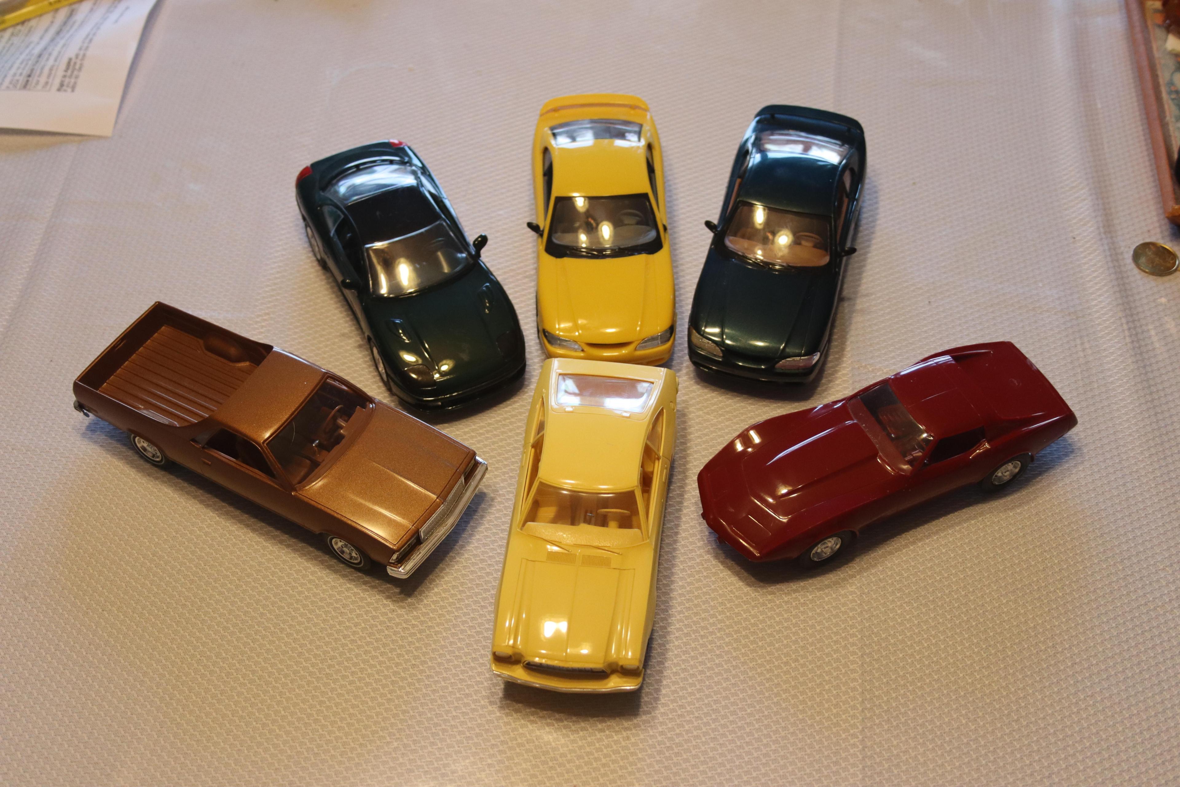 Received six promos I had won from an on-line auction. Back row is a '93 Dodge Stealth, '94 & '95 Mustangs, front row '79 El Camino, '75 Mustang II, '77 Vette. I am going to keep some and put the rest into my for-sale/trade box.