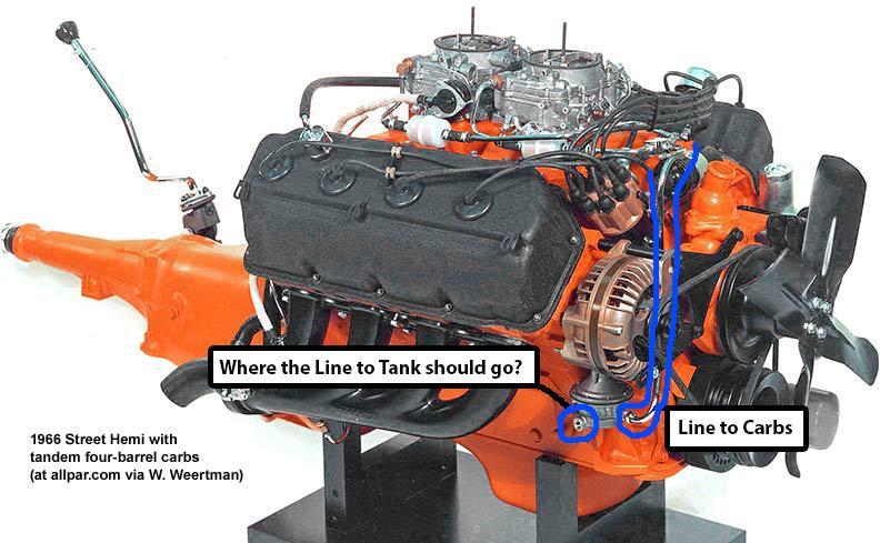 I am just surprised that there is no oil filter and pump on the model. Its kinda disappointing. Now I assume the fuel pump has a line that run from the gas tank and then one to the carbs correct? I look at the photo I posted and I see the fuel pump with a line that goes up the motor and splits to the carbs. but then no other line leaving it. I am assuming that is because the pic is of a free standing motor and not in a car. Again, assuming that hole I can see would be where the lines goes from the pump to the tank.