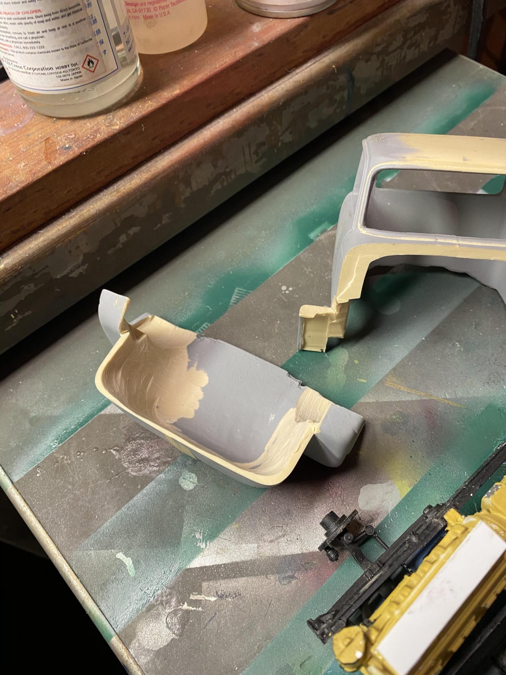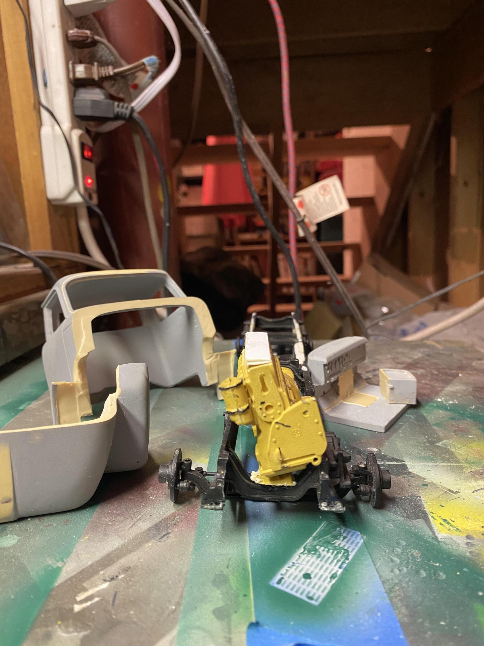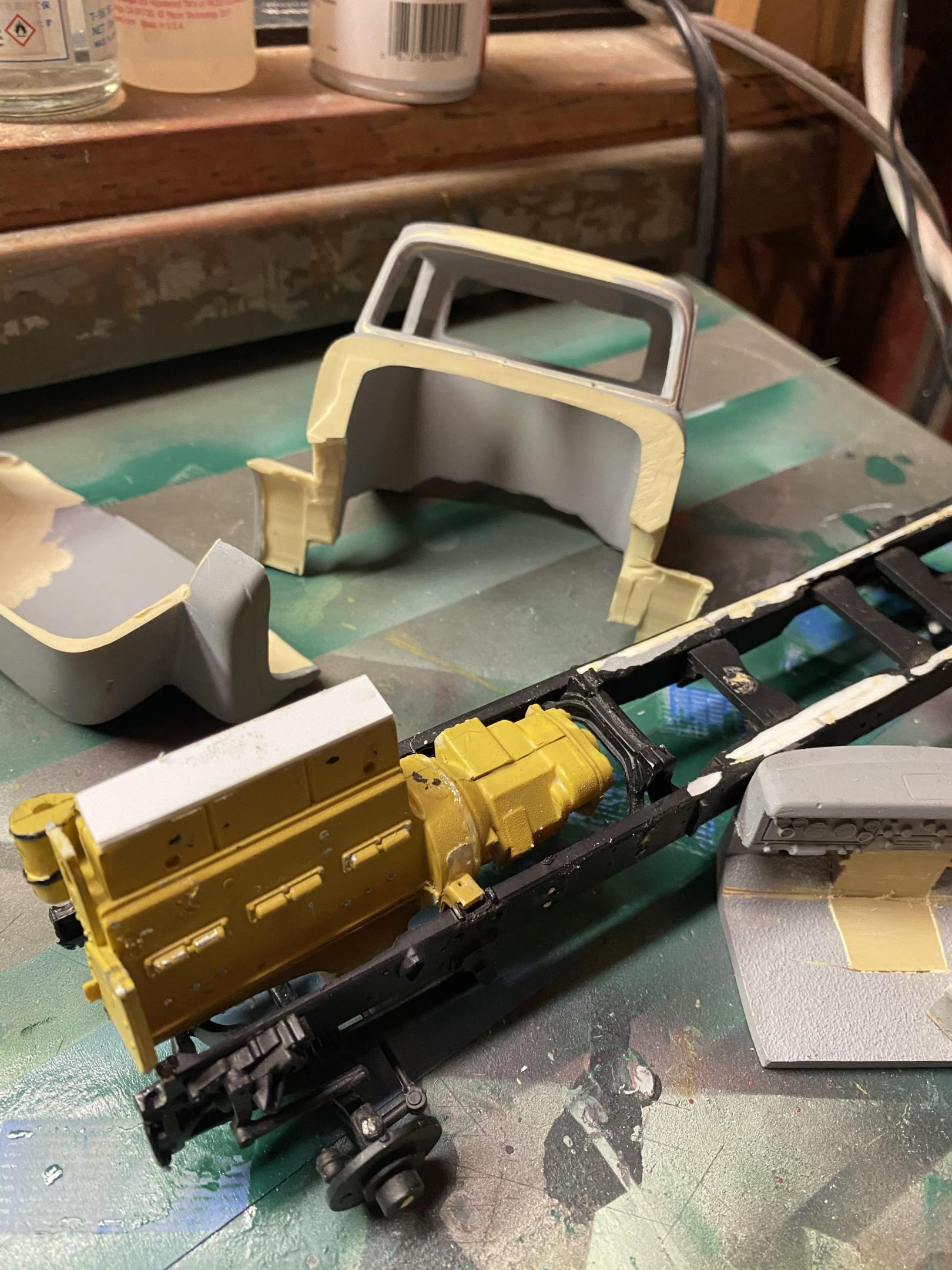 Well, while waiting for parts to arrive for the crane, figured I’d give this some time. So, I thinned out the hood, and cut the gasket outline around the windshield and rear window openings. I also cut the doghouse out of the interior tub, and will cut the floor and hollow it out to give clearance to the rear of the Cummins engine. As the engine is tilted to the right in this model in order to get room to tuck it under the dash, I modified the oil pan and the rocker covers, and rhe transmission and engine mounts to reflect the tilt. I have decided to build this as a single axle dump truck, as the paver crew put in a request for a smaller truck for those tight areas. -