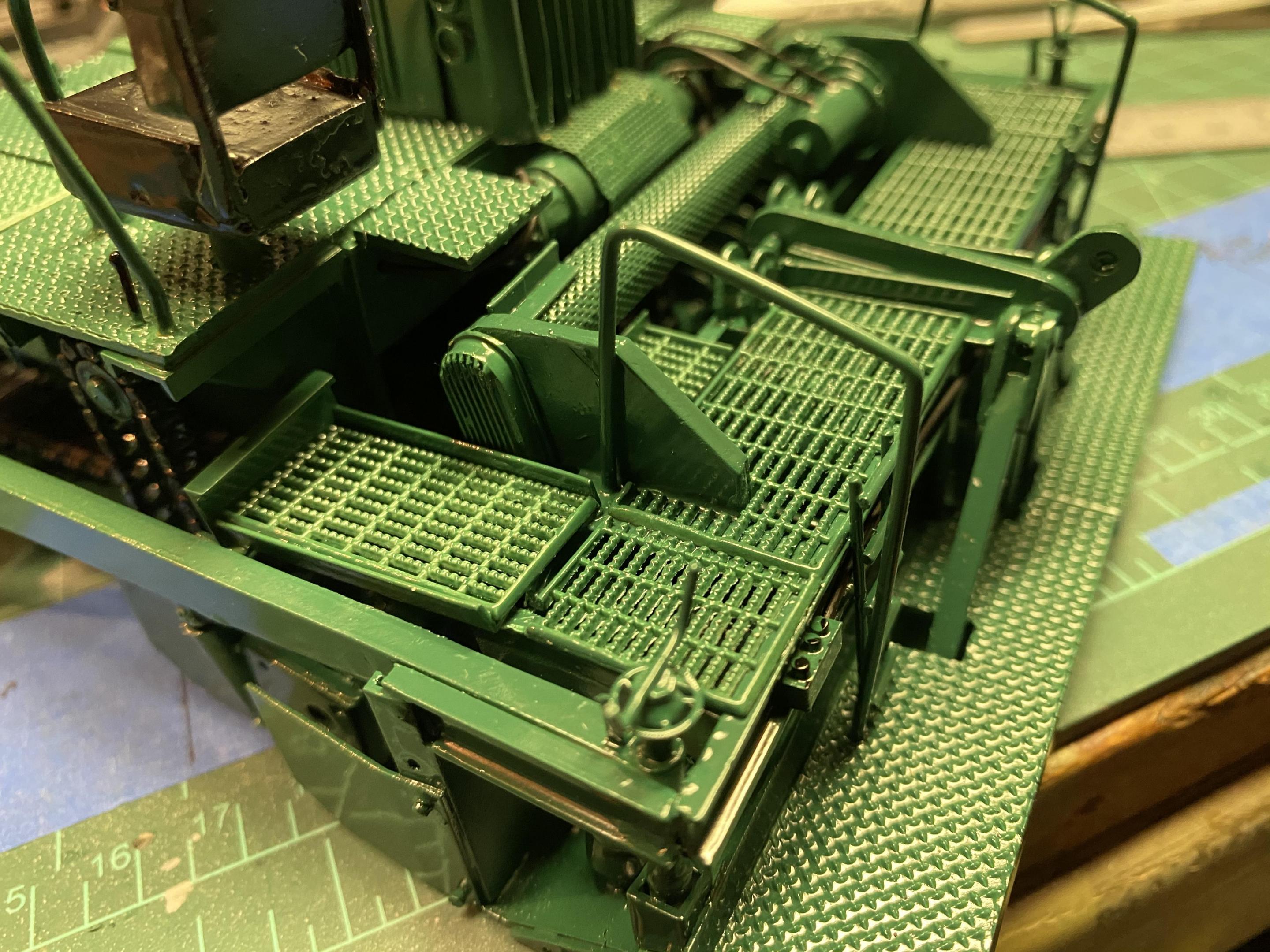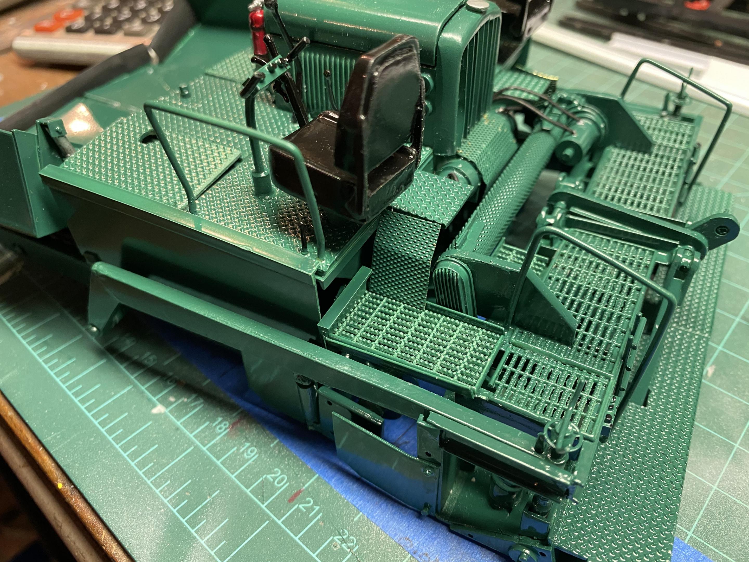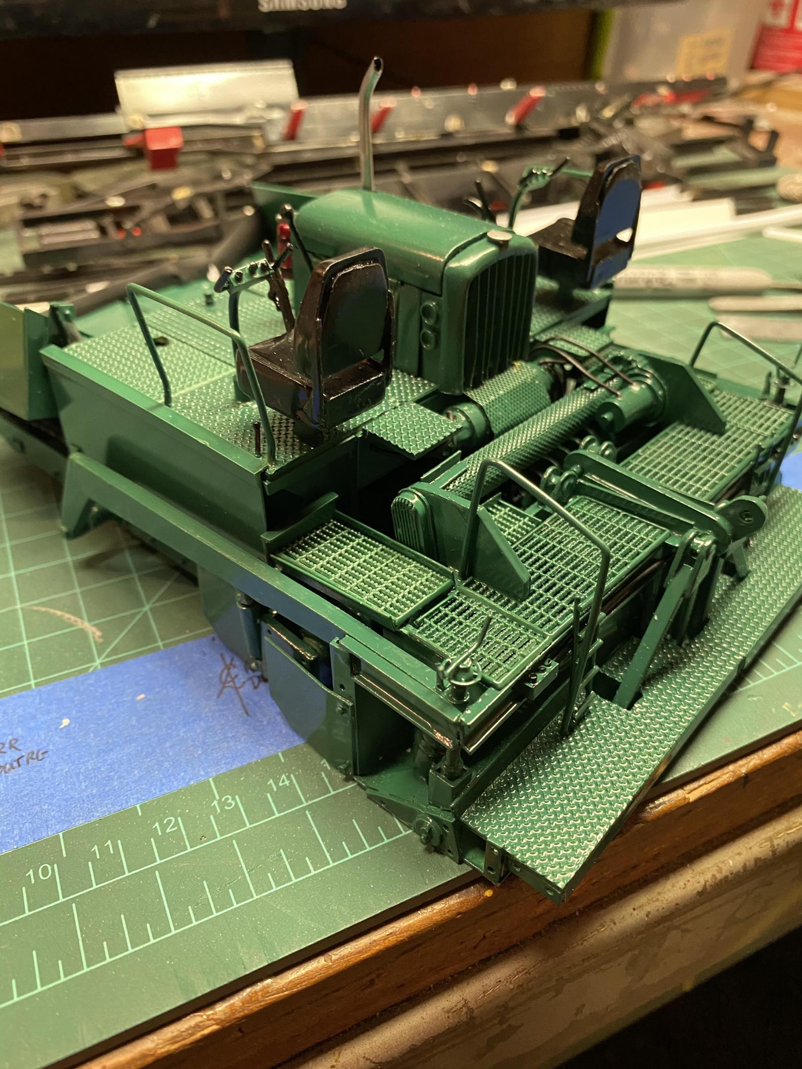 Well the decals came in and just were not making me happy, as they were too large a letter size. I am only using model railroad letters as it is just the simple name of Barber-Greene going on the machine. So, I ordered a smaller size. Of course, with lots of time now waiting for the new decals to arrive, sitting here just looking at this got my OCD going, and I decided to fix one aspect that bothered me before I decal it and dull cote the whole thing. The tamper eccentric drive was just too much out of scale. It just looked wrong. So........out came the wrenches and torches and the mechanics reworked it today, while social distancing themselves, as today’s paving job got cancelled as being non-essential. Got a new set of eccentric cranks and guards installed along with some more screed operator’s platform sections. Looks MUCH better now. Lemonade from lemons!