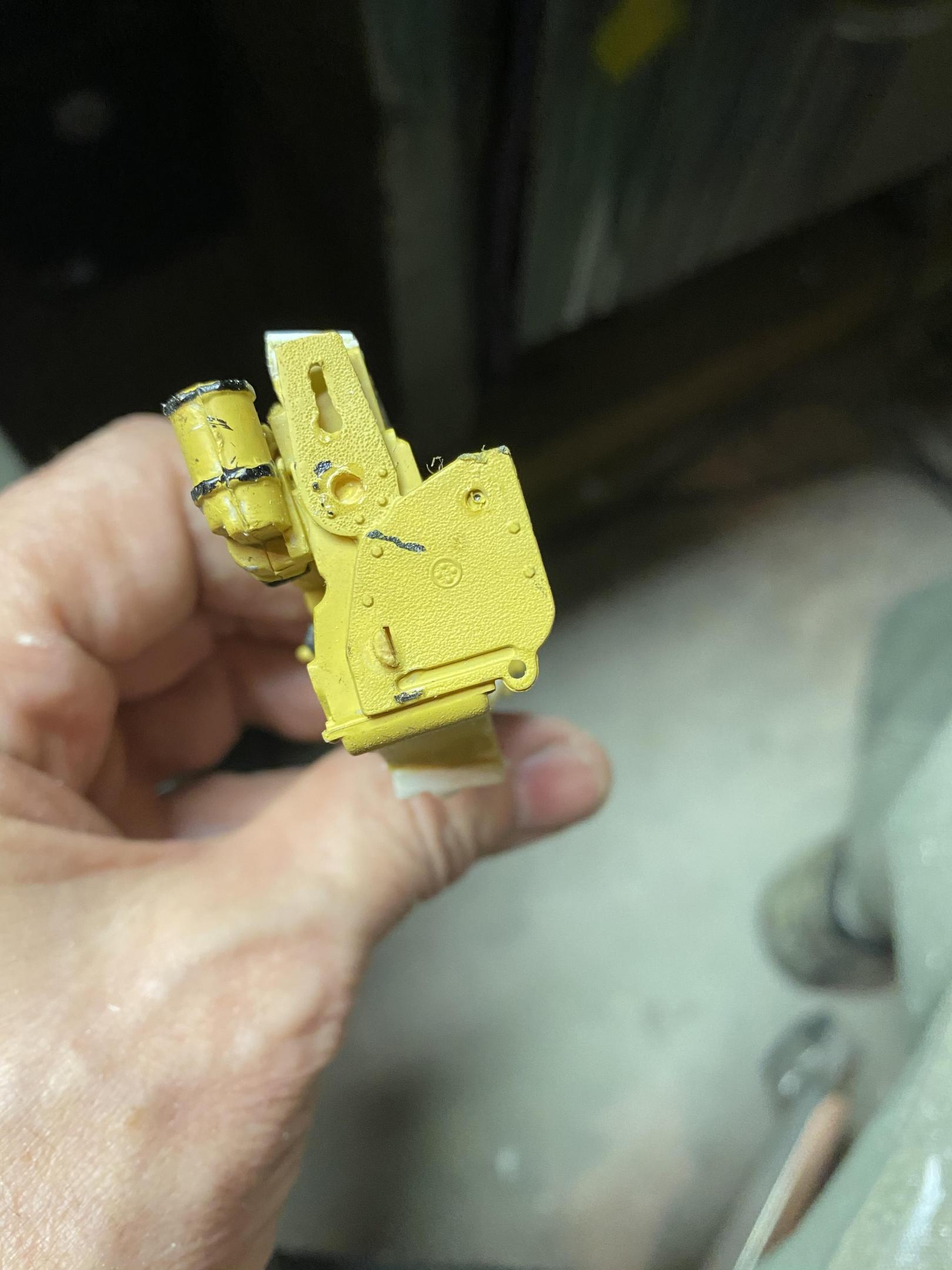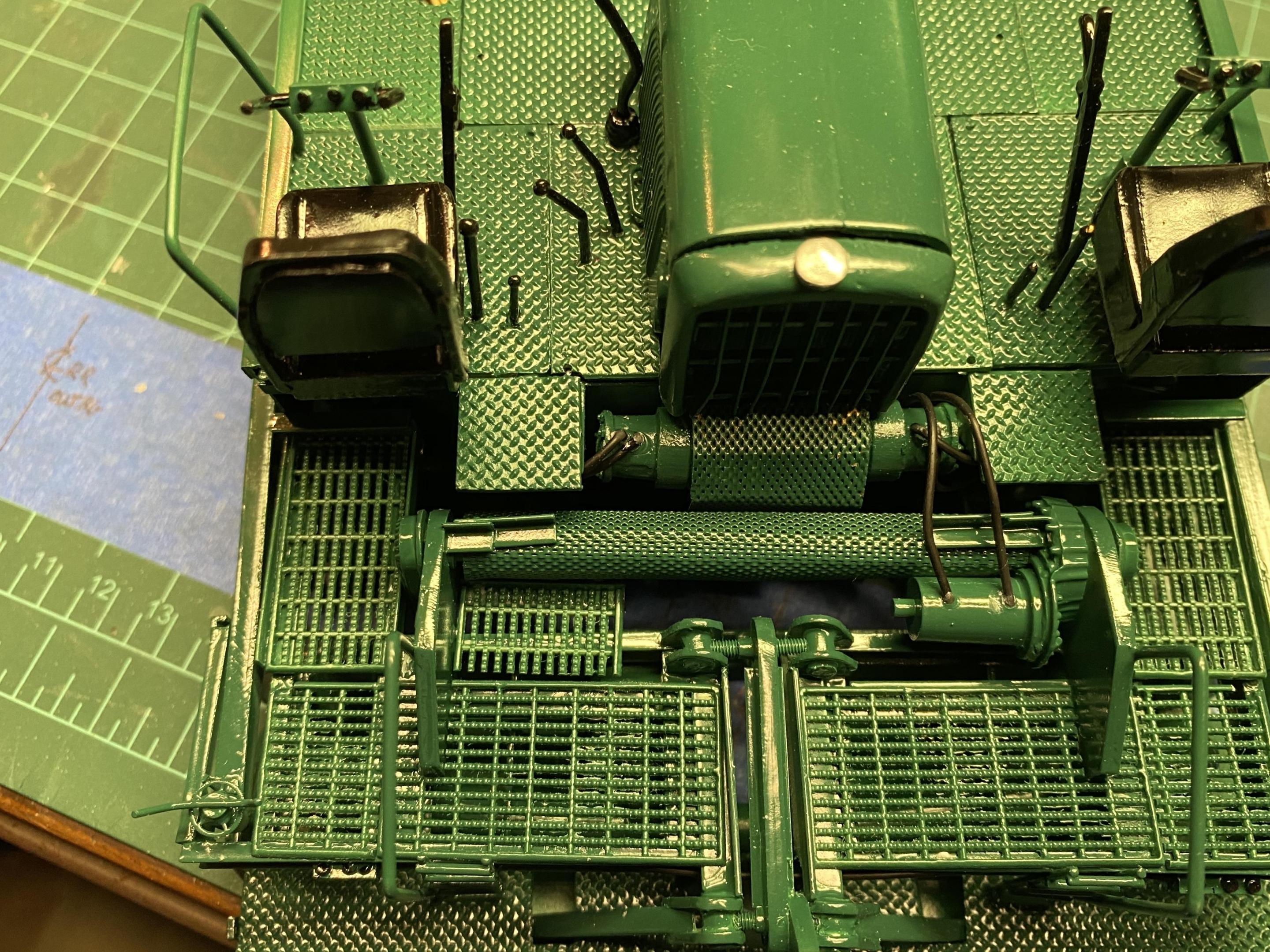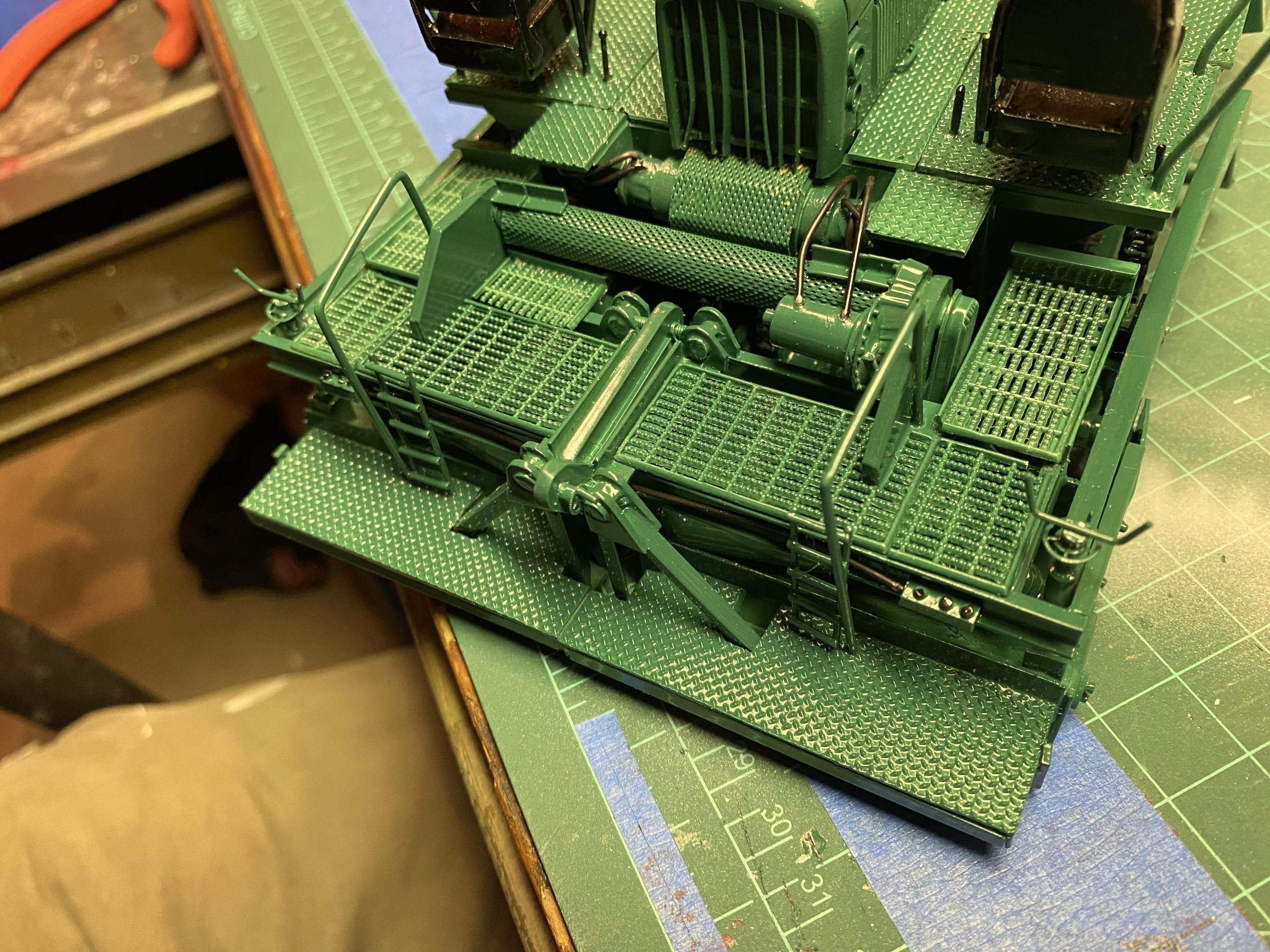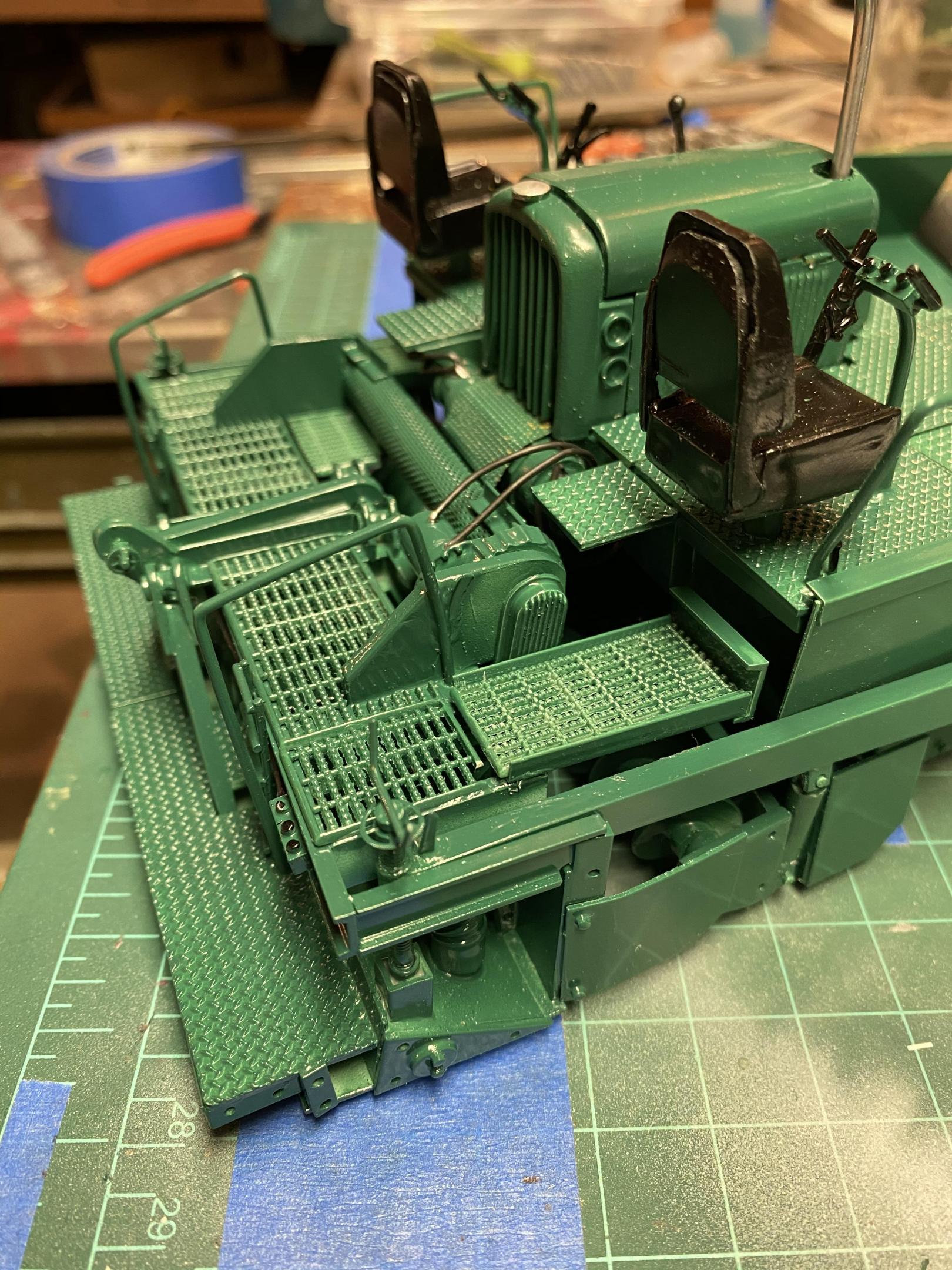 Well the decals came in and just were not making me happy, as they were too large a letter size. I am only using model railroad letters as it is just the simple name of Barber-Greene going on the machine. So, I ordered a smaller size. Of course, with lots of time now waiting for the new decals to arrive, sitting here just looking at this got my OCD going, and I decided to fix one aspect that bothered me before I decal it and dull cote the whole thing. The tamper eccentric drive was just too much out of scale. It just looked wrong. So........out came the wrenches and torches and the mechanics reworked it today, while social distancing themselves, as today’s paving job got cancelled as being non-essential. Got a new set of eccentric cranks and guards installed along with some more screed operator’s platform sections. Looks MUCH better now. Lemonade from lemons!