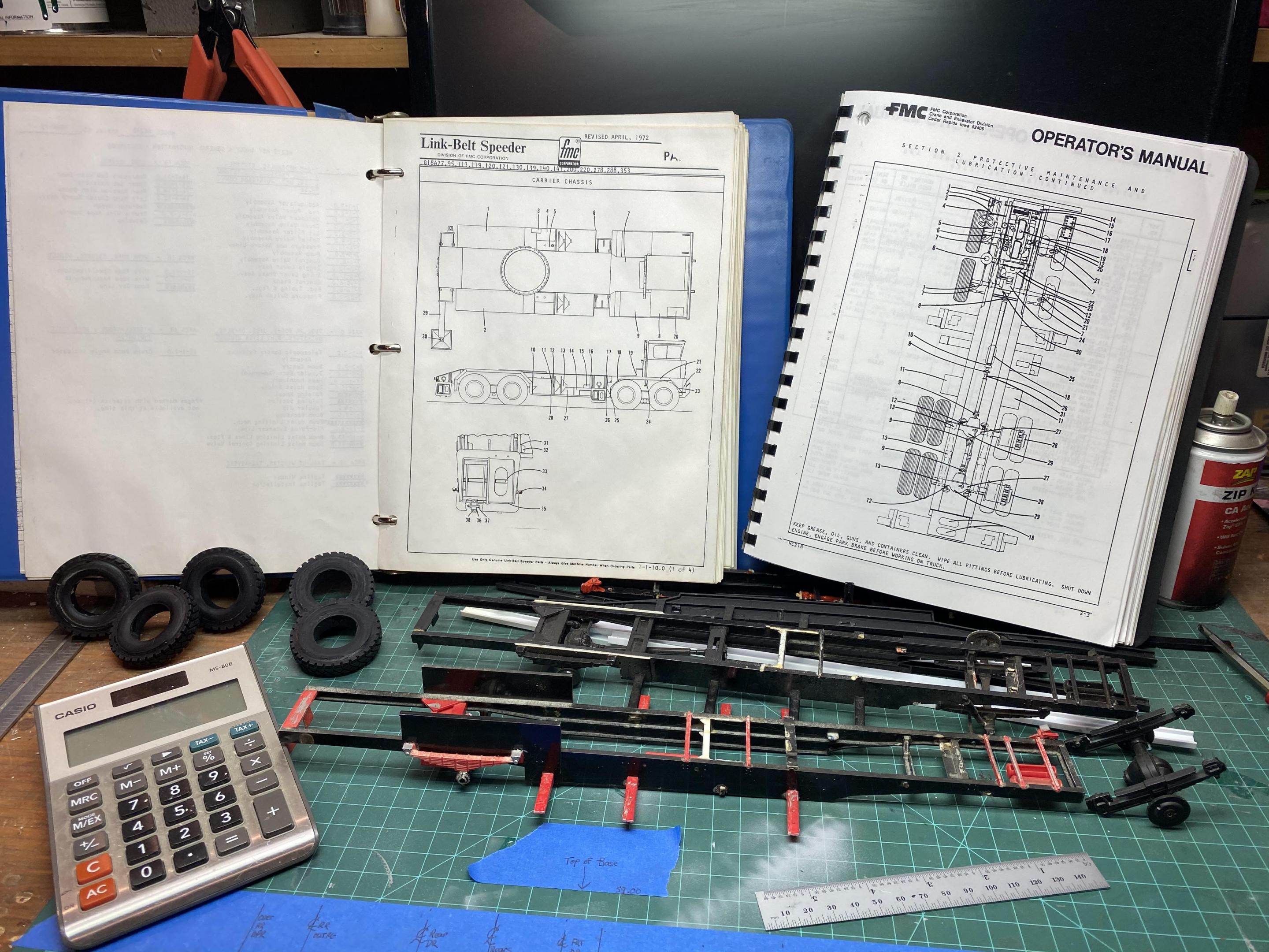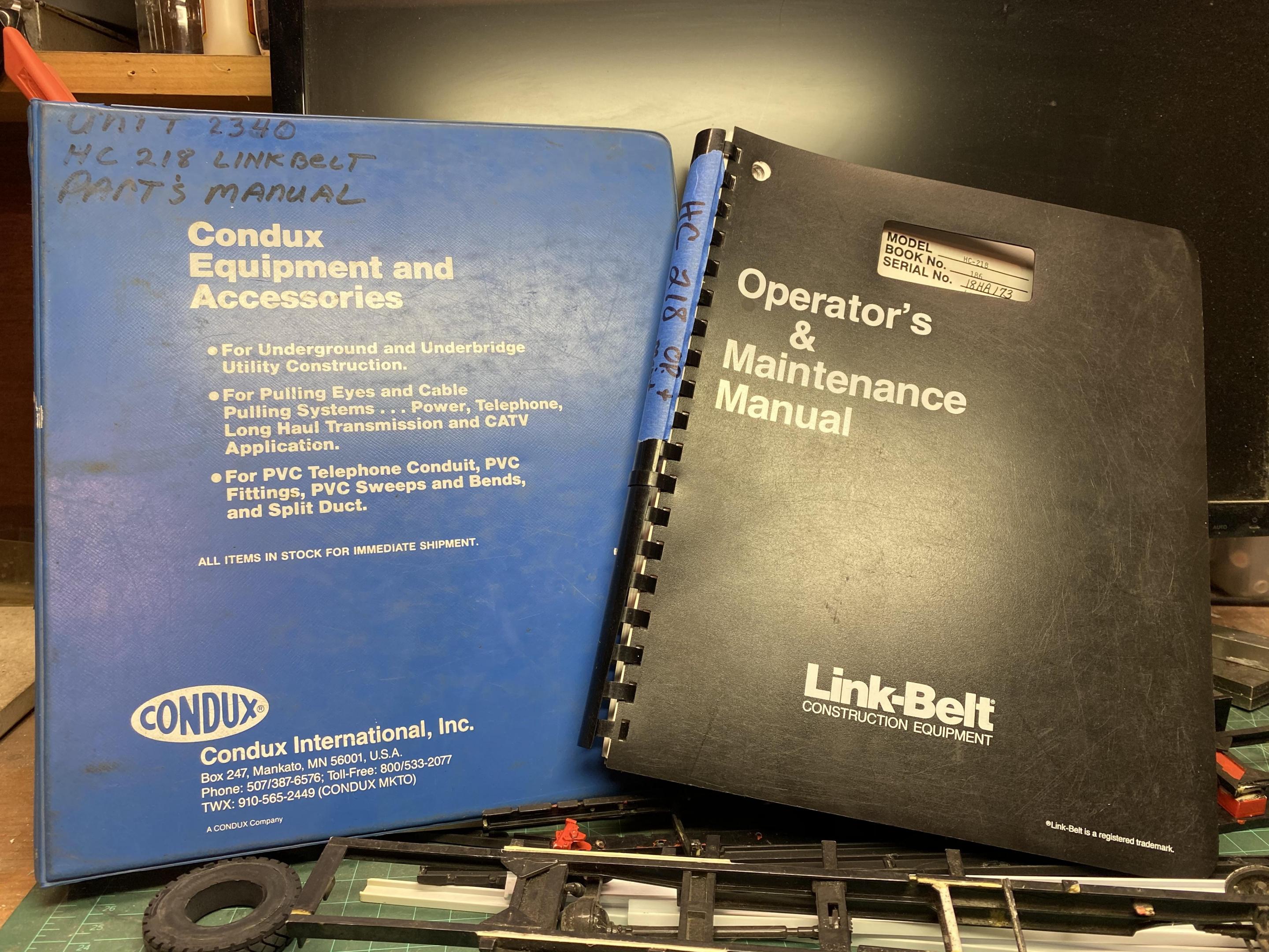 So........having all but finished my paver build, it’s time to start the next project. Years ago I worked for a large general contractor. Actually, all of my builds are based upon equipment we had there and were on my jobs. This HC-218 is an 82 ton capacity, and had, if memory serves correctly, 210’ of boom and 30’ of jib on it. This was powered by an 8V-71 on the truck and had Cummins upper power. That old girl earned her keep back in the late 80’s when I was there and is still doing so to this day. And, as usual, step one is getting reference materials. I obtained a parts manual and operator’s and maintenance manual to start. I plan on starting with a frame from an American LaFrance ladder truck, which will undergo a lot of alteration to accept the dual drive and dual steer arrangement and get super reinforcement done to it. My plan is to make this with approximately 100’ of boom which will be plenty! This thing is going to be huge! The length of the truck will be 33’ 4” in scale alone, and 10’ 6” wide. Attached are some photos of the crane we had. The red cab photos are of it’s first, and original paint job. The white cab is an updated Link-Belt color scheme that I painted it in just before I left there. In the wintertime I ran the paint and weld shop and this old girl got done up by me 3 times. That is why I tend to favor paint shop fresh jobs!!! I hope you enjoy the journey through this one, its gonna be a heck of a ride!! Hang on!