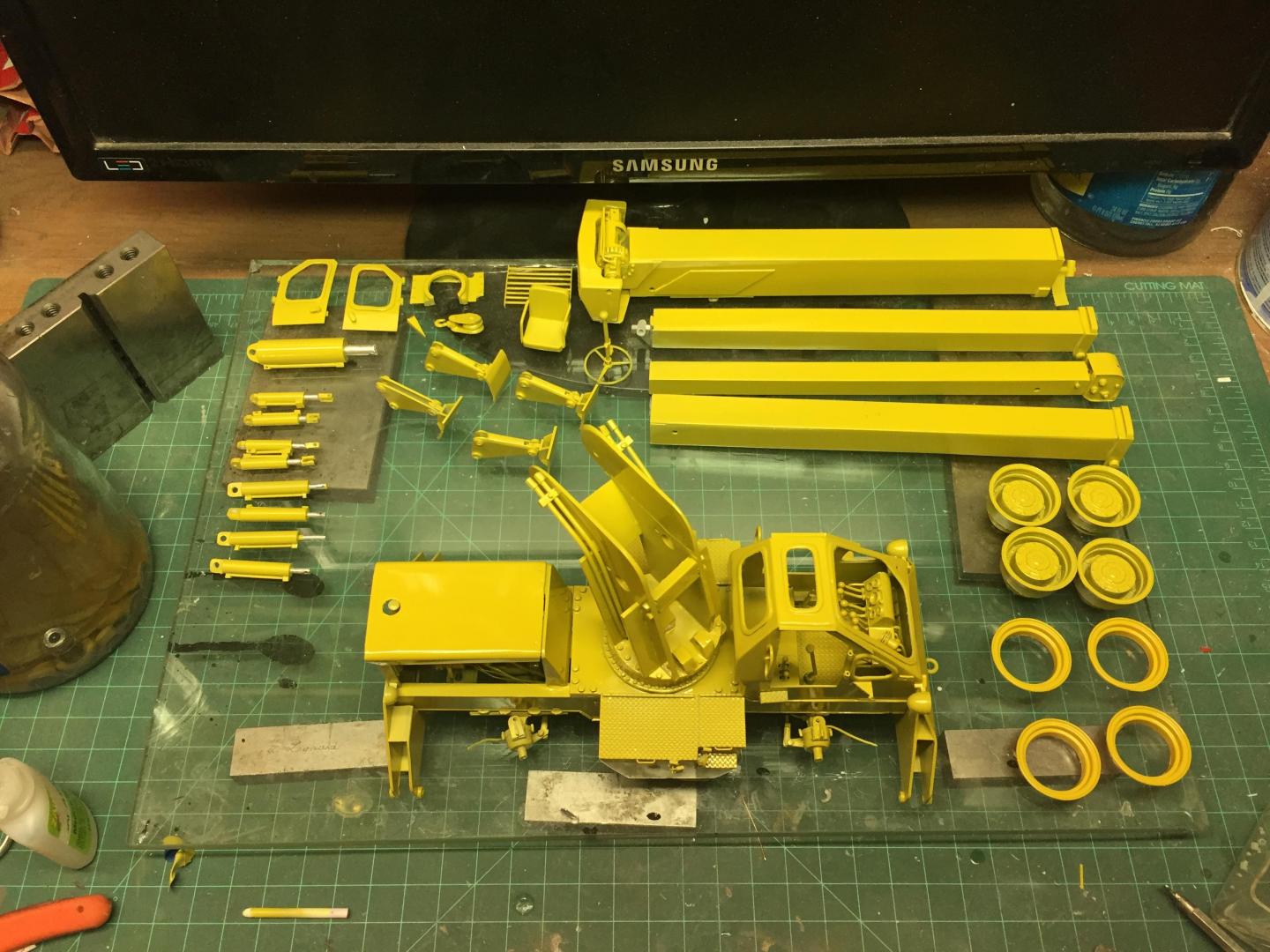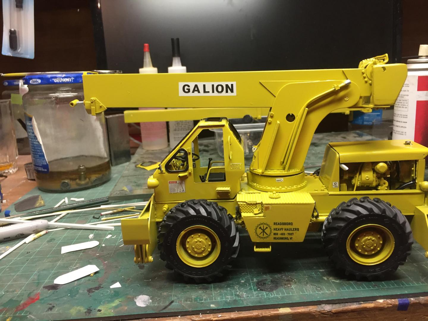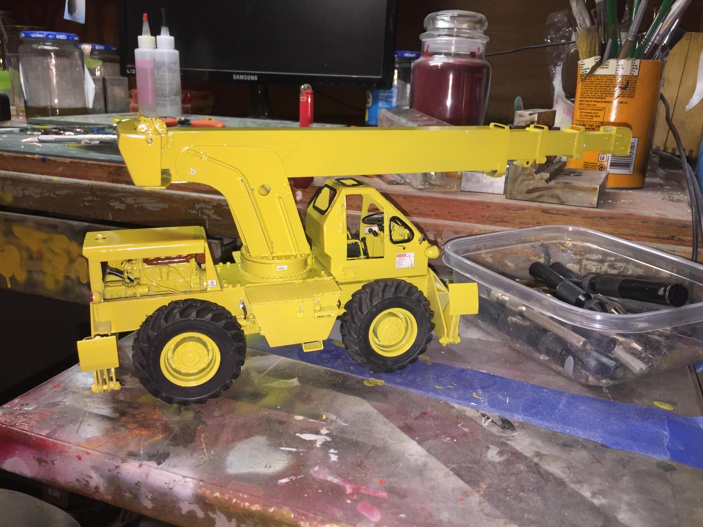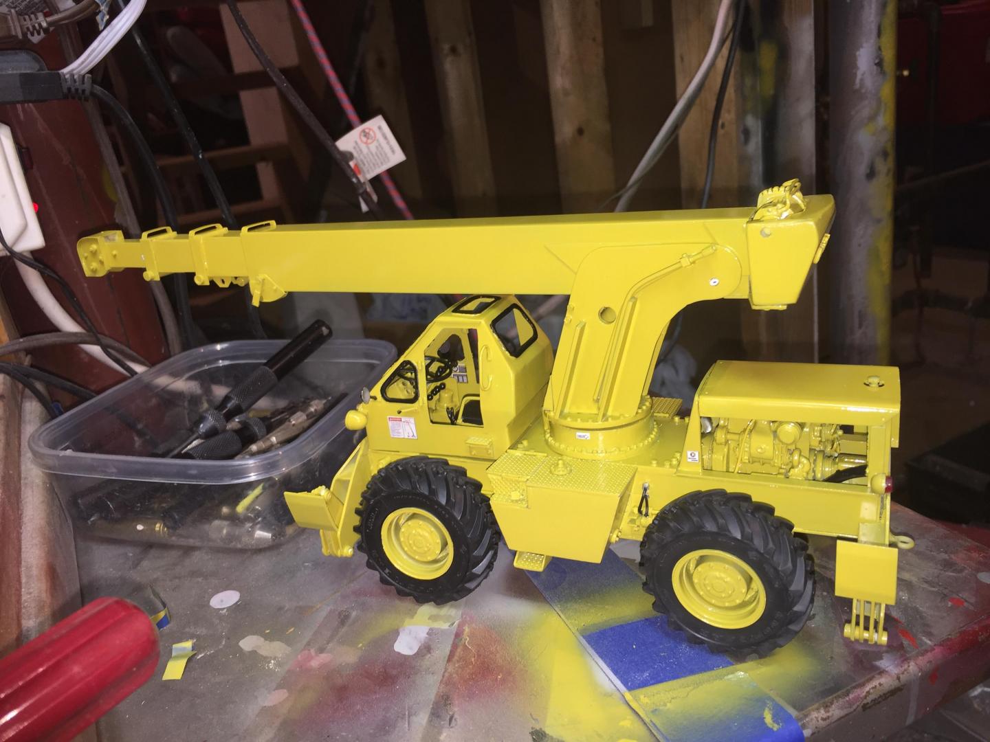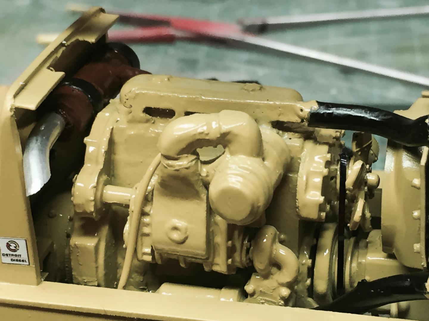 Spent some time adding details. Added grab handles to the cab, hinges and handles to the fuel tank and battery access lids, installed the engine, added fuel lines, coolant hoses, fan and shroud, radiator cap, air filter, door stops, mirror brackets, head and tail lights, made the exhaust system, (the muffler Is not hollow, but it's filled with a clear lucite rod to make it solid.....it just is an illusion), cable retainers on top of the boom, LOTS of nuts and bolt details to the axles, turntable, swing gearbox and everywhere else that looked naked, hook travel tie down, hydraulic and fuel tank drain covers, hydraulic fill cap, and a LOT done on the punch list! Getting VERY close to paint now! There will be a LOT of subassemblies to paint separately then a lot of assembly time but the light at the end of the tunnel is actually visible! Guess it's time to mix some Galion yellow paint!