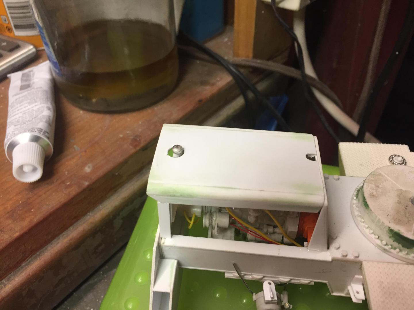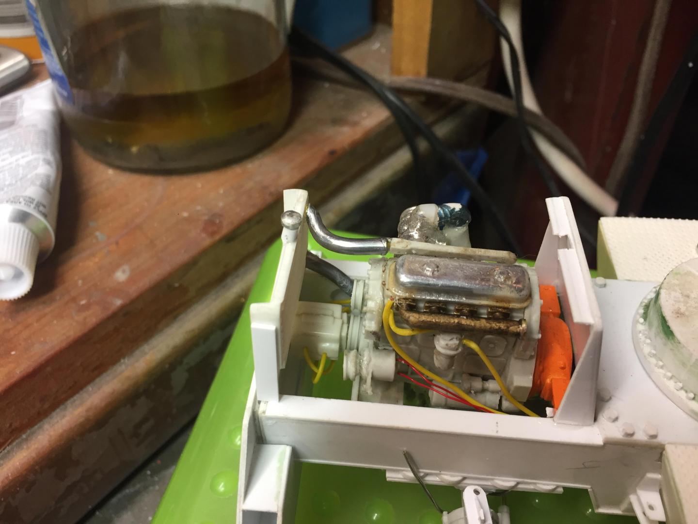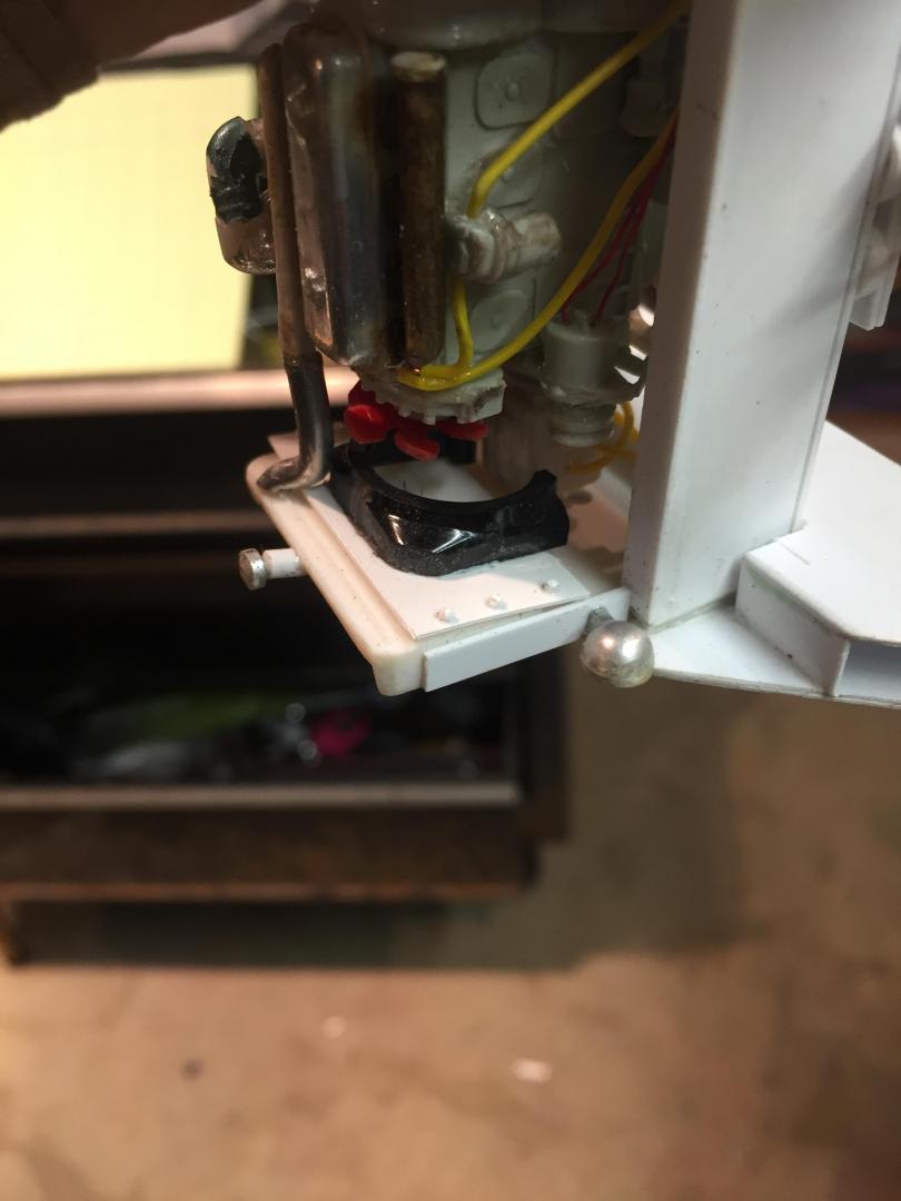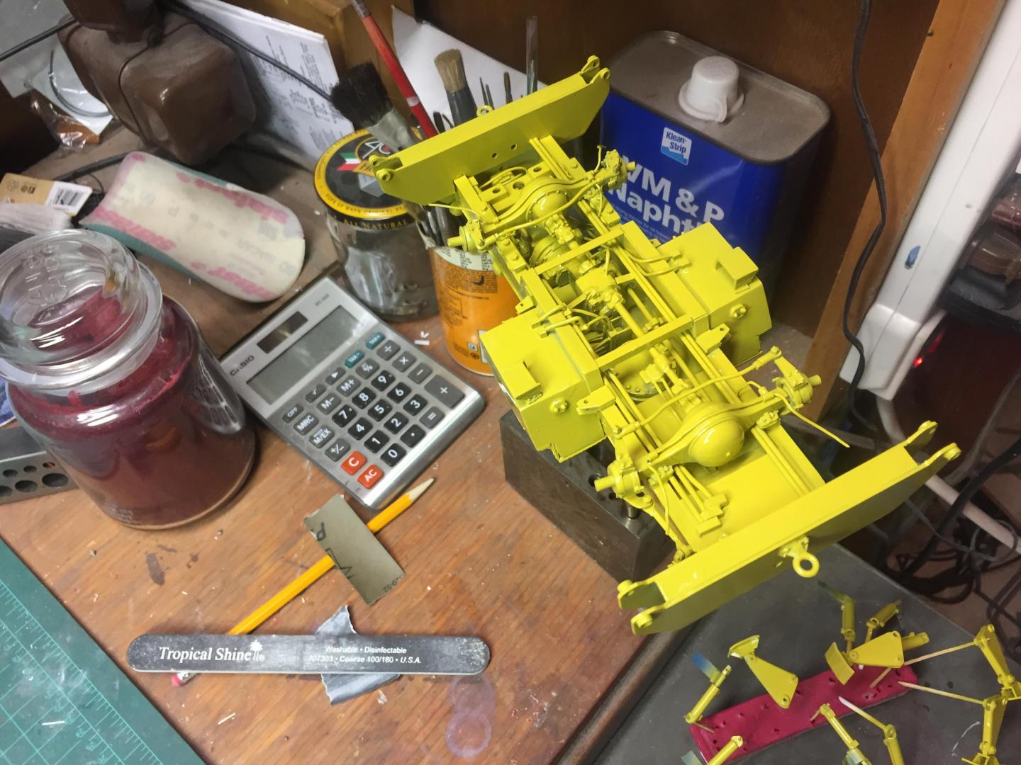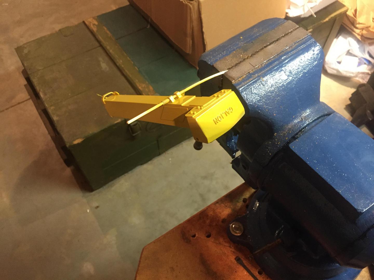 Spent some time adding details. Added grab handles to the cab, hinges and handles to the fuel tank and battery access lids, installed the engine, added fuel lines, coolant hoses, fan and shroud, radiator cap, air filter, door stops, mirror brackets, head and tail lights, made the exhaust system, (the muffler Is not hollow, but it's filled with a clear lucite rod to make it solid.....it just is an illusion), cable retainers on top of the boom, LOTS of nuts and bolt details to the axles, turntable, swing gearbox and everywhere else that looked naked, hook travel tie down, hydraulic and fuel tank drain covers, hydraulic fill cap, and a LOT done on the punch list! Getting VERY close to paint now! There will be a LOT of subassemblies to paint separately then a lot of assembly time but the light at the end of the tunnel is actually visible! Guess it's time to mix some Galion yellow paint!