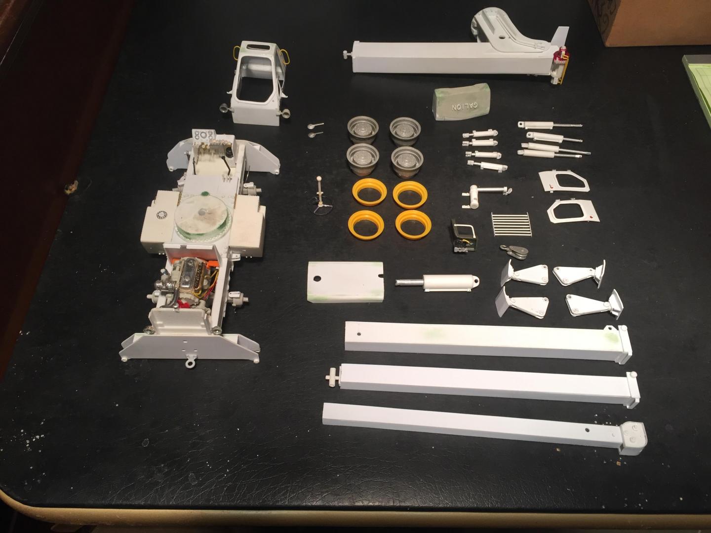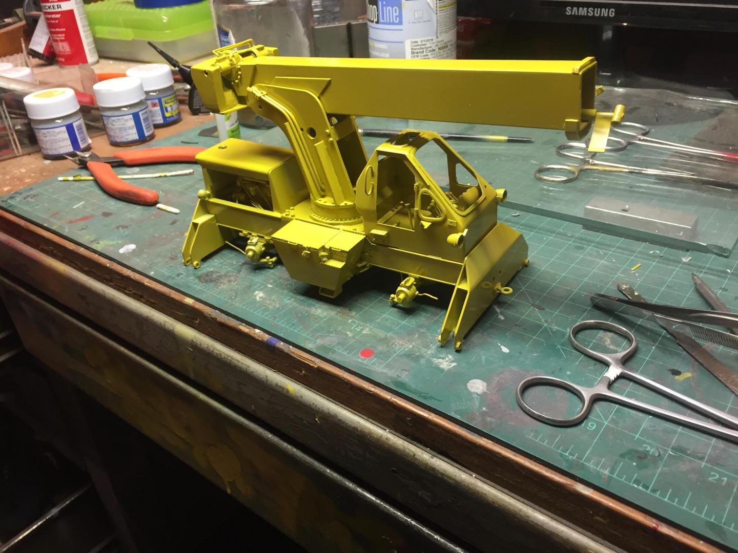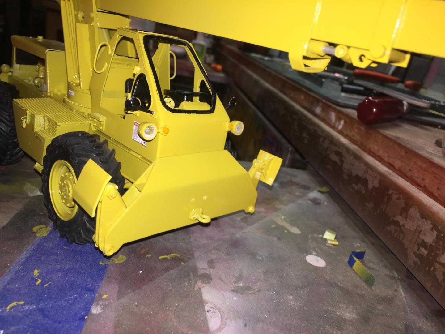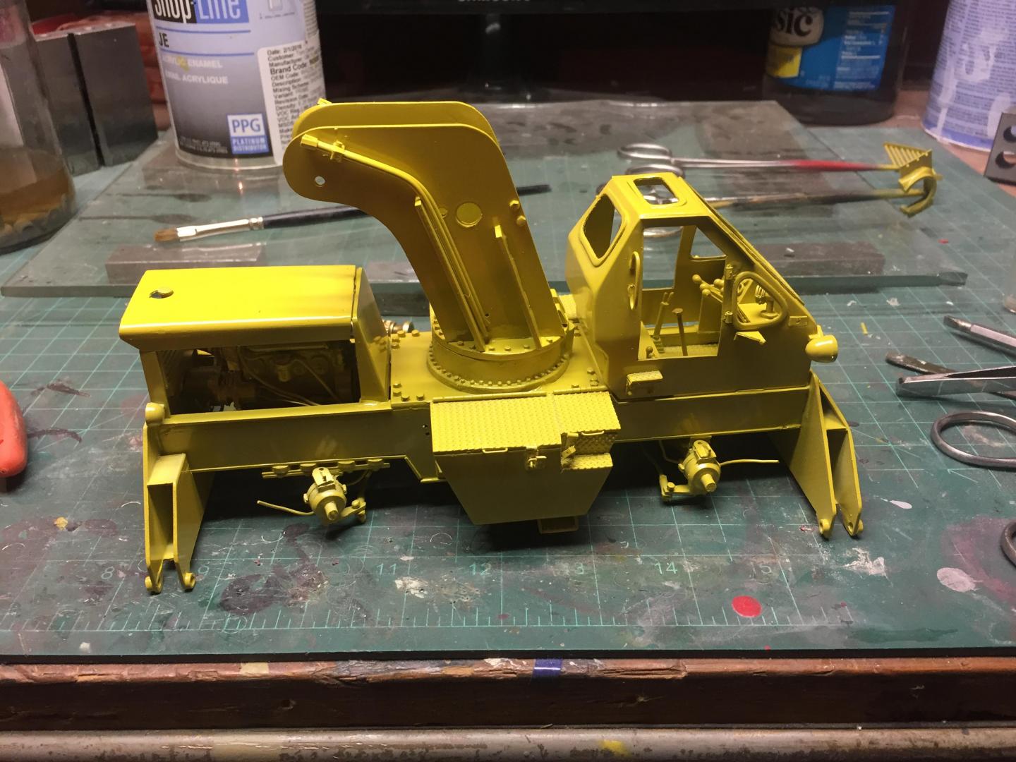 Got the lower chassis all done, exhaust installed, wheels and tires on, mirrors installed, head and tail lights installed, fan belt and fan shroud installed, decals all installed, boom sections assembled, and here is what it looks like so far. Still have glass to cut and install, doors to mount, boom hoses to attach, winch piping and cabling to do. Then some light weathering and she's done!