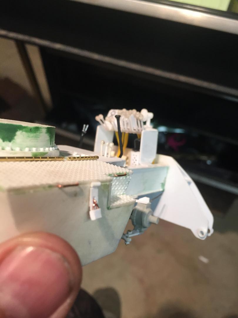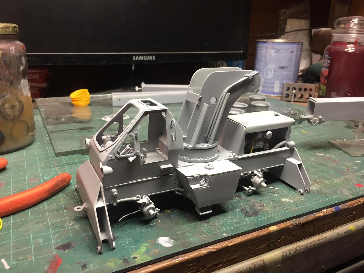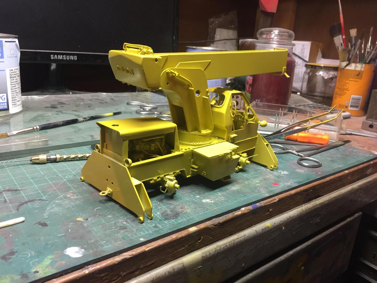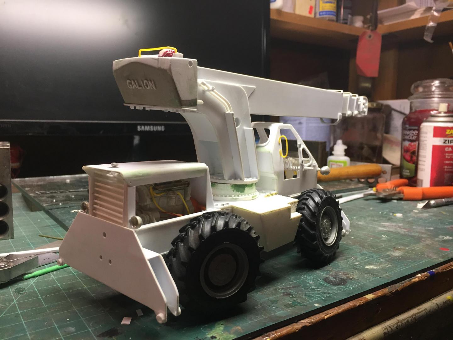 Got the lower chassis all done, exhaust installed, wheels and tires on, mirrors installed, head and tail lights installed, fan belt and fan shroud installed, decals all installed, boom sections assembled, and here is what it looks like so far. Still have glass to cut and install, doors to mount, boom hoses to attach, winch piping and cabling to do. Then some light weathering and she's done!