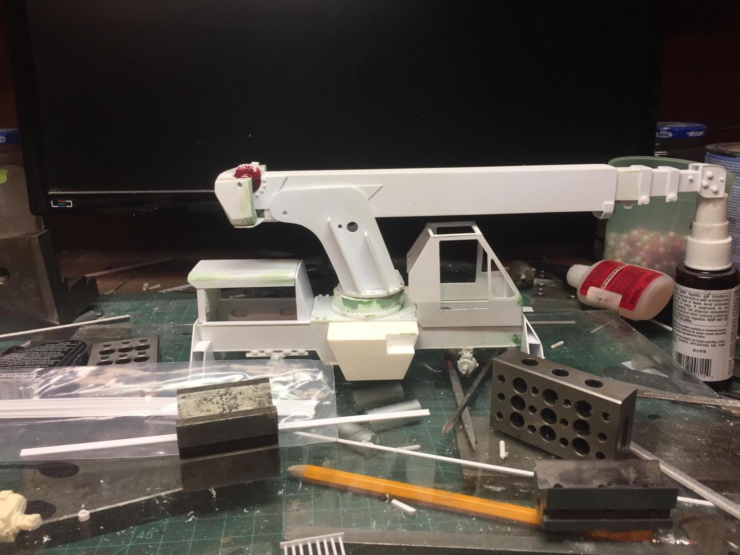 Well, this project has been going great, without my all too typical one step forward three in reverse technique. But, it is time for that now. I am not happy with the operator's cab in several aspects. Most of them can be lived with, but the rubber window gasket simply does not make me happy. So.........................I have scrapped the cab, and am going to start over on it. I tried half round Evergreen. The smaller size looks far better but is evil to try to make it work. The larger size was far easier to work with, but it looks like..................well, it does not please me! So, I have a few other ideas to try, and will be not only making a new cab to fix the other problems it has, but will be hopefully finding a method to do the gaskets that looks better! I am also considering telling the crane operator to stock up on long johns and mittens, and foregoing the cab.......................! I am sure he would file a grievance with the union though!