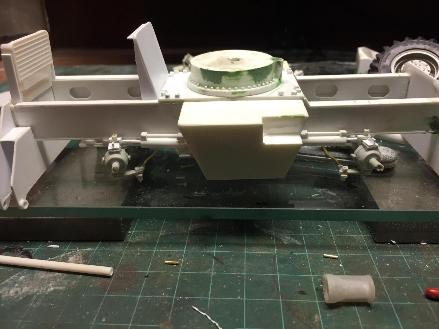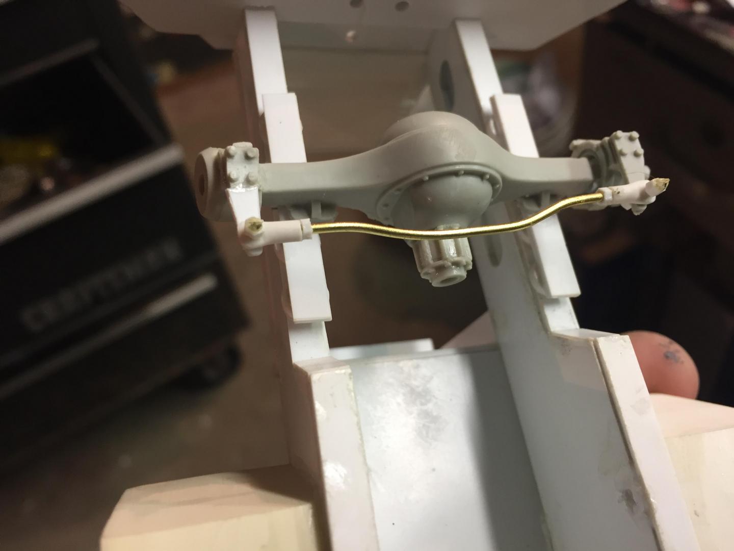 I drilled the cast in knuckles out with a regular drill bit, deep enough to accept a new ball. I then found a package of plastic craft beads at Walmart. These already have a hole drilled through them. I simply drilled another hole at 90 degrees to the existing hole, but only until it intersected the original hole, not all the way through. Then it was simply a matter of orienting the ball in the knuckle with the original hole vertical with the pivot point of the knuckle and drilling a hole in the top and bottom of the knuckle to line up with the hole in the ball. I then glued the ball to the metal rod in the end of the axle housing using the hole I drilled part way through. Then I installed the knuckle and pressed a styrene rod into the top down through the ball and through the bottom of the knuckle. Made a pretty good and extremely easily done working approximation of the real deal!