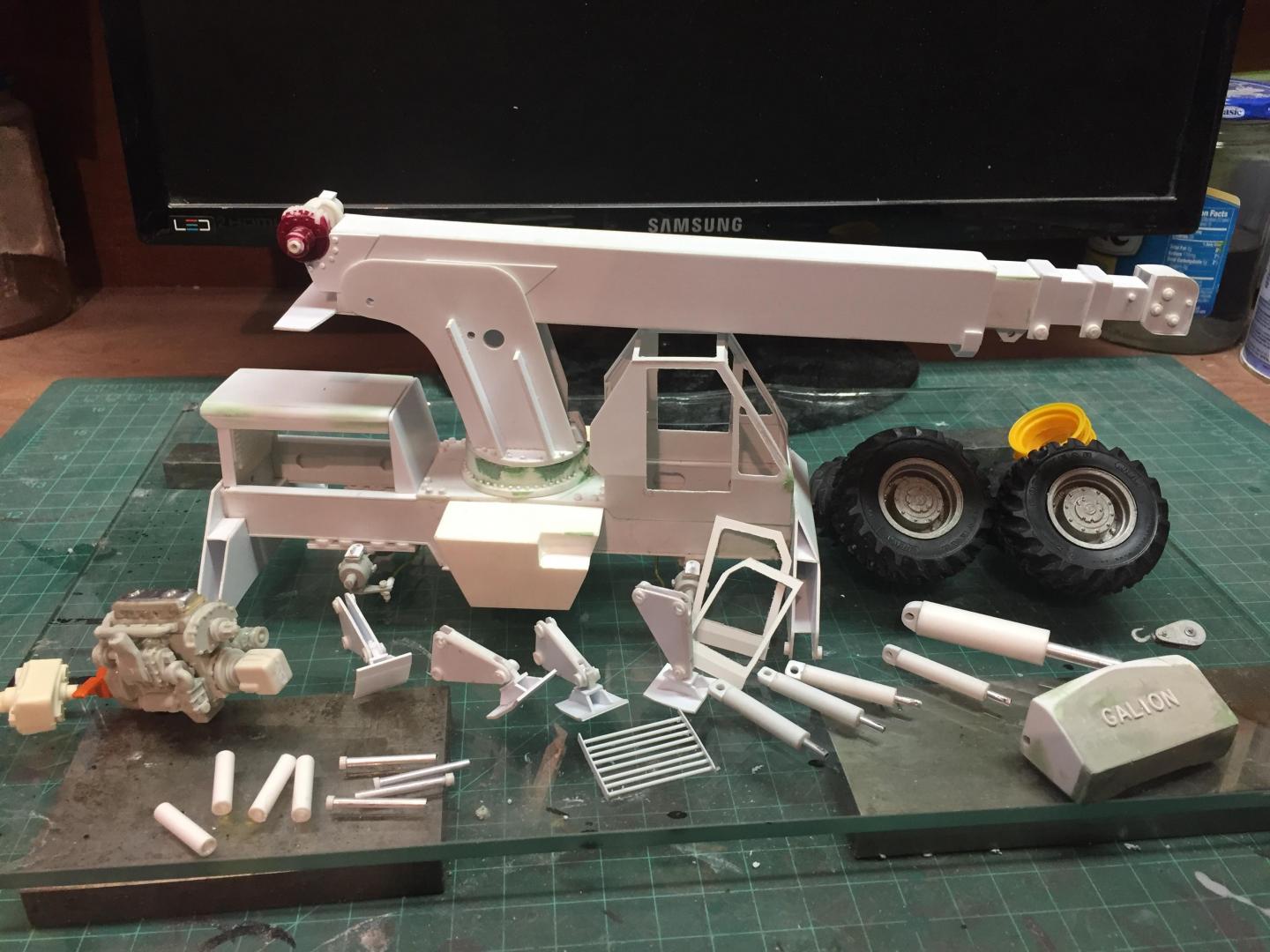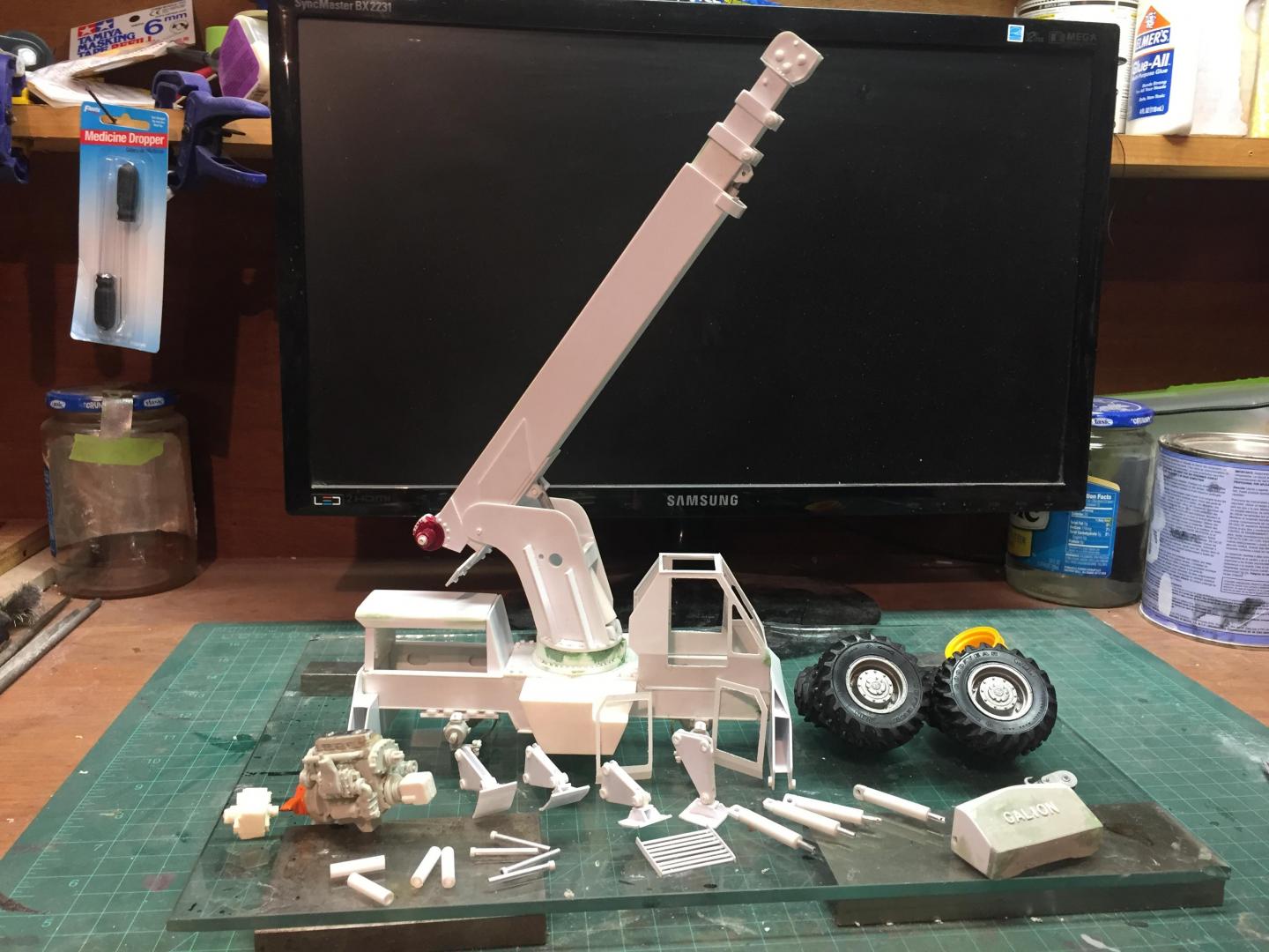 Worked on the outriggers tonight. Got all four of them made up with the pivot bushings and made the pads as well with the pivot bearings and caps and bolts holding them together. Did a mockup of one of them to see how it works. Just need to make the cylinders now. Also installed the winch and the bolts holding it in place. Put the bolts on the turntable support and the boom support too. Also installed the bolts that attach the counterweight. The counterweight won't be installed until after all of the piping is done. The painting on this build will be done in many subassemblies and then assembled because of the complexity. Really is an adventure! Starting to look like something!