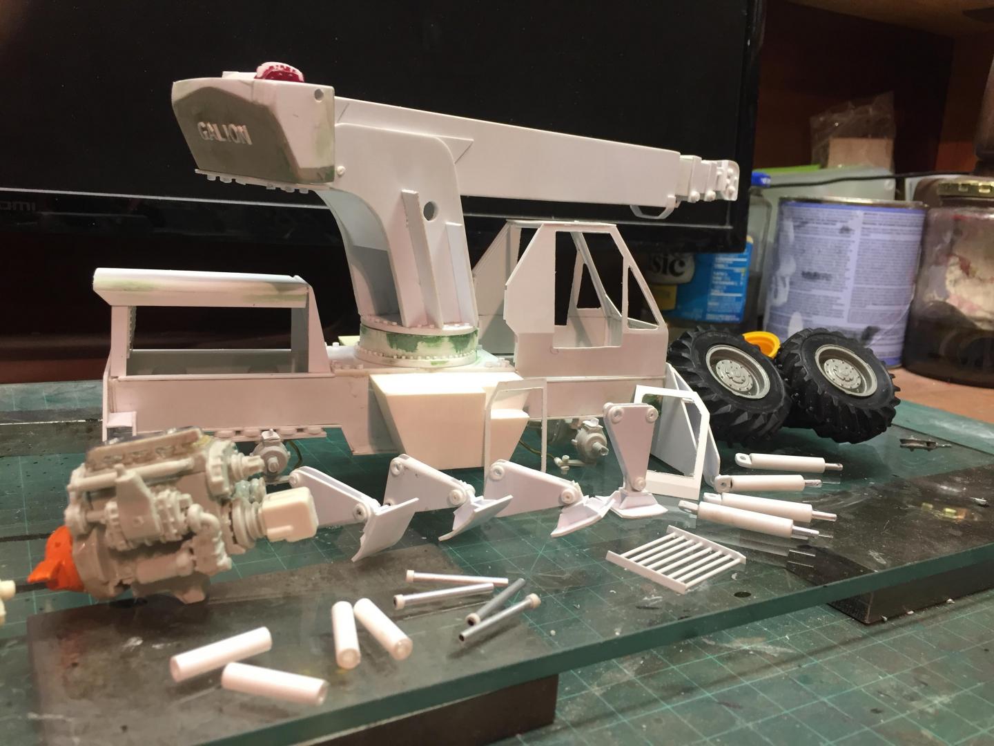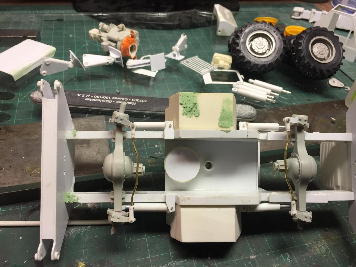 Made up the tie rods and installed them so the steering works. Added the steering arms for the hydraulic steering cylinders and installed them to the knuckles. Made up the parts for the four steering cylinders. Little tiny things but a huge step in the build. After the cylinders dry, they will be assembled and installed to each knuckle. Also shown here are all of the subassemblies and pieces so far, AFTER a major bench cleaning, as it got so bad I couldn't even see the bench! Next to be done after the steering cylinders, will be the operator's station, controls, and the rest of the cab, and the rest of the frame with the torque converter and drive shafts. And............THEN the detailing..............which will most likely be more work than has been spent so far!