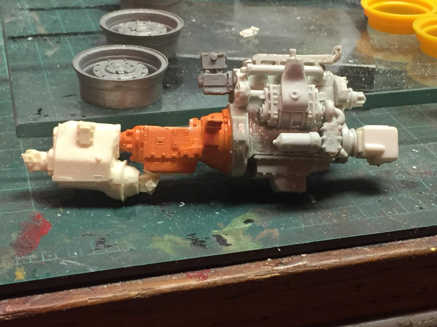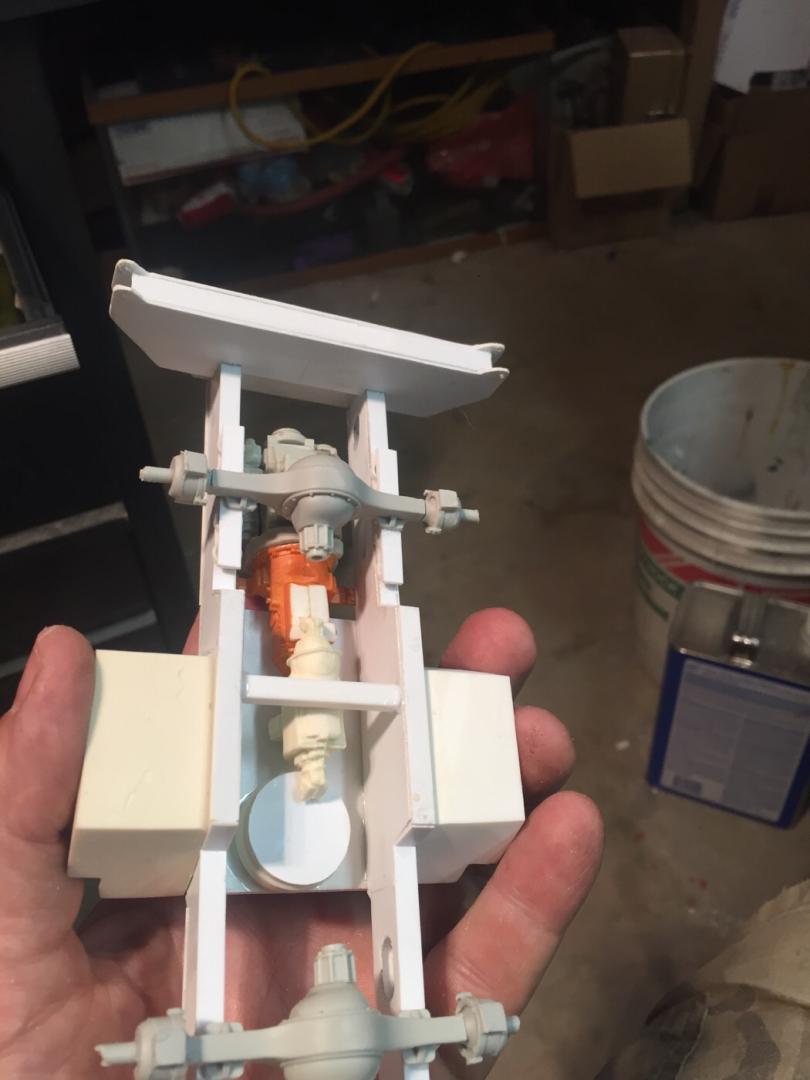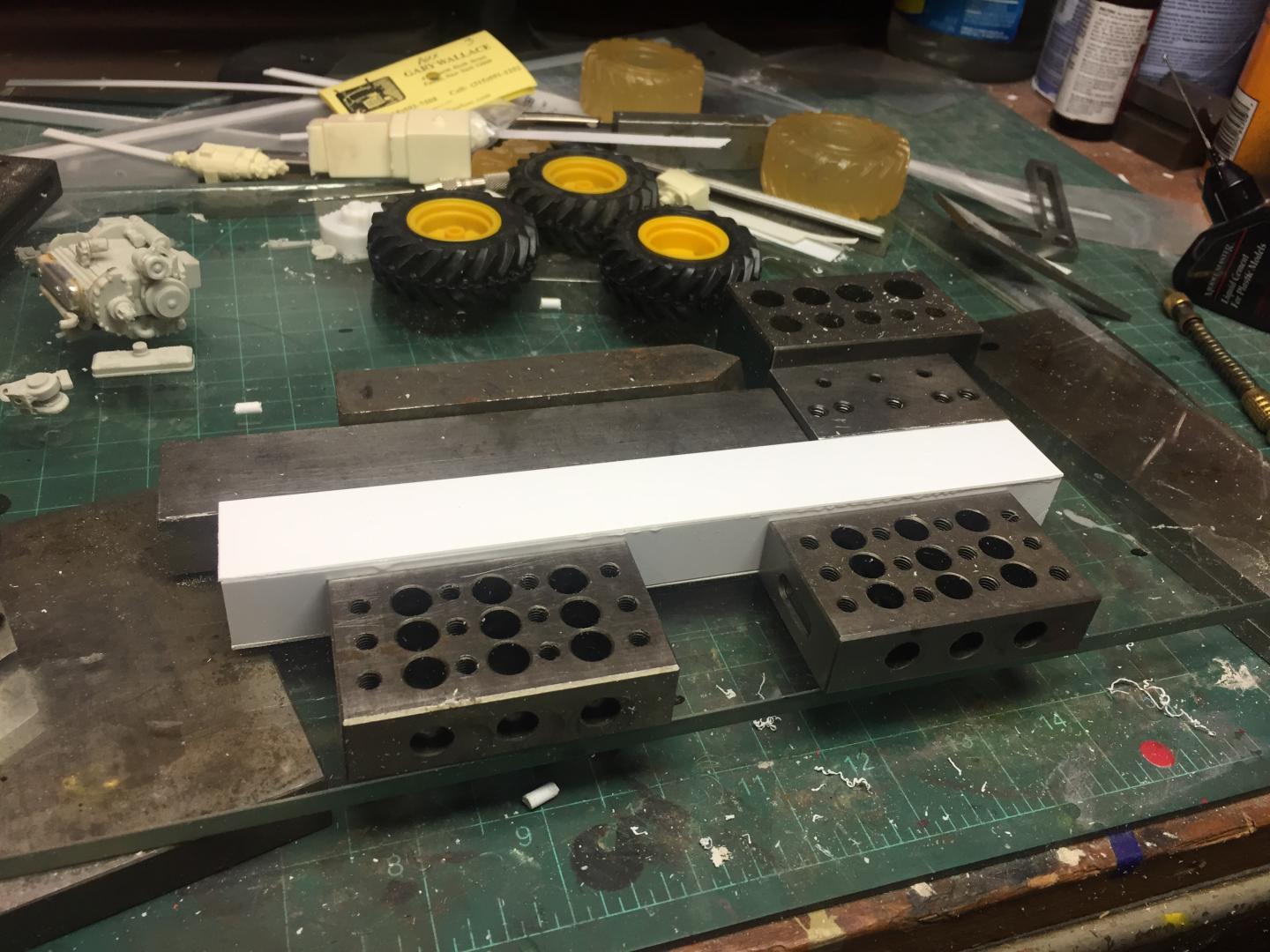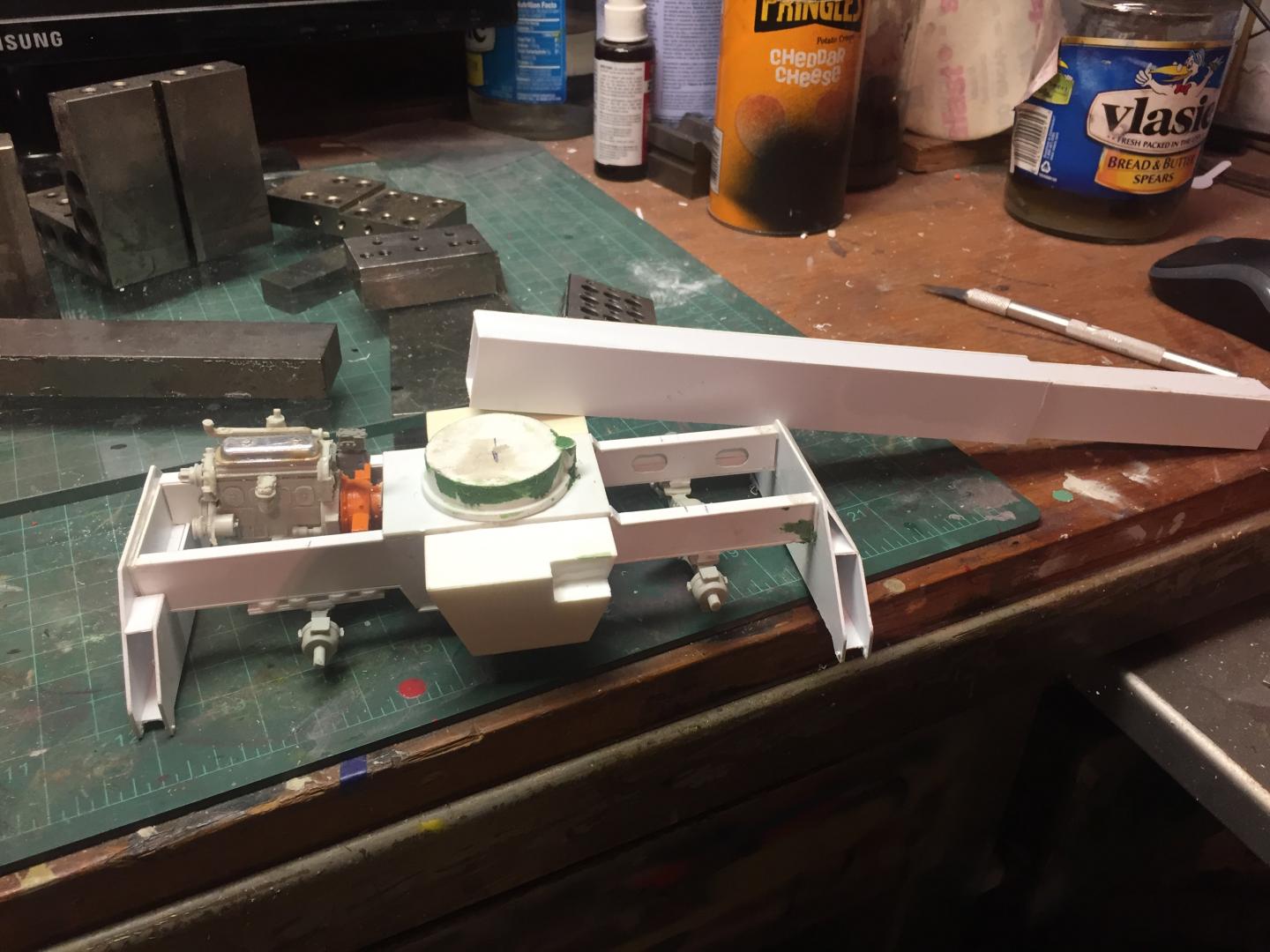 Realized I made the extension boom too big...... it is supposed to be shallower to allow room for the extension cylinder which mounts beneath it. So, cut it down to fit. That's what I get when I build after midnight trying to find time to build. Tried something new to cut long straight pieces of styrene......a paper guillotine. Works great. This is a light duty one that I figured I'd try but will definitely be getting a heavier duty one. Got the hydraulic pump mounted on the front of the engine too. Also put together some proper wheels for it.
