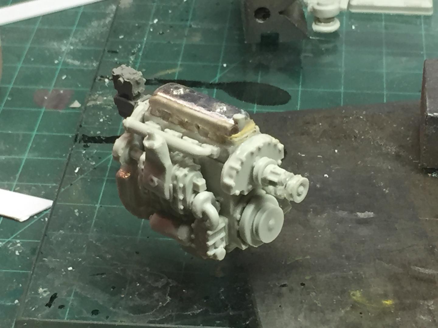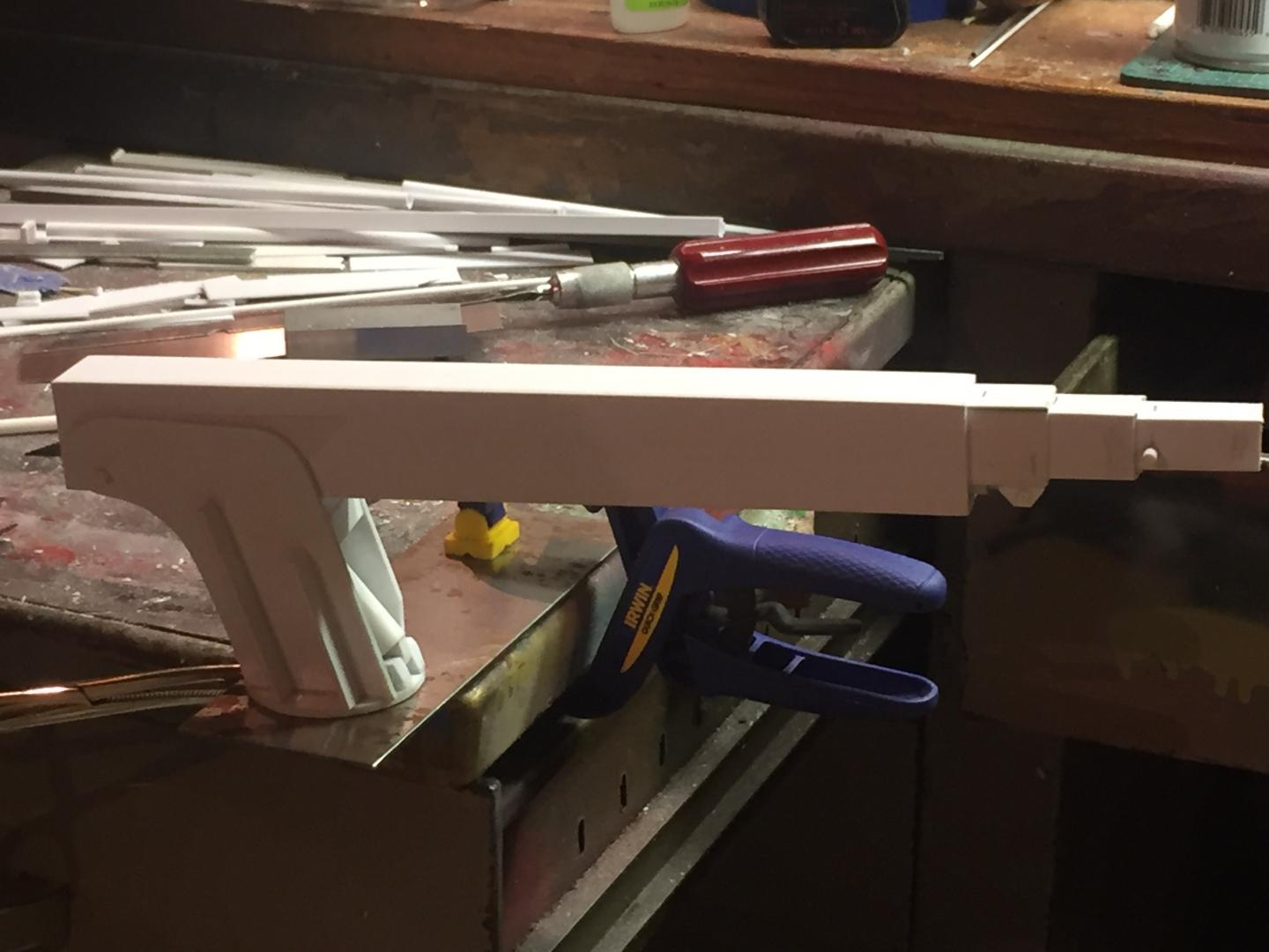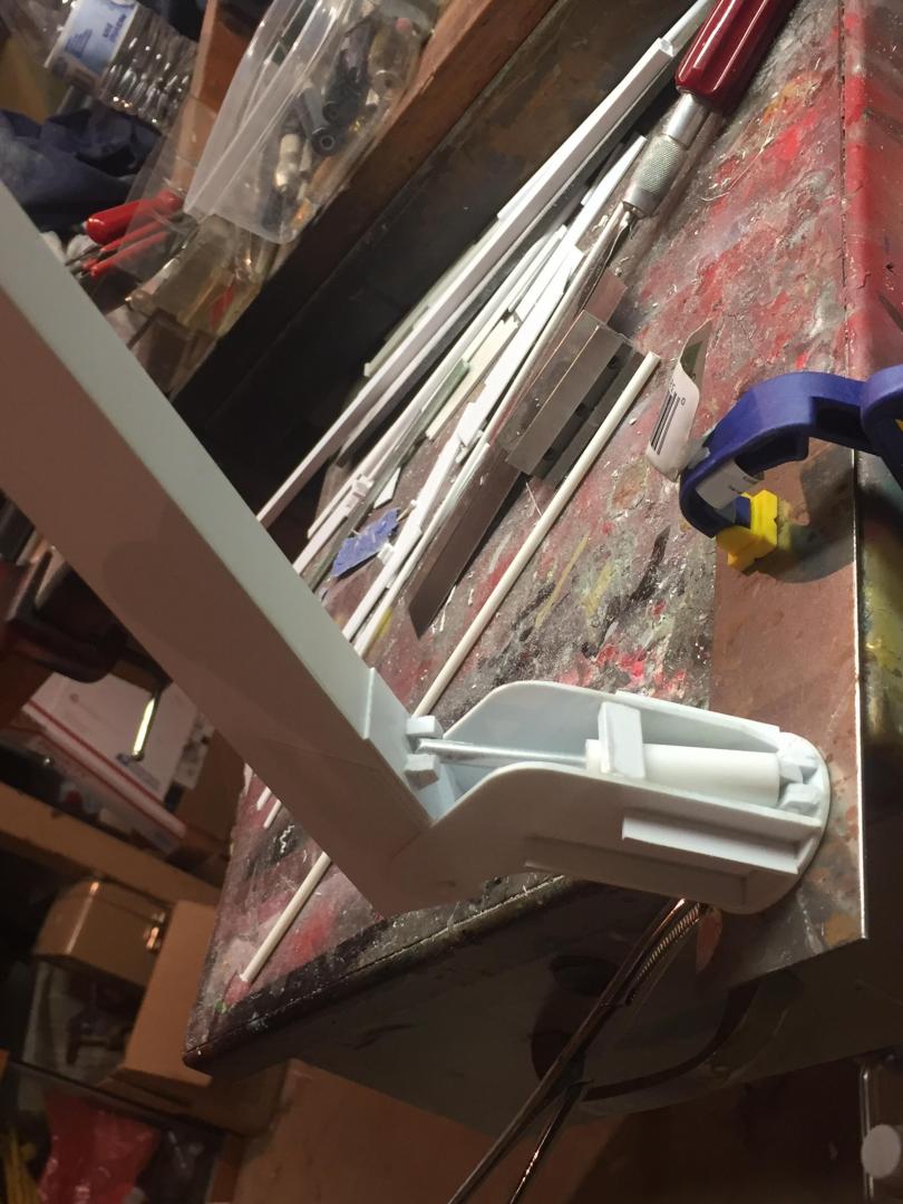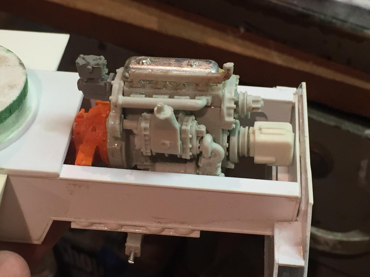 Realized I made the extension boom too big...... it is supposed to be shallower to allow room for the extension cylinder which mounts beneath it. So, cut it down to fit. That's what I get when I build after midnight trying to find time to build. Tried something new to cut long straight pieces of styrene......a paper guillotine. Works great. This is a light duty one that I figured I'd try but will definitely be getting a heavier duty one. Got the hydraulic pump mounted on the front of the engine too. Also put together some proper wheels for it.