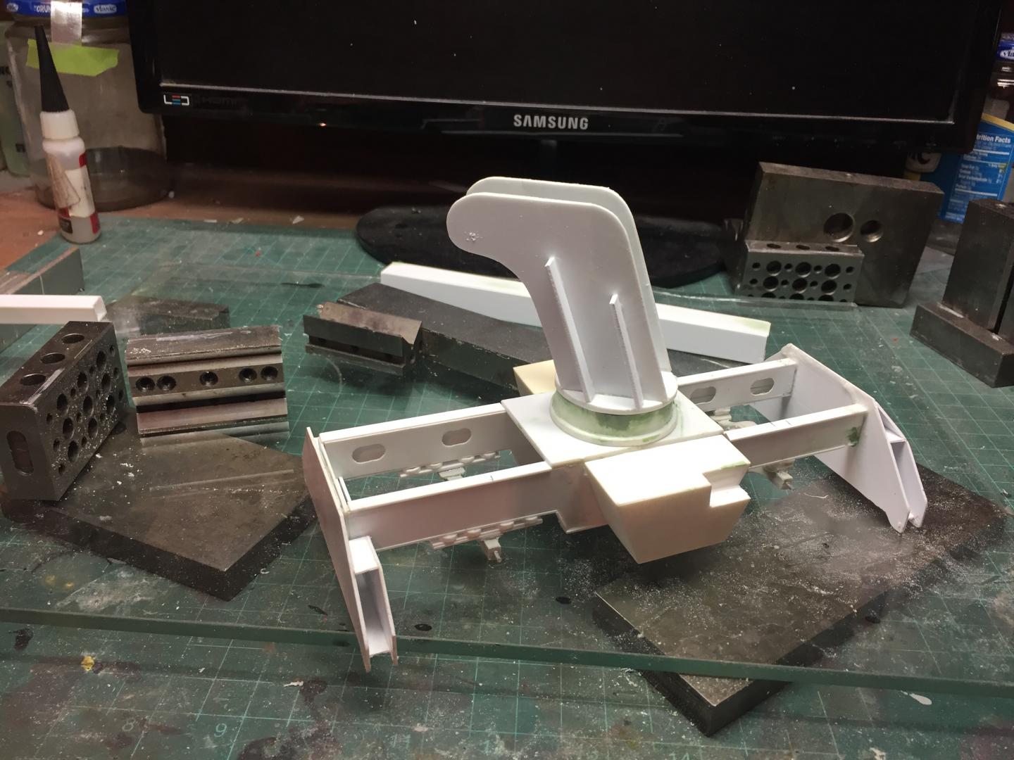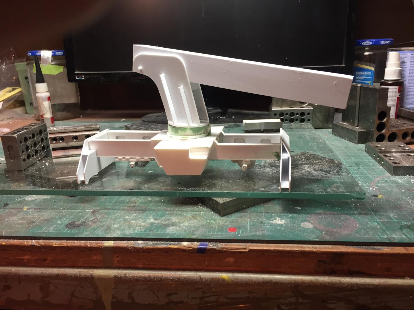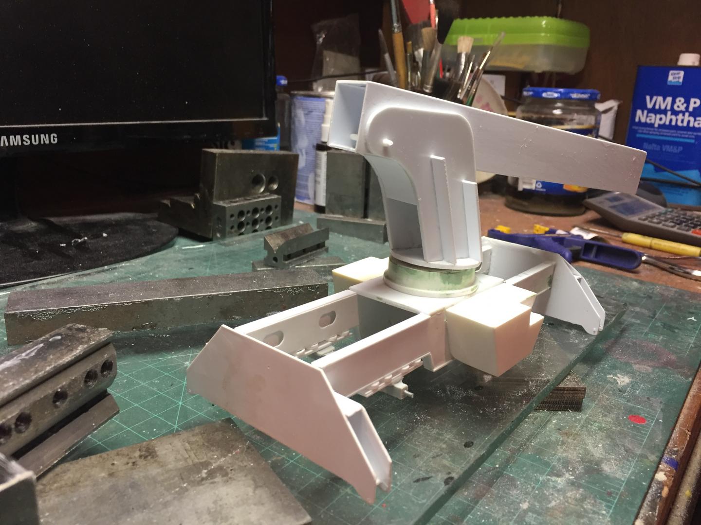 Just started the counterweight. Since it is a very heavy casting, I started by laminating several pieces of .080 styrene together which will then all be glued together and then shaped as needed. Also put the winch together which will have a mount made for it to mount inside the counterweight against the back of the main boom. Seems like it's never going to end, but, for as much fun this kind of build is, that would not be a bad thing!