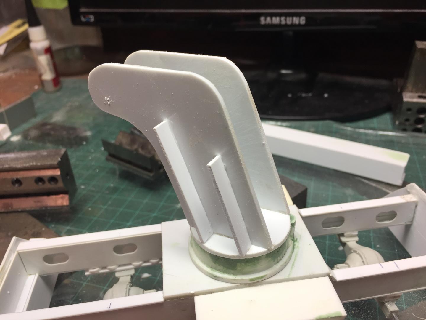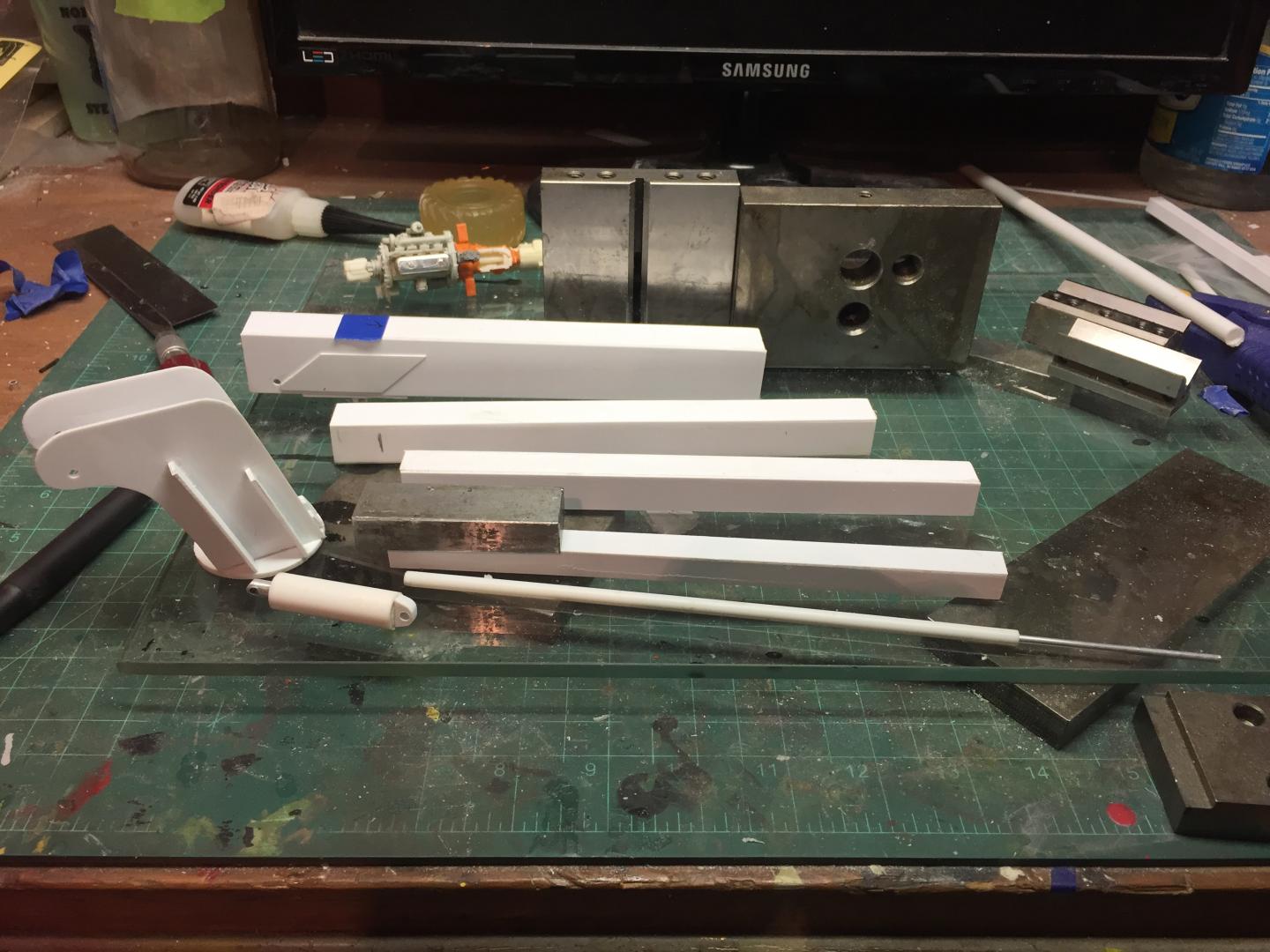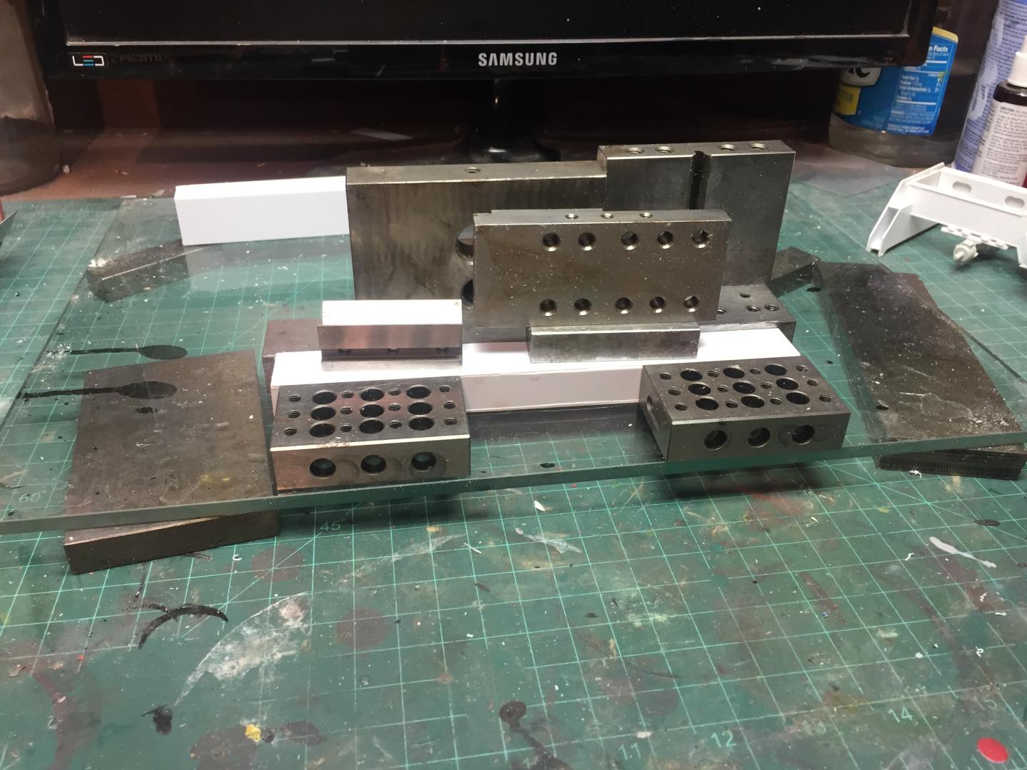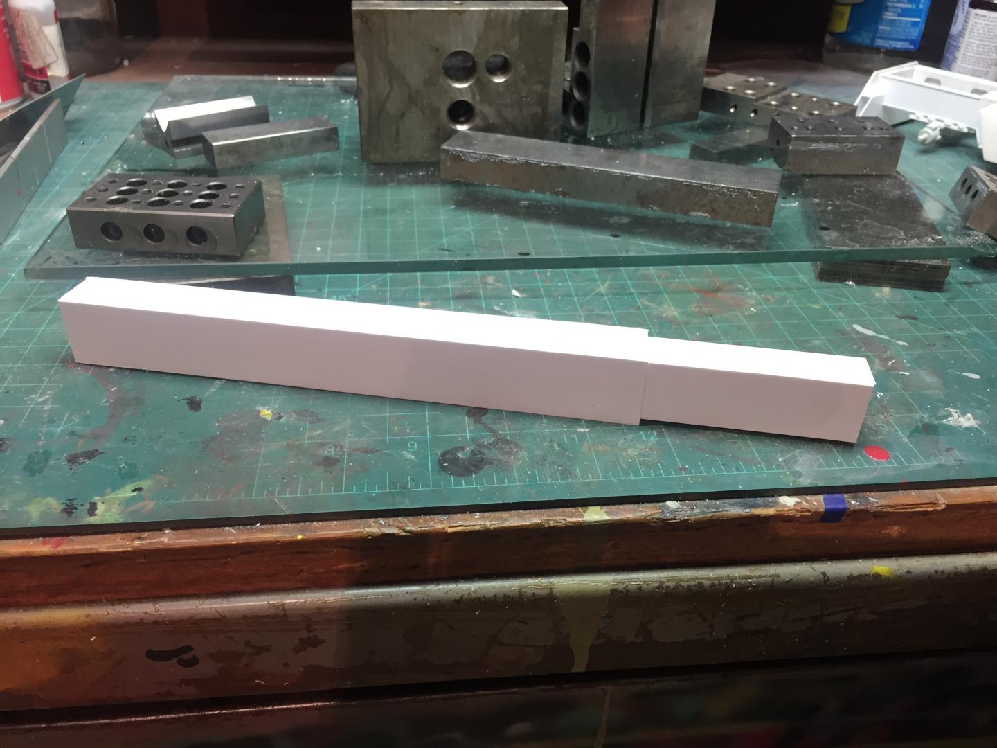 Just started the counterweight. Since it is a very heavy casting, I started by laminating several pieces of .080 styrene together which will then all be glued together and then shaped as needed. Also put the winch together which will have a mount made for it to mount inside the counterweight against the back of the main boom. Seems like it's never going to end, but, for as much fun this kind of build is, that would not be a bad thing!