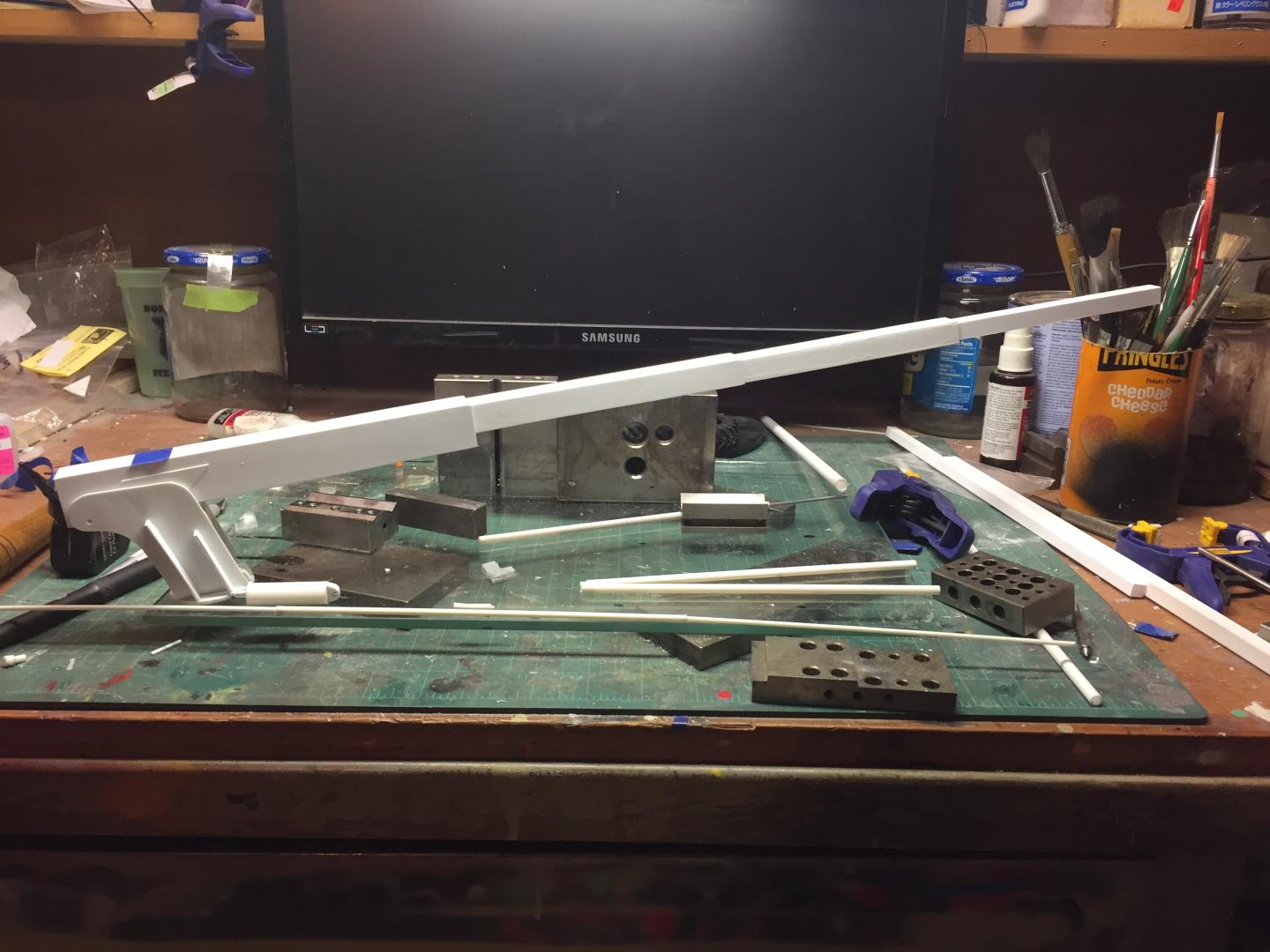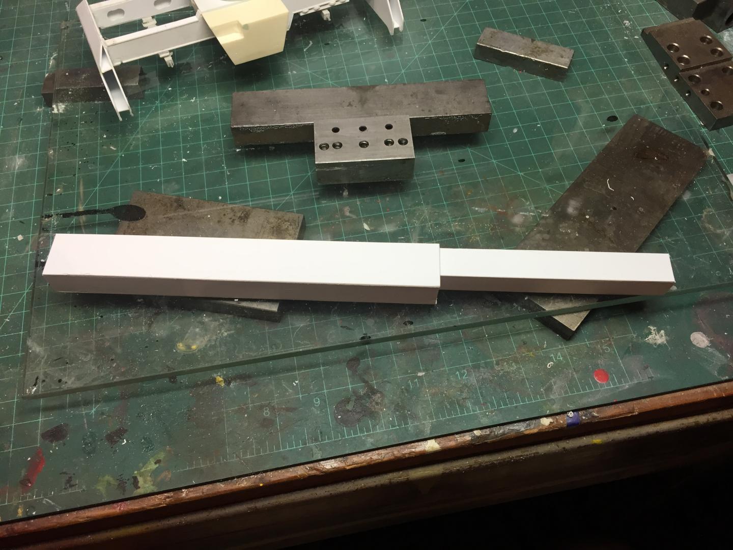 Tonight I built the double extension cylinders, which are two cylinders bolted together side by side, actually one over the top of the other, with one pointing one way and one pointing the other way. They are then attached inside the third boom section, bolted to the inside of the end of the boom closest to the turntable. The rod at that end is attached inside the end of the second section closest to the turntable. The other end is attached inside the end of the fourth section at the end furthest from the turntable. The fourth section then telescopes into the third, over the double cylinders. The two cylinders extend the third section out of the second and the fourth out of the third. I also installed the primary extension cylinder inside the main boom beneath section two. In the actual crane, the hydraulics are valves so the three cylinders extend at the same time, extending the boom progressively at each section. Was a bit of styrene engineering to get it done but it works perfectly! The way this is put together it cannot extend apart as the cylinder travel keeps each section in the correct relationship to the previous and the next. Still have to build the winch box and the counterweight but this was a major step forward!