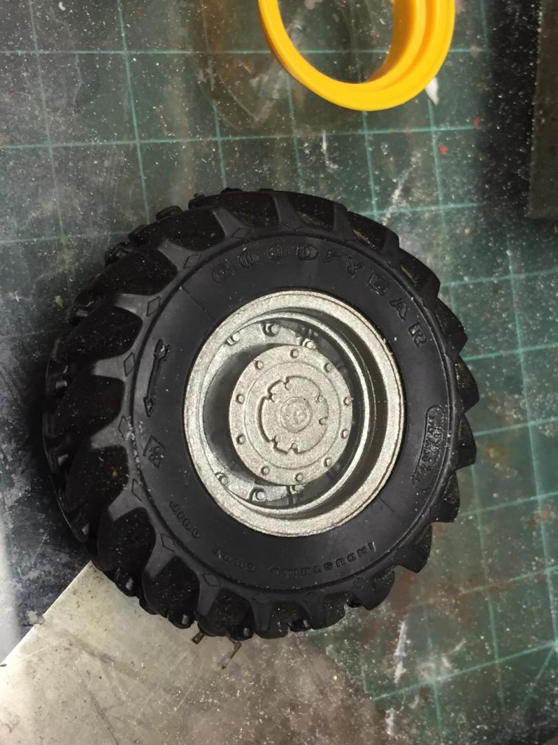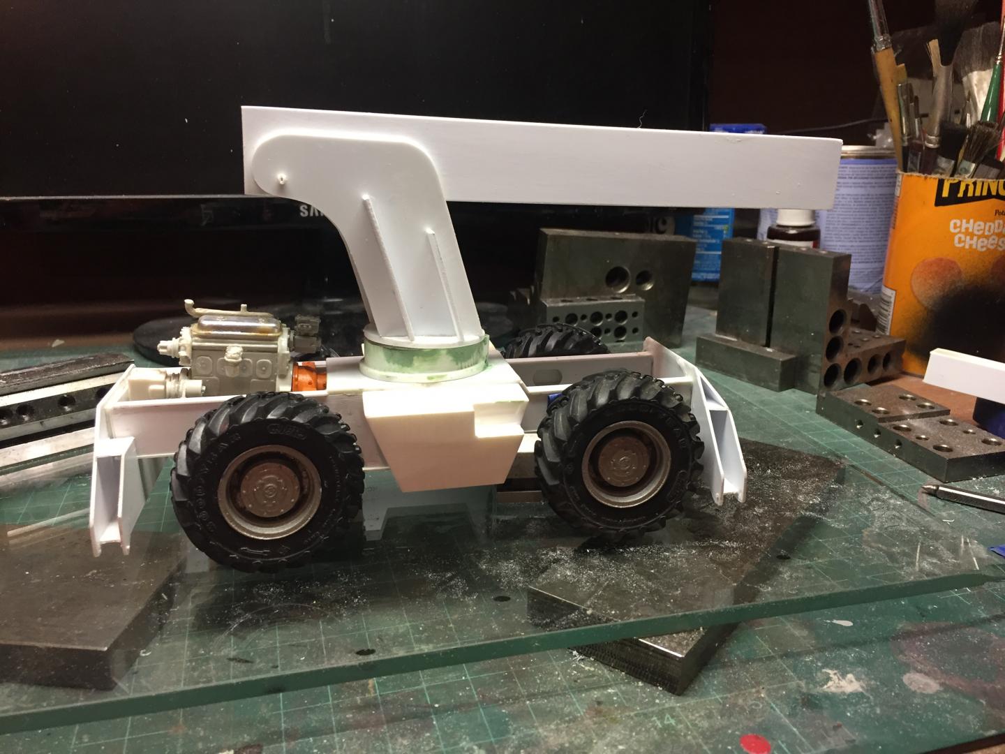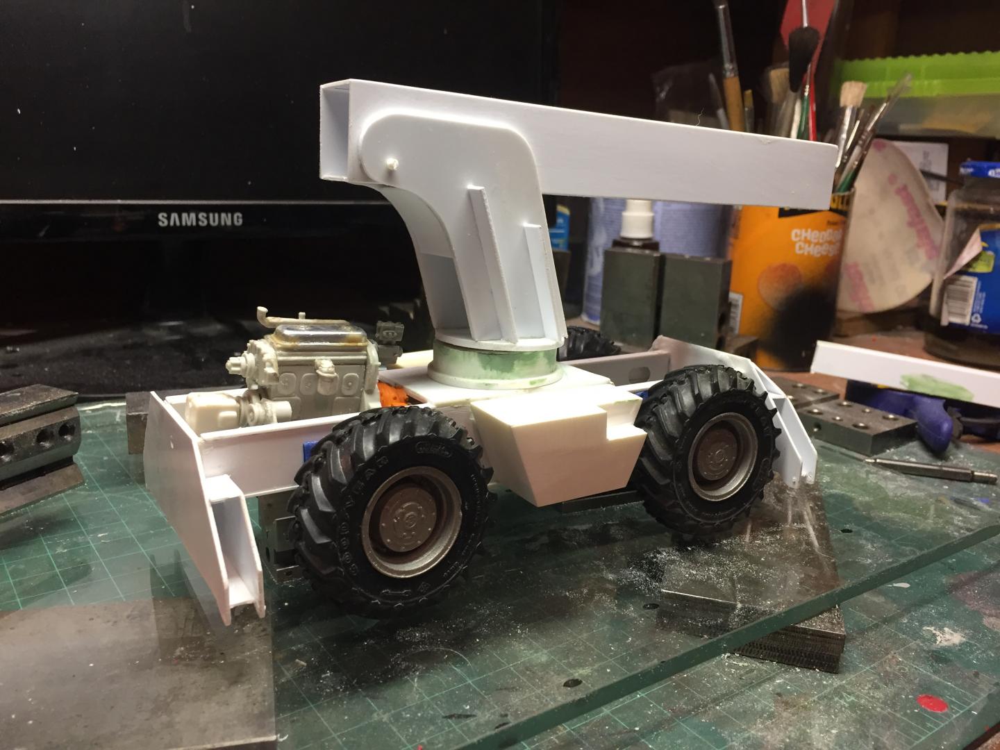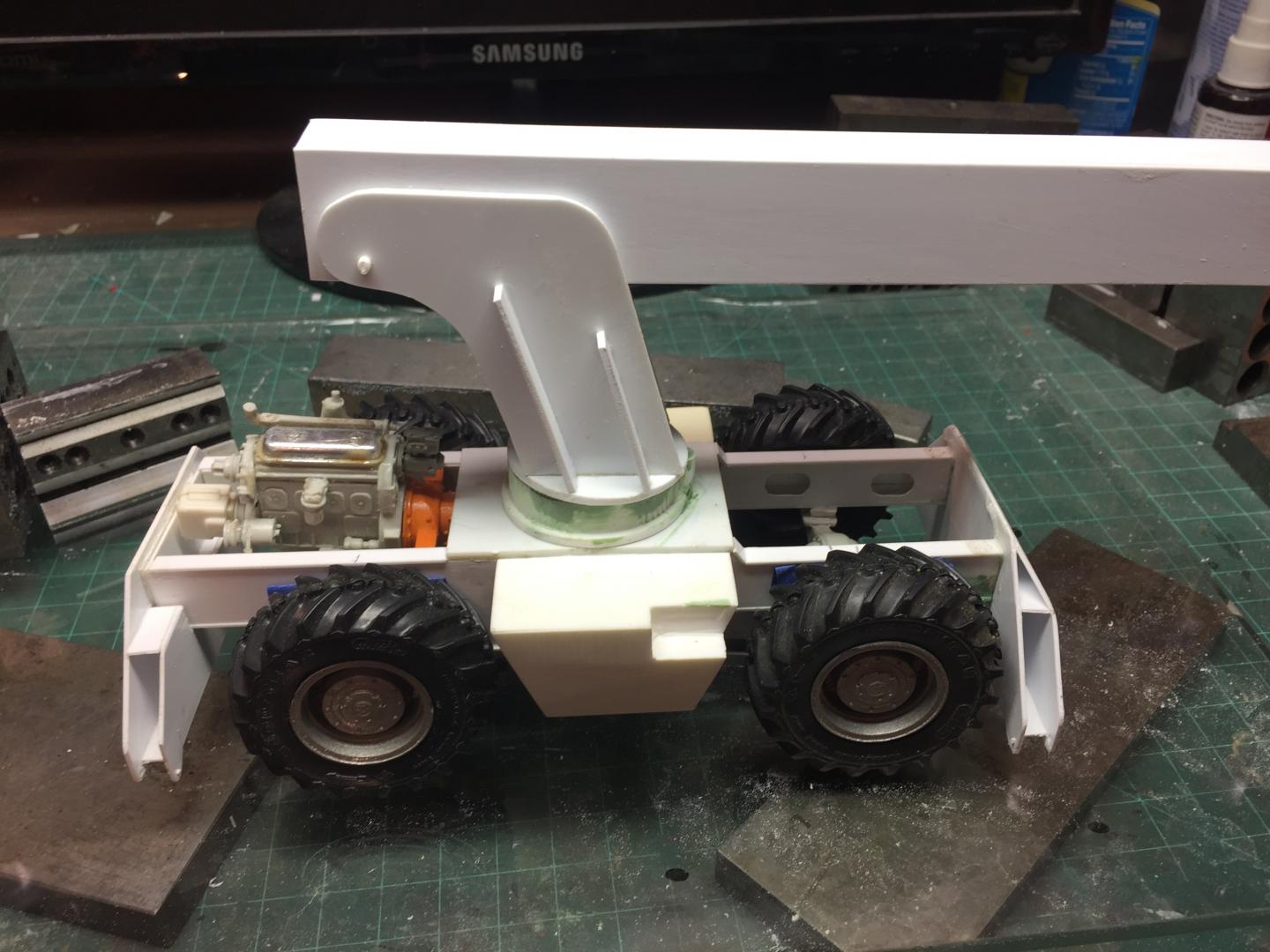 Got a couple of hours today to cut some styrene....................made the front and rear outrigger structures, did some body work on the turntable, got the left side tank/toolbox made and installed, and made the front and rear axle mounts. The rear is a rubber block type, while the front is a solid mount. Attached the two drive axles, and did a quick mock-up with the tires and wheels as shown. Still have to make drive hubs for the wheels, but it is starting to get "the look". I will be attacking the boom assembly next, and then all of the hydraulic cylinders for the boom, steering and outriggers. Thanks for stopping by!