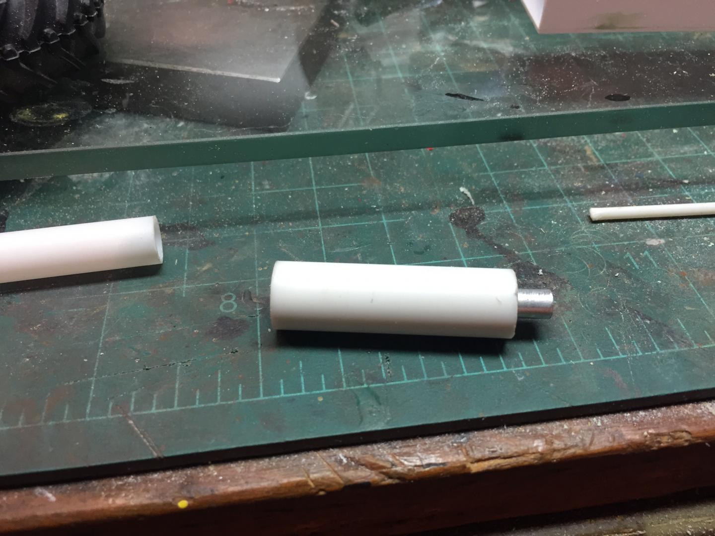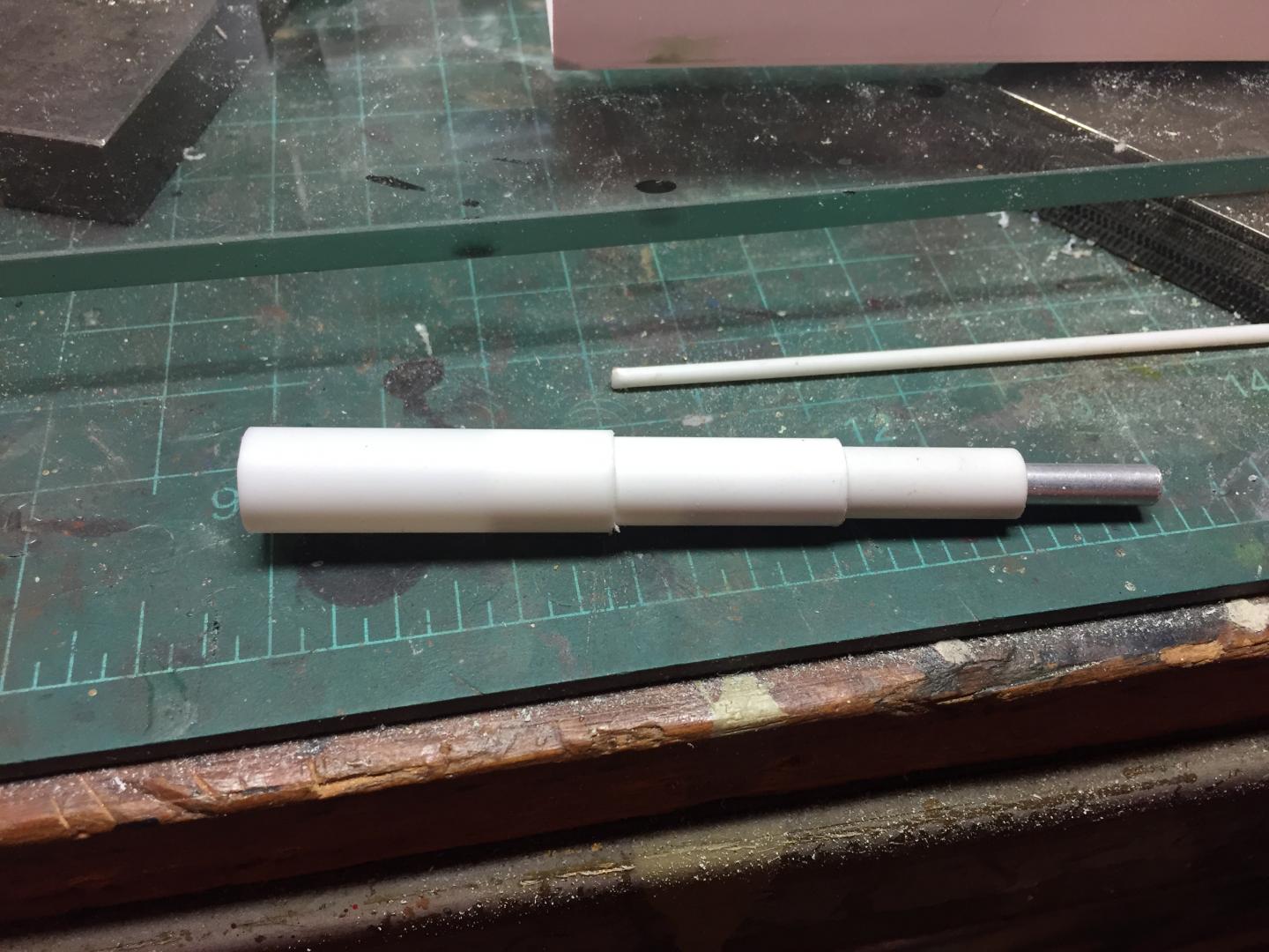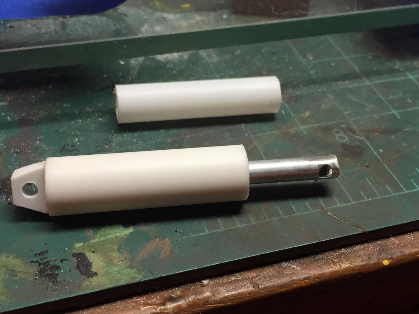 Made up the main boom lift cylinder today. I make my cylinders by using several different sizes of tube that telescope together along with an aluminum tube for the piston rod. I take the outer tube, make a shallow sleeve as the rod end cap, make a base end cap from several shallow slices of tube and rod slid into each other. The rod has a piston glued on its end and is slid into the body tube before gluing the base in. Then I slid two larger tubes over the whole thing to make the main cylinder body larger. This works pretty well and works for multiple stage telescoping cylinders as well.