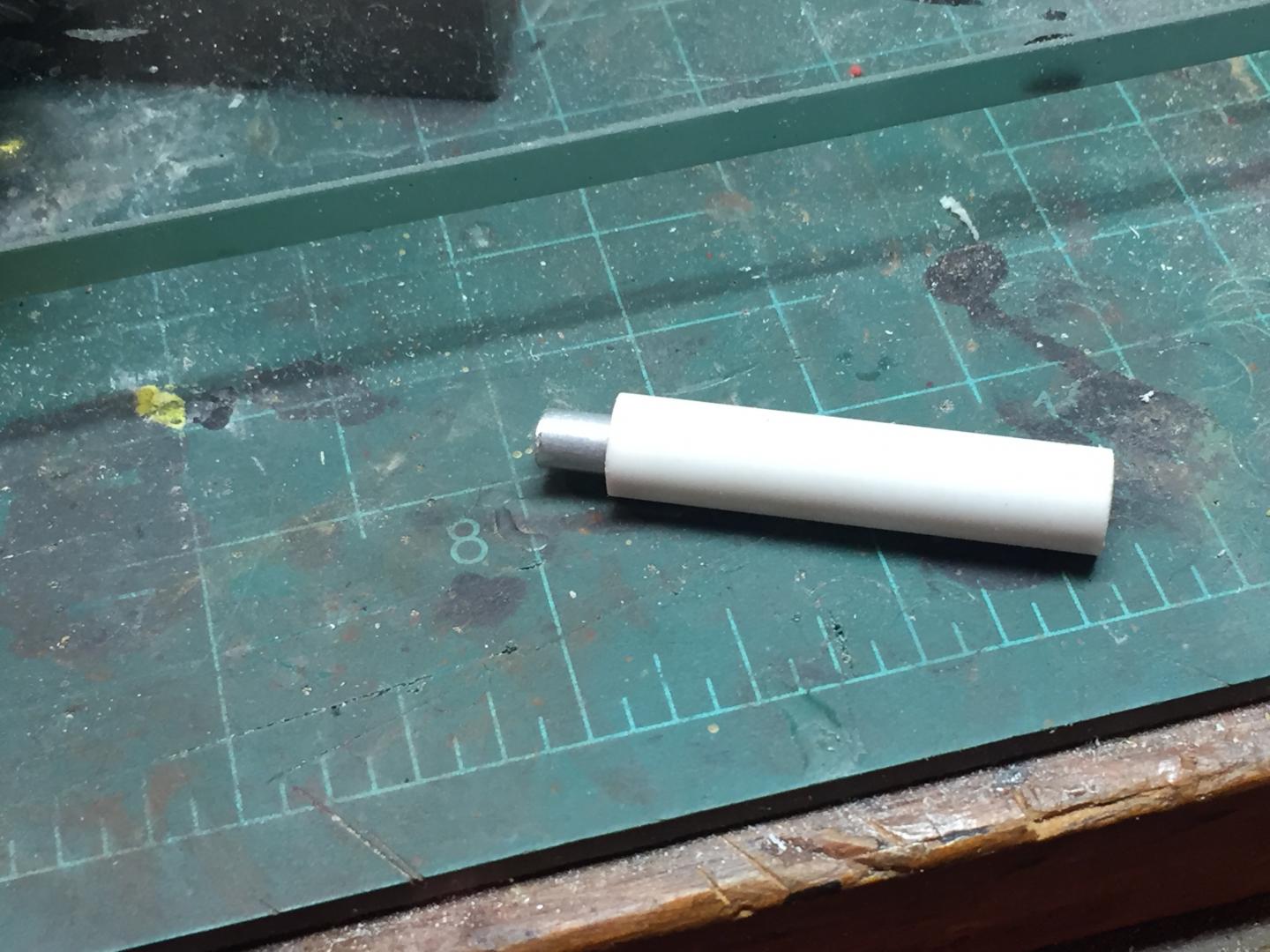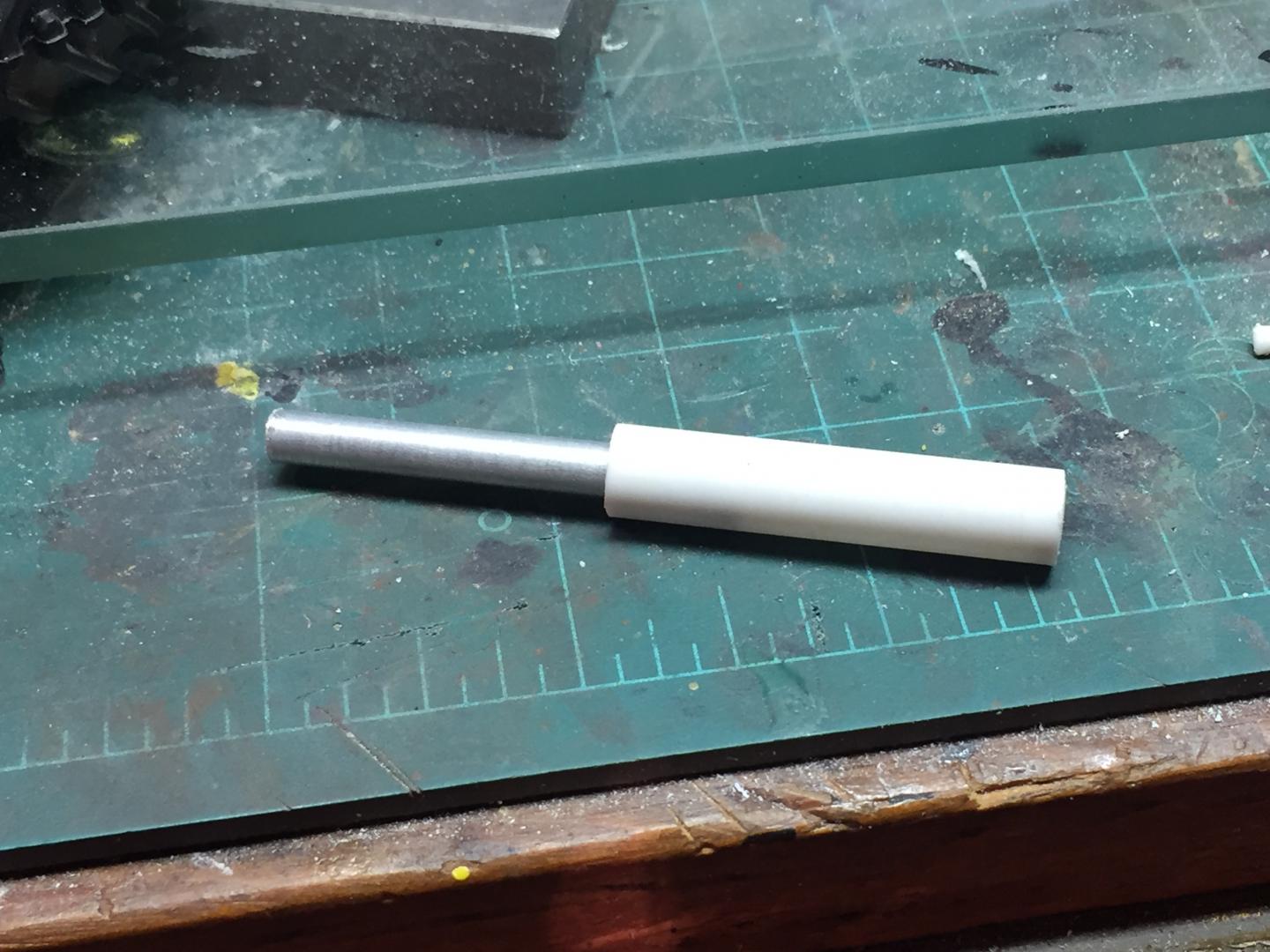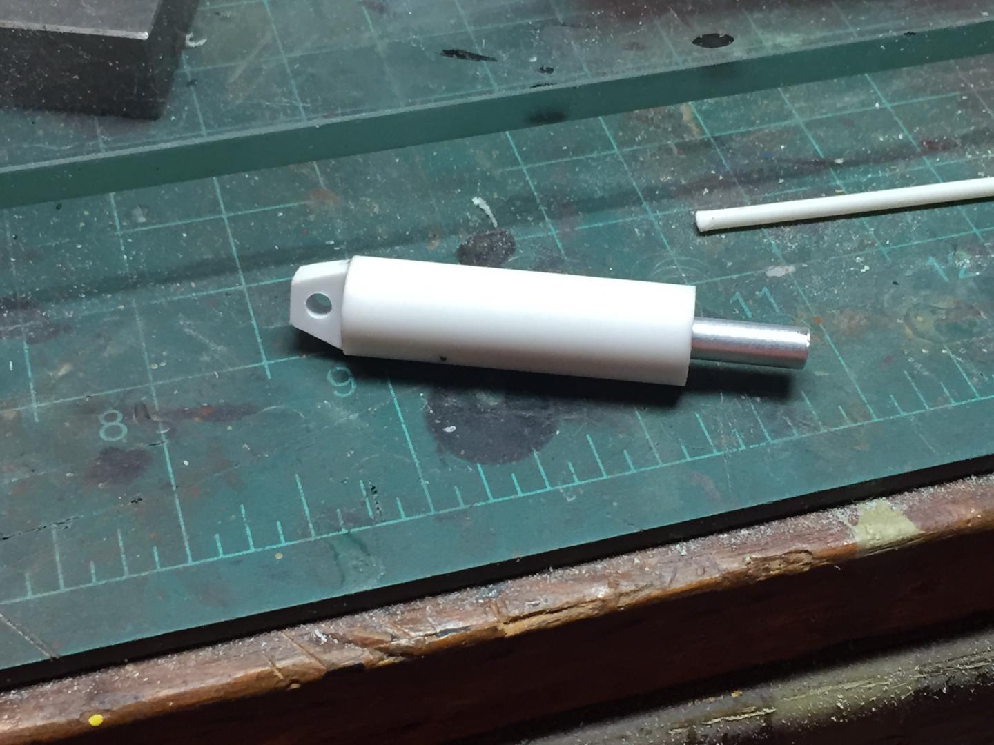 Made up the main boom lift cylinder today. I make my cylinders by using several different sizes of tube that telescope together along with an aluminum tube for the piston rod. I take the outer tube, make a shallow sleeve as the rod end cap, make a base end cap from several shallow slices of tube and rod slid into each other. The rod has a piston glued on its end and is slid into the body tube before gluing the base in. Then I slid two larger tubes over the whole thing to make the main cylinder body larger. This works pretty well and works for multiple stage telescoping cylinders as well.