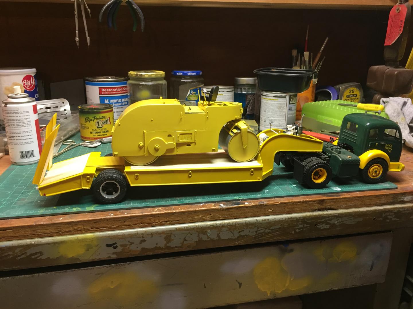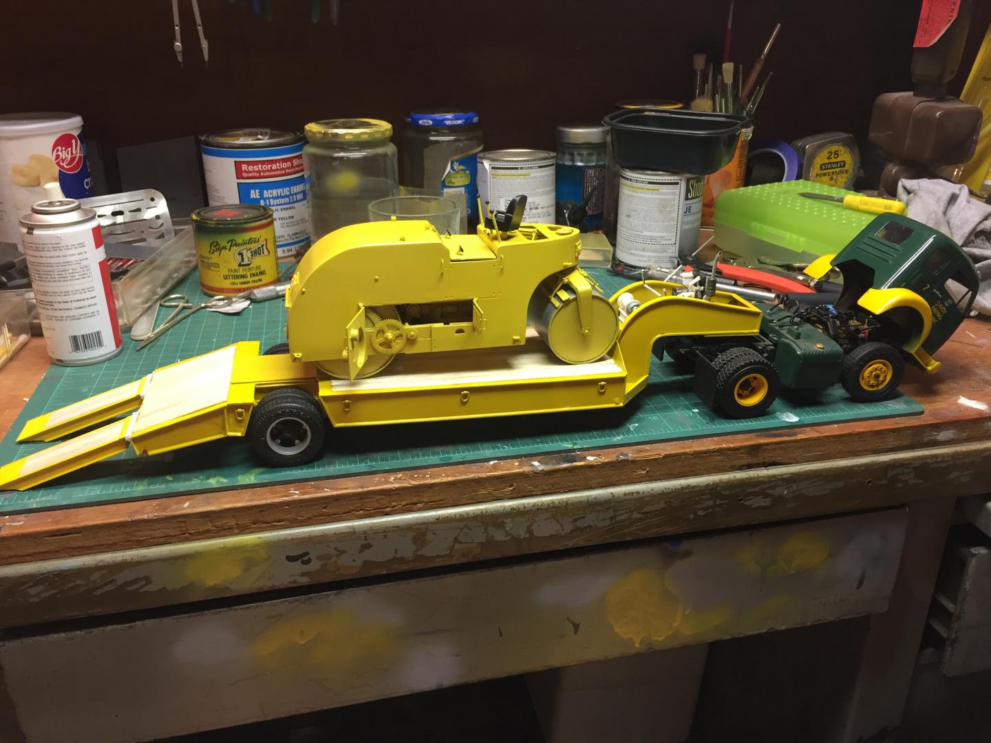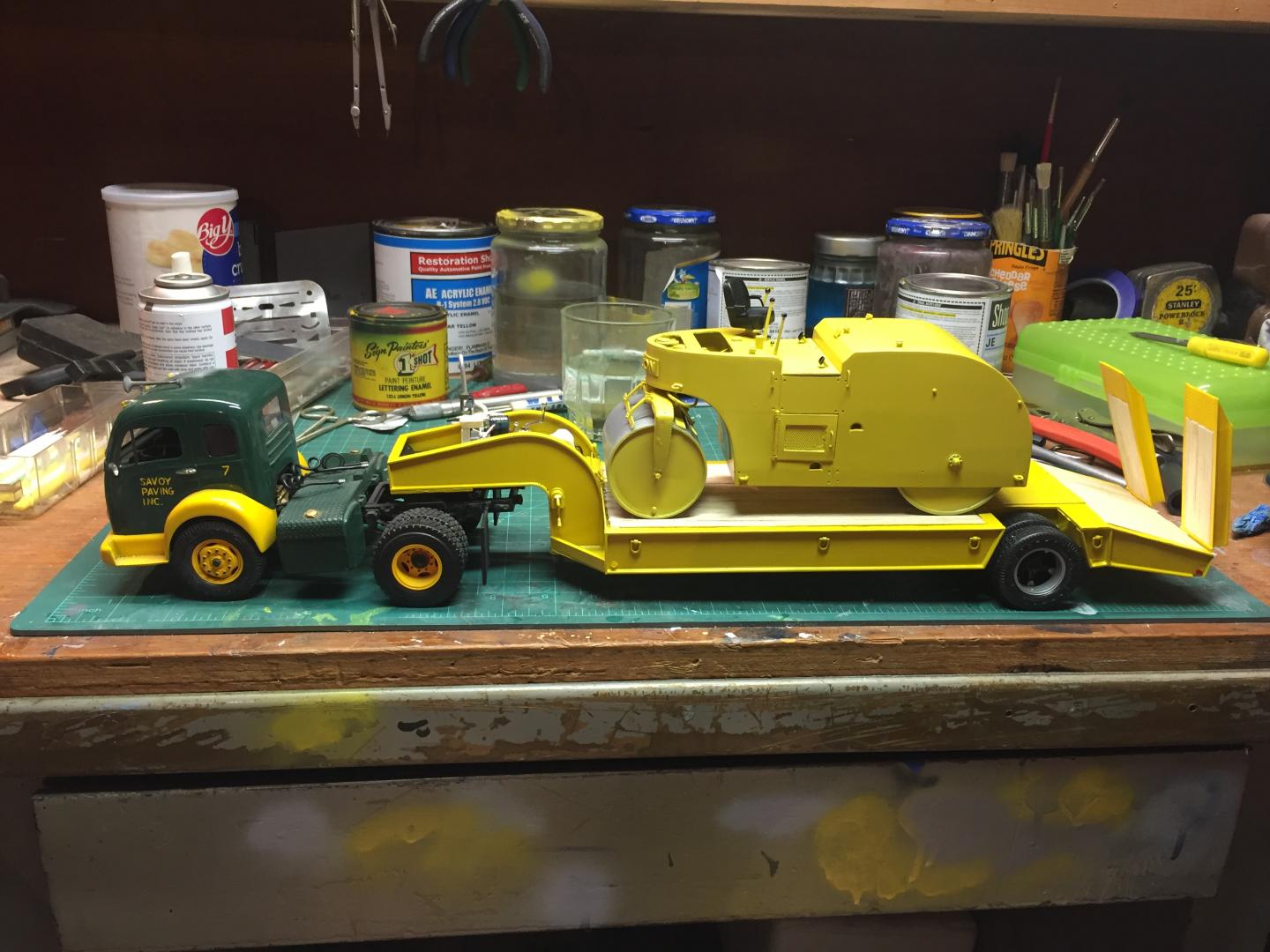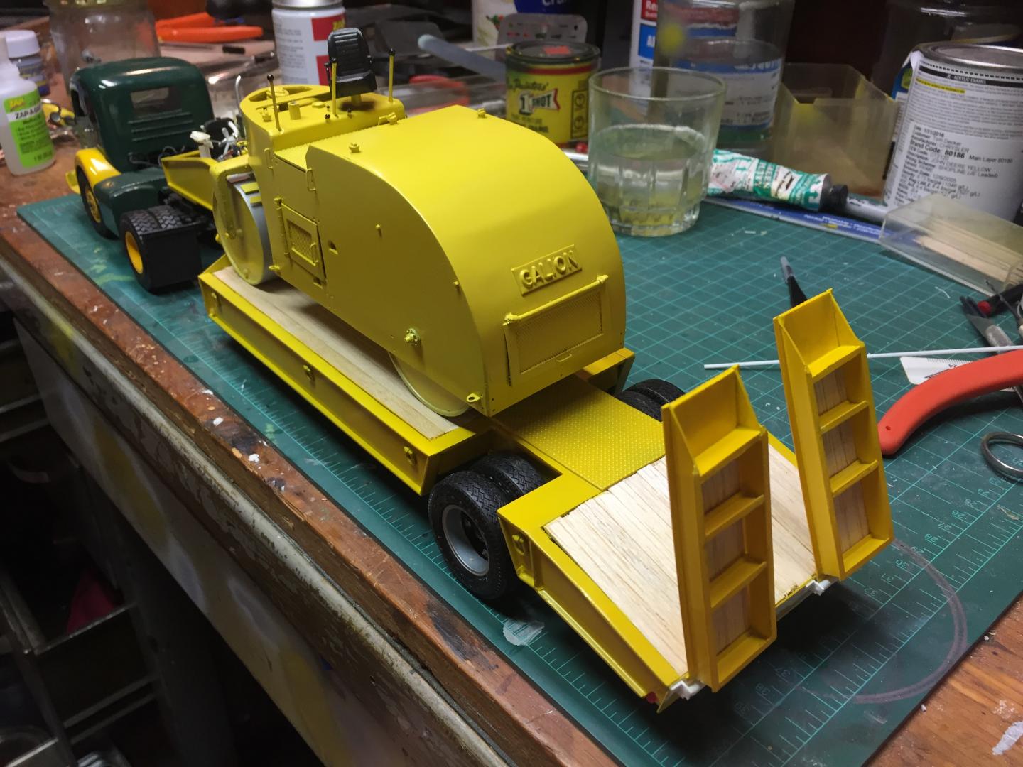 19. All of the pieces are coming together. Still have lots of fiddly things to do such as paint the pony winch and detail it, touch up the ramp hinges on the lowboy, mild weathering etc. Have to figure out how to letter the roller......the lettering on the truck was done 30 years ago by hand when I was just a BIT steadier! But it's getting there step by step. At least the light in the tunnel might be the end of the tunnel and not just the train! Next post on this will be in "Under Glass"......