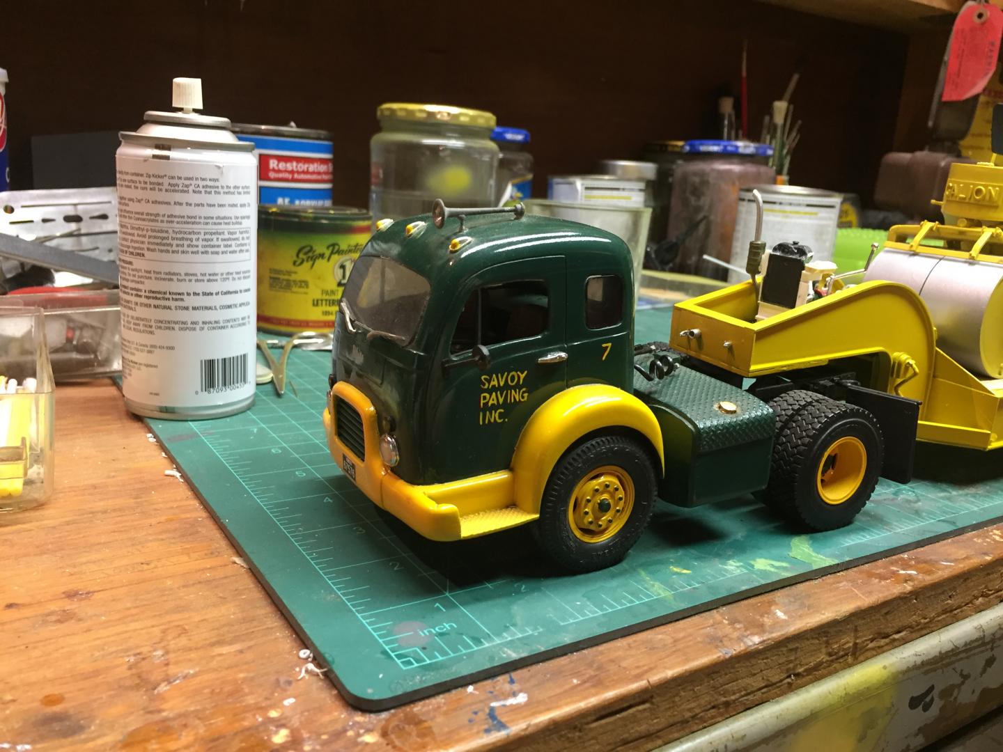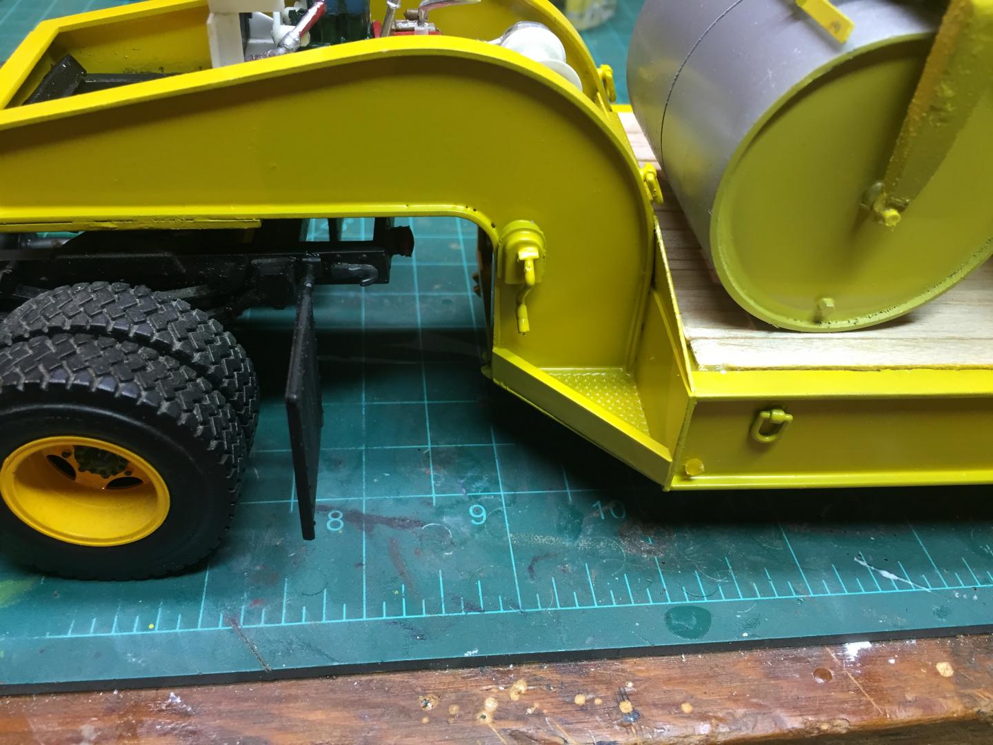 13. After having spent so much time and effort building, and REbuilding after I screwed it up, I don't have the gonads to even TRY to do the weathering you describe, though your advice is spot on. I know how to figure WHAT it should look like and where, as I have worked with trucks and equipment for my whole life, I just don't have the skills to do it. And I don't dare try doing it for fear of ending up with a blob! Actually, the rollers didn't get a lot of asphalt on them, except for tiny bits on the scrapers and matts. Equipment like this does get weathered pretty heavily though, and rain pools here and there, as well as oils. One of my jobs when I worked for Maxymillian was to refurbish equipment every winter. I would open the shop right after Halloween, and run it until the end of April. I had an average of 5 or 6 painters/ bodymen/ sandblasters and 2 or 3 welders working for me there. We would run about 100 trucks and pieces of equipment through the shop each winter, some simply getting a five gallon overhaul, and others getting major work done to them such as rust repairs, accident damage, modifications, and simply wear and tear damage repaired such as welding repairs on dump bodies. The end result, is that my preference is for equipment that appears as though it just recently came out of my paint shop! (That is a convenient way to say I don't DARE try weathering them!!!!!).