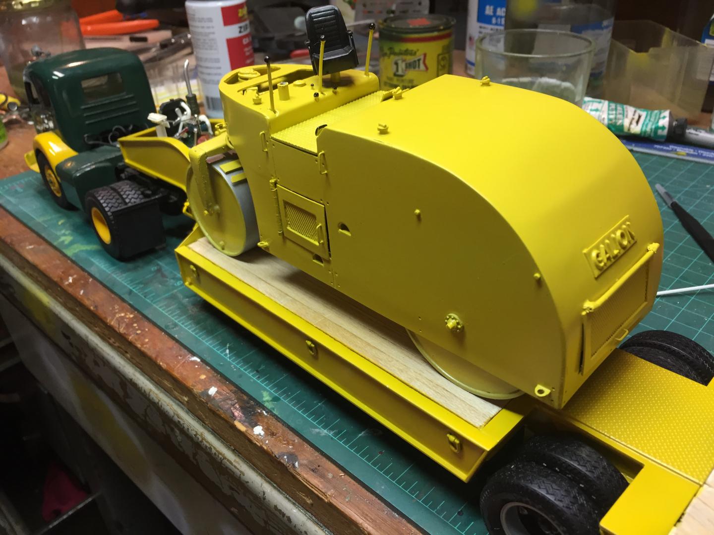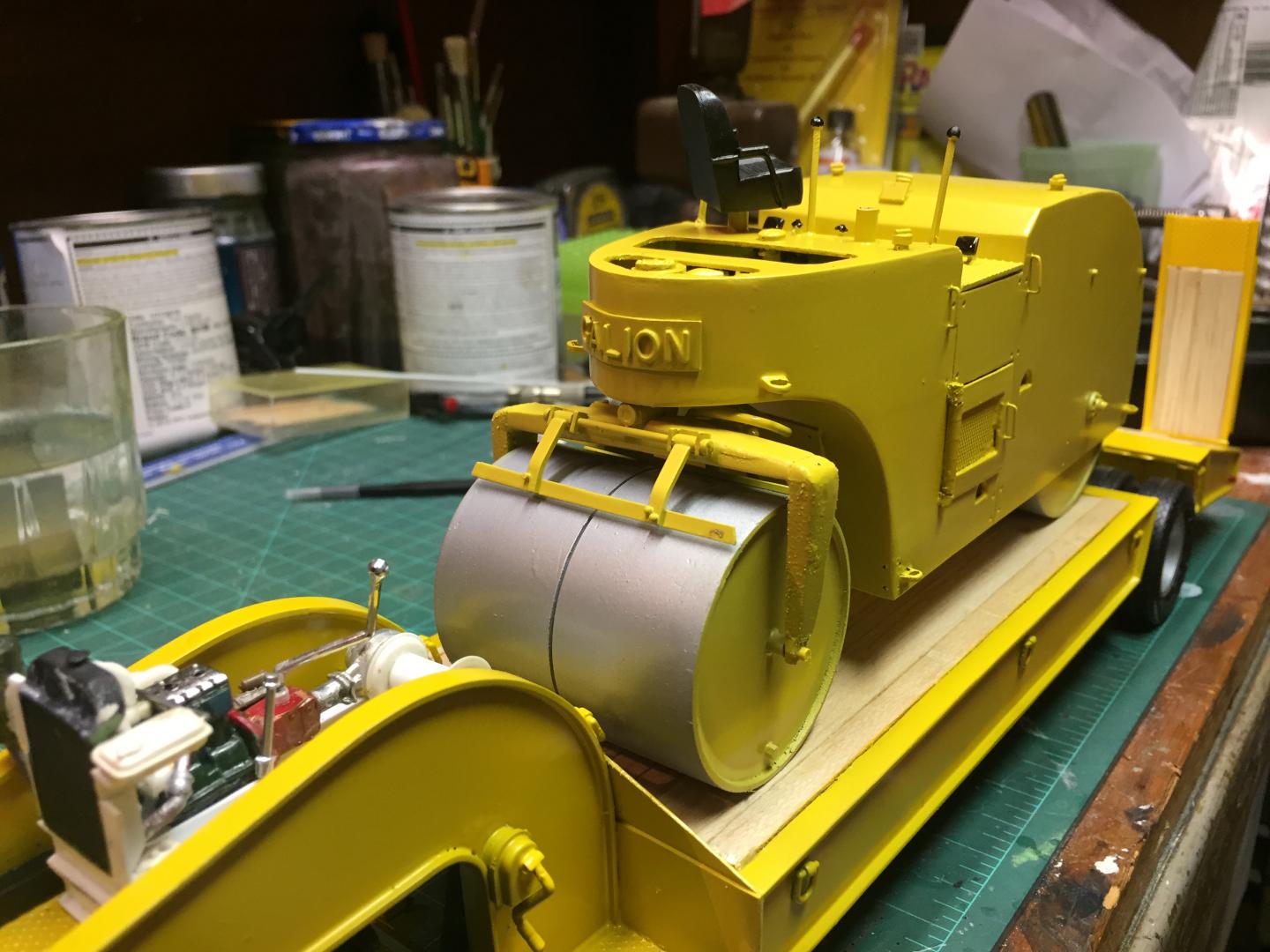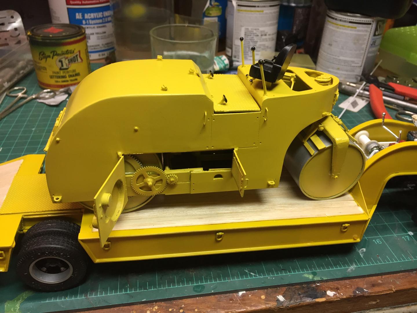 16. Finally got the Galion done tonite. Did a very little bit of weathering, as I am lousy at such, applied the final details, and greased the drive system, which actually works. If you turn the pinion gear the compression roll turns, and was one of the hardest things to do on this build. Should have left the doors closed! I applied some decals and such, and decided to put my own fictitious company name on it, Readsboro Heavy Haulers, a combination heavy hauling and construction company. The White 3000 tractor that will tow this around has a hand painted name on it that I did 30 years ago and I found it impossible to replicate. So the lettering on the truck will also be changed. I will either reprint the door panels on the truck white with my decals or do a repaint of the whole cab. Seems like I am real good at taking two steps forward and five in reverse! But this build was a giant step out of my comfort zone and was super fun. Anyways this old girl is done!