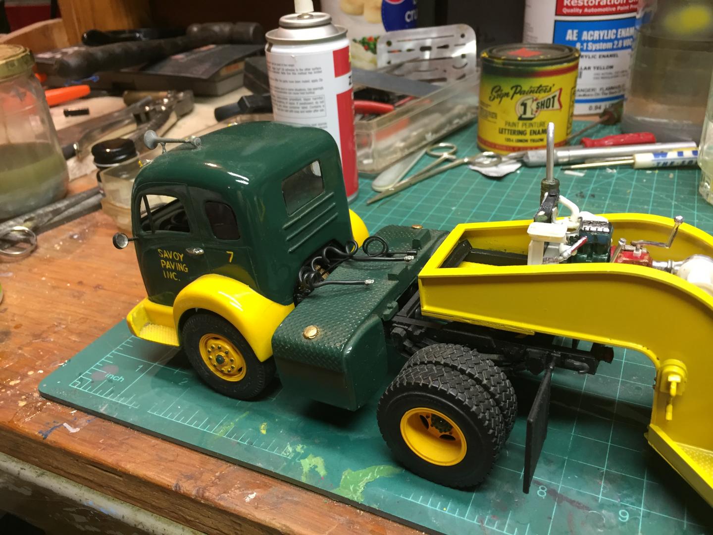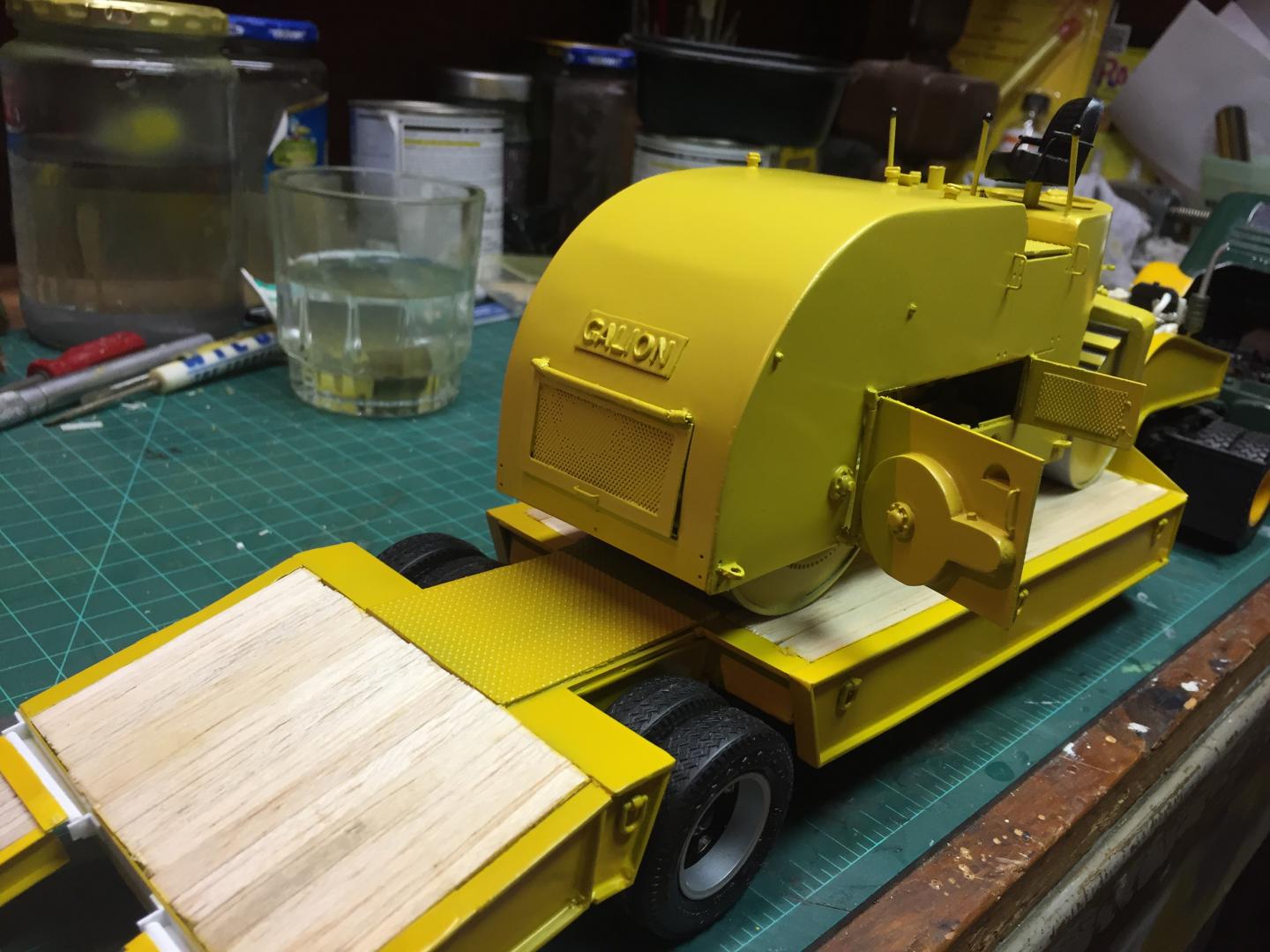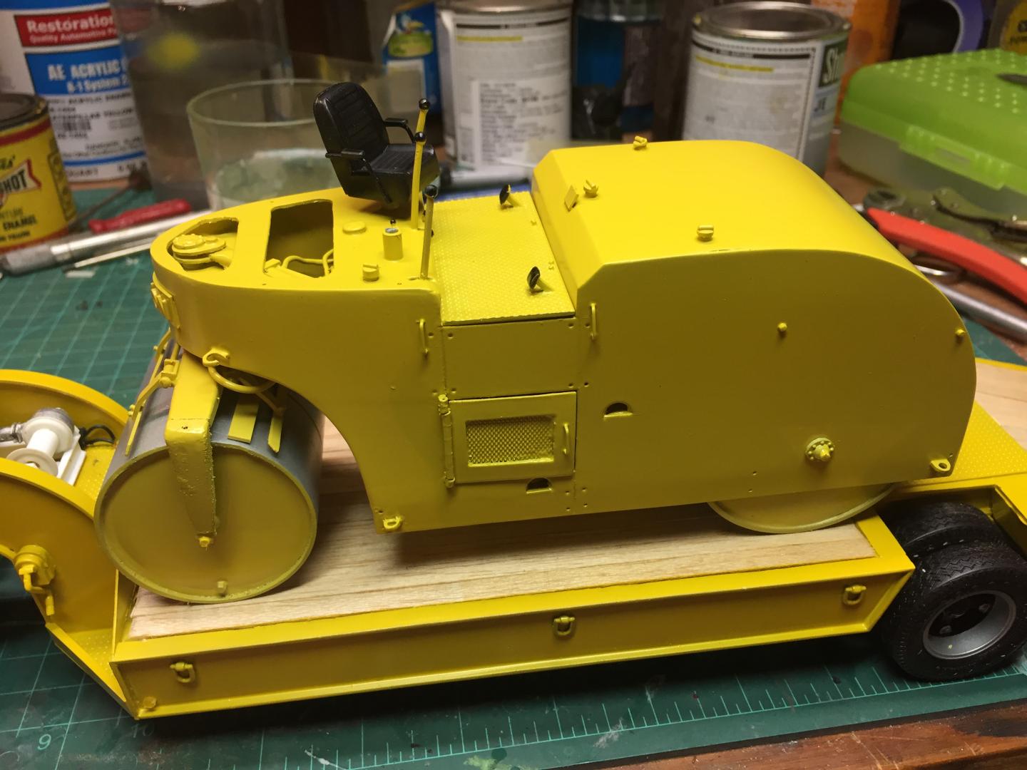 16. Finally got the Galion done tonite. Did a very little bit of weathering, as I am lousy at such, applied the final details, and greased the drive system, which actually works. If you turn the pinion gear the compression roll turns, and was one of the hardest things to do on this build. Should have left the doors closed! I applied some decals and such, and decided to put my own fictitious company name on it, Readsboro Heavy Haulers, a combination heavy hauling and construction company. The White 3000 tractor that will tow this around has a hand painted name on it that I did 30 years ago and I found it impossible to replicate. So the lettering on the truck will also be changed. I will either reprint the door panels on the truck white with my decals or do a repaint of the whole cab. Seems like I am real good at taking two steps forward and five in reverse! But this build was a giant step out of my comfort zone and was super fun. Anyways this old girl is done!