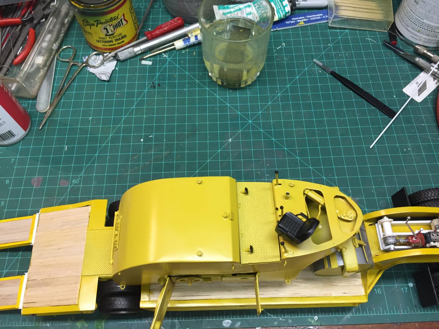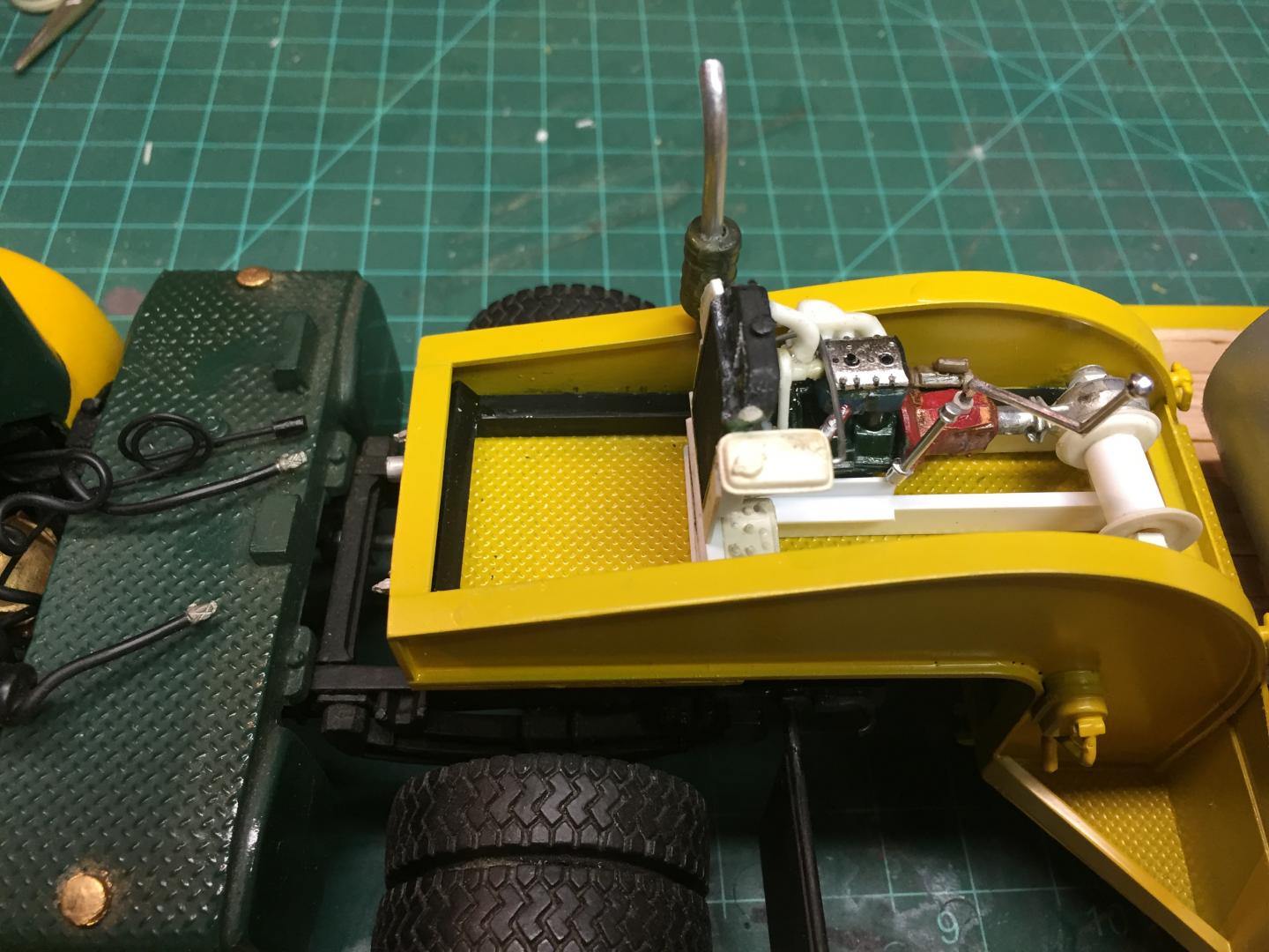 24. Just a bit more done.......all the sheet metal, operators platform, external control levers and pedals, all internal hydraulic hoses and control rods and brake, clutch and shifting linkages, engine installed, seat, and a few other engine control details. Still have fine details, hinges, grab handles, batteries, tow hooks, water system and about 25 punch list items to do before it's ready for paint. Aside from kit parts used for the seat, radiator, and the kit bashed 6 cylinder flat head engine, this is totally scratch built, a first for me. Closer every day!