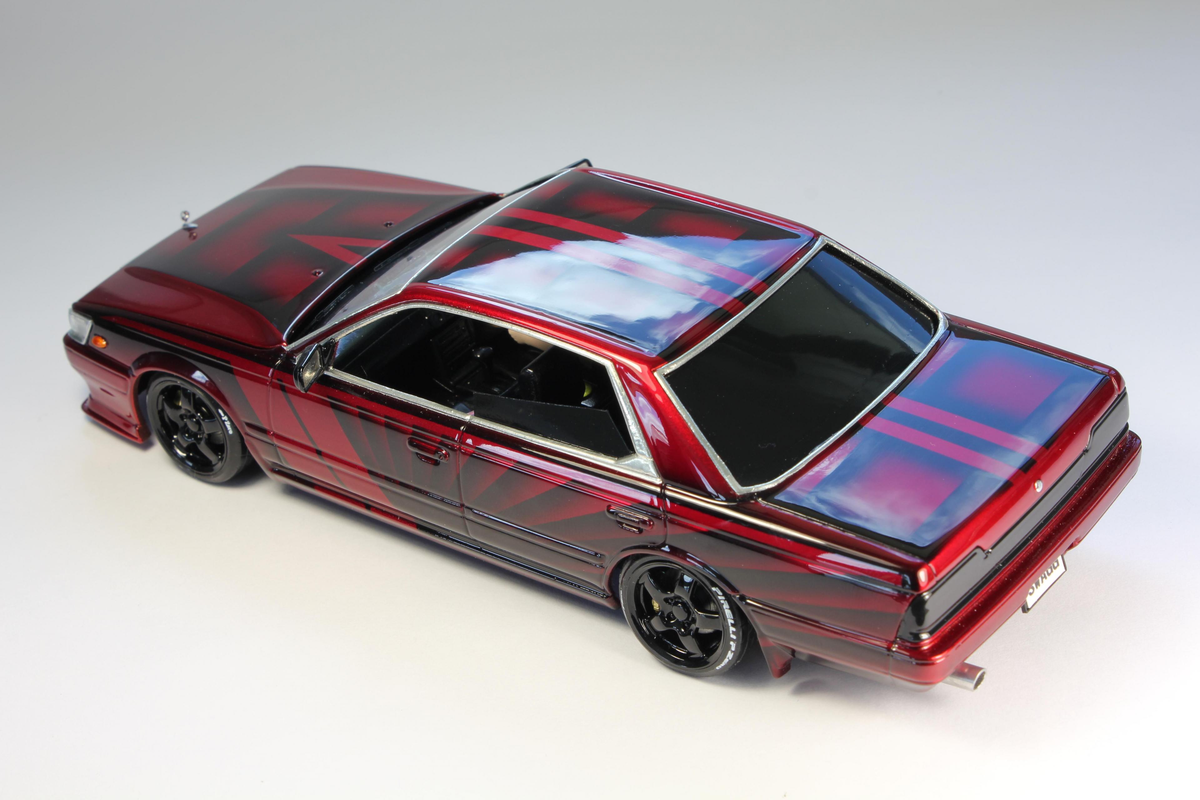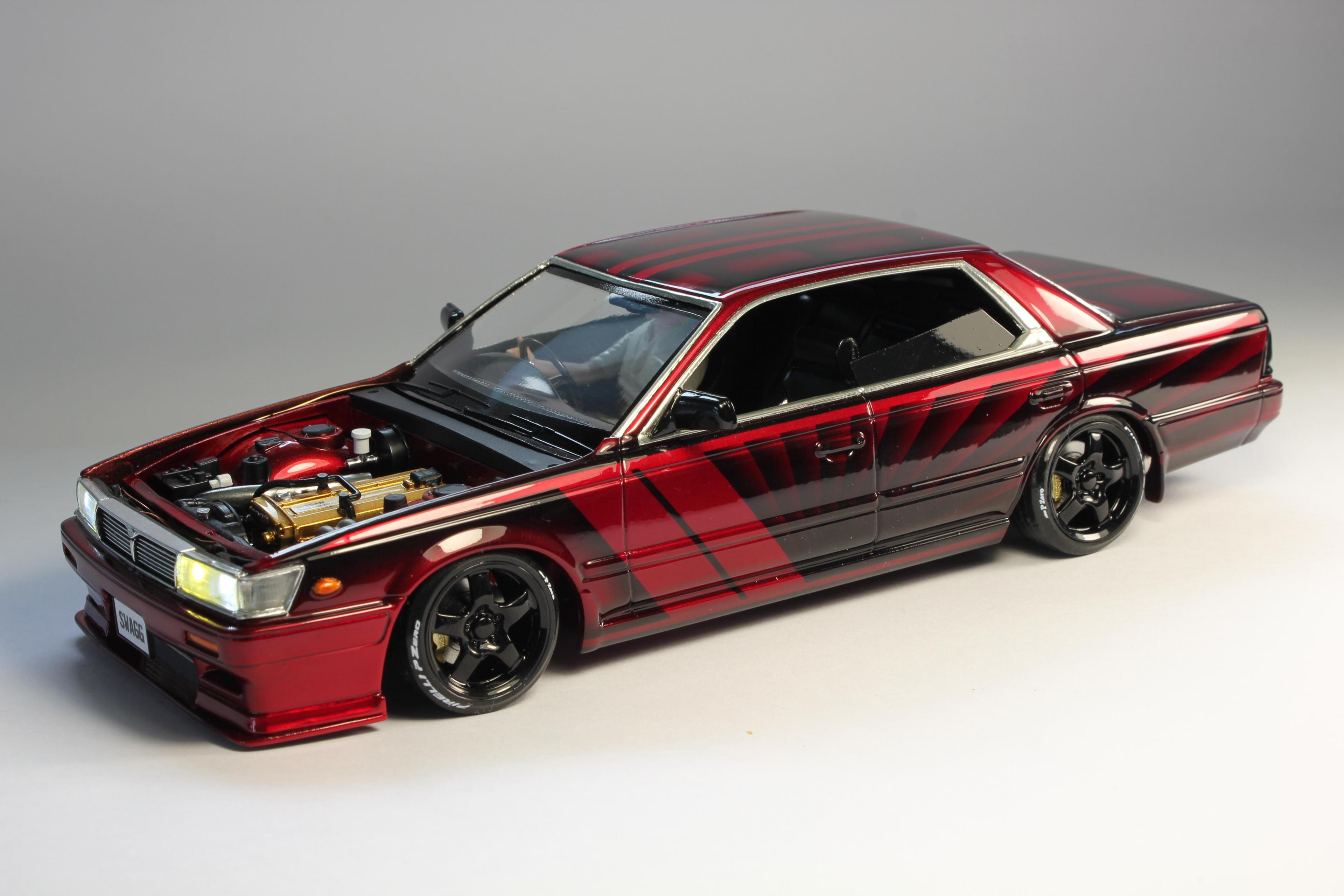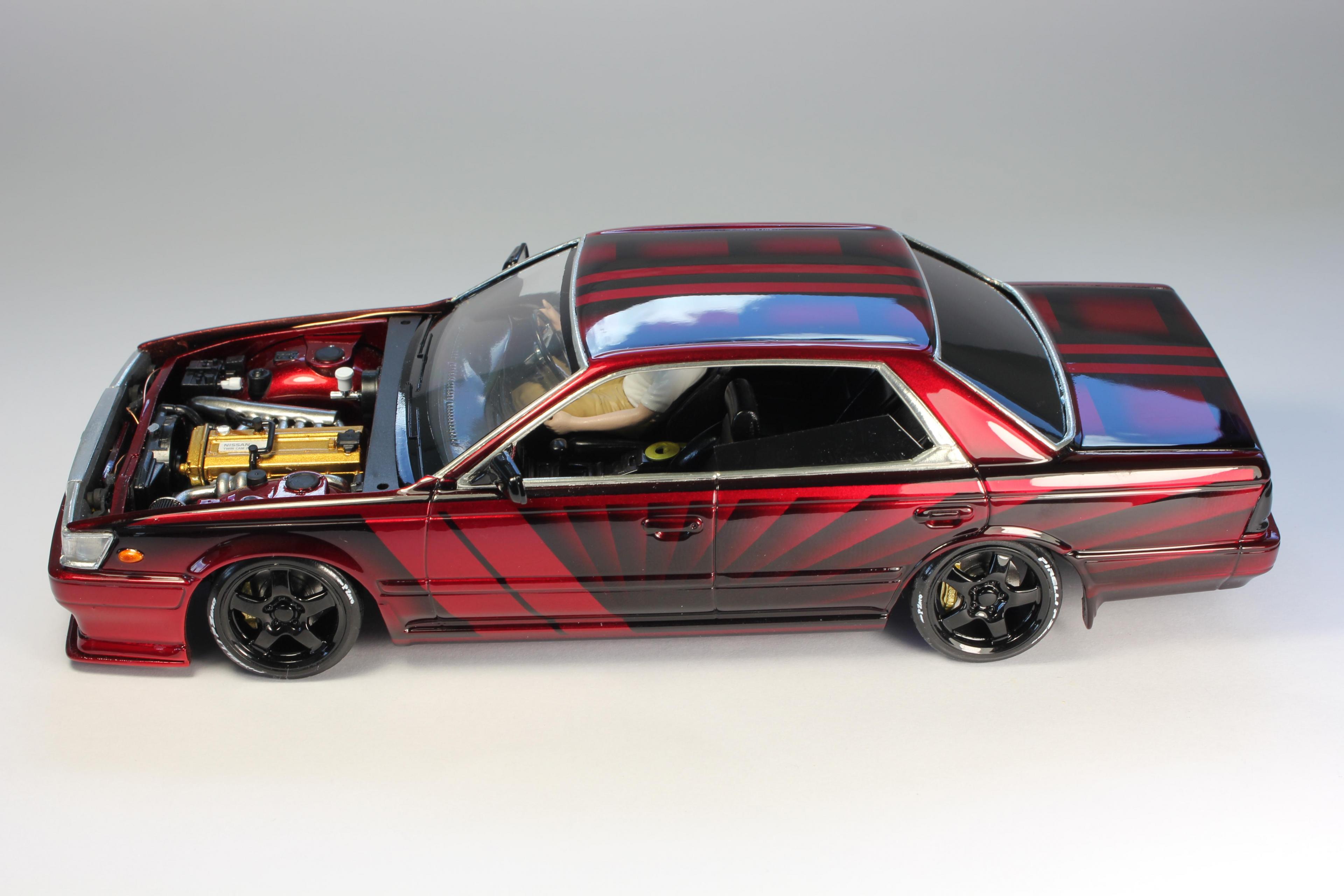 C33 Laurel finished, working lights, driver added, graphics are painted (clear red over gold pearl ex base/black). Modded engine bay, lowered. Mike