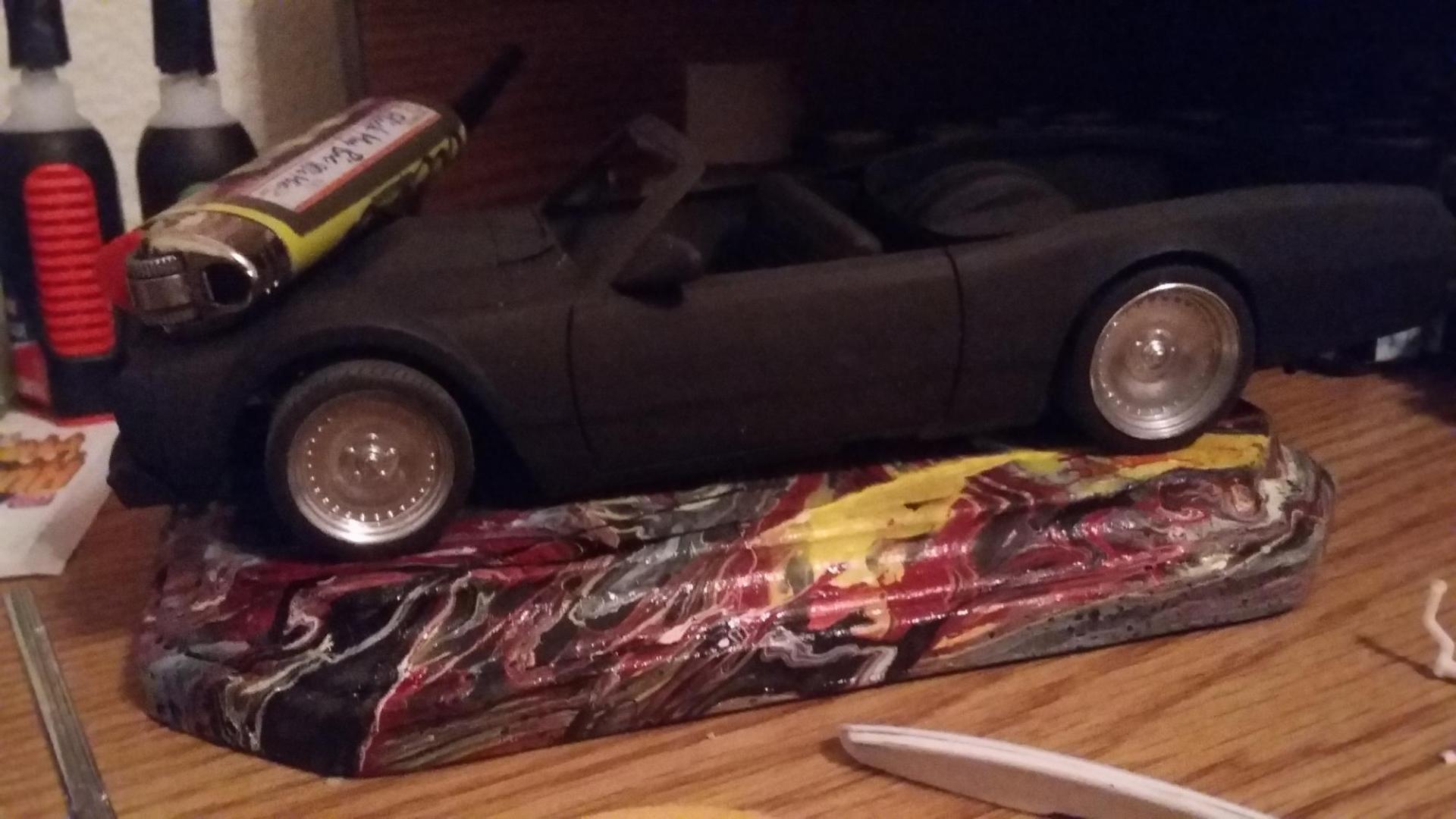 This is a build that started out as a "let's see what happends" kinda build and has really gain some personality because of it. I started by cutting out the trunk, then braced it up to cut the roof off. After removing the top I moved on to the chassis which went together quickly, added wires and hoses along with transmission linkages. First time using a muffler, two in one out to the side. Got her cleaned up and in black primer, ride hight was worked out. The front required some scratch built drop spindles. The rear end needed major sanding to the top of the differental.. I'm happy with the look so far.Testers purplelisous came out nice with a bit of clear. The interior and the bed still need some work, going from a race car to a street car is never easy. I knocked down the chrome wheels with a dusting of black primer. It was more of an accident but the results are better then expected. More to come soon.
