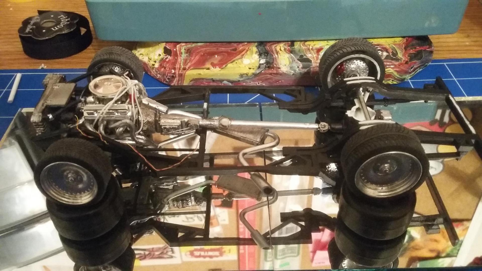 Yes this is a very "what if" model built by pure imagination. Heres a chassis shot and also the dash board before install. I added a few things to motor such as a hard fuel line, fuel pump, radiator hoses, overflow tank and distributor along with a dash mounted ignition box, all scratch. The oil filter relocater and oil cooler were supplied but I plummed them to make it right. The stance was lowered, wheel base legnthened along with the drive shaft. The exaust was made in a nascar style to finish it off. Look out for more builds by Cancinoevil.