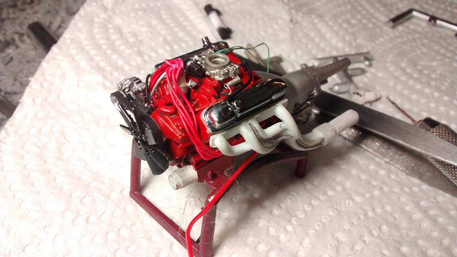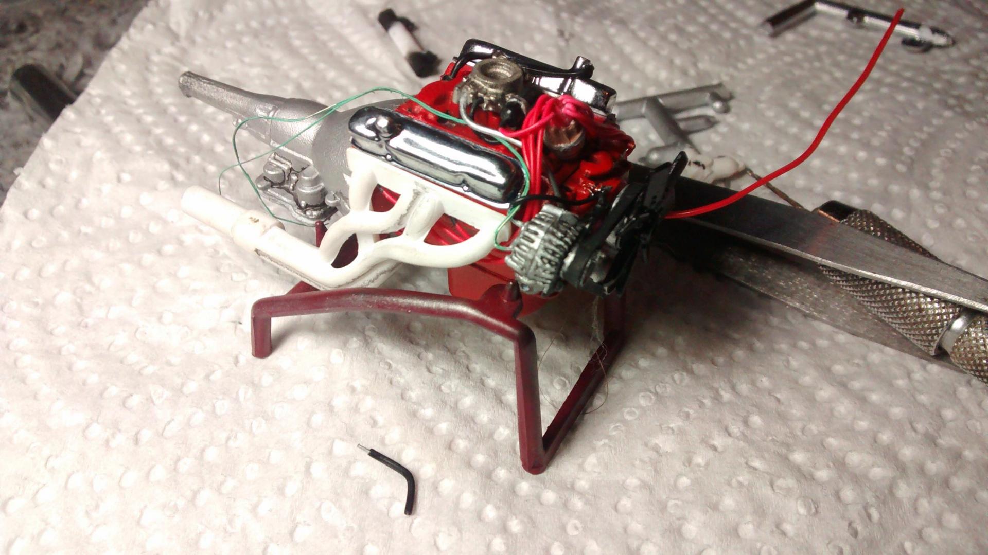 Ok, so after getting frustrated with my paint mishap and walking away for a bit, I decided to get back at it. The body's been reprimed and painted and is just waiting for its clear coat. Don't mind my filthy paint booth, I'm kind of a slob lol. Anyway, I also started chipping away at the engine and can call it done with the exception of the air cleaner.