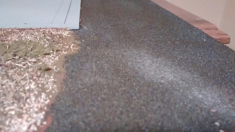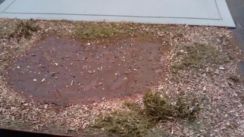 So here's the garage/speed shop dio I've been cranking on for the last 5 months. I just signed up for the forum about a week ago so I'll just post everything I have, from beginning to where I'm at now. I started with a garage kit that was given to me after a friend gave up on it and went from there. To start, I cut some scrap plywood to size to fit the shelf it will be displayed on which was then painted flat black. I masked off where the base of the garage would be and sprayed the surface with Rustoleum Multi-color Textured paint which turns out is pretty much asphalt in a can. When the "asphalt" dried, I went on to make an area for a junked 34 Ford pickup I'm currently finishing. It started with a quick coat of burnt umber acrylic paint, followed by a mix of flour, water, fine sand, brown and black paint, and Realistic Water to simulate mud to the best of my ability. After the mud dried, some gravel, grass, brush, etc. was added. It still looked a bit bare so I raided the girlfriend's spice cabinet and made a mix of basil, oregano and thyme to make some natural ground clutter.