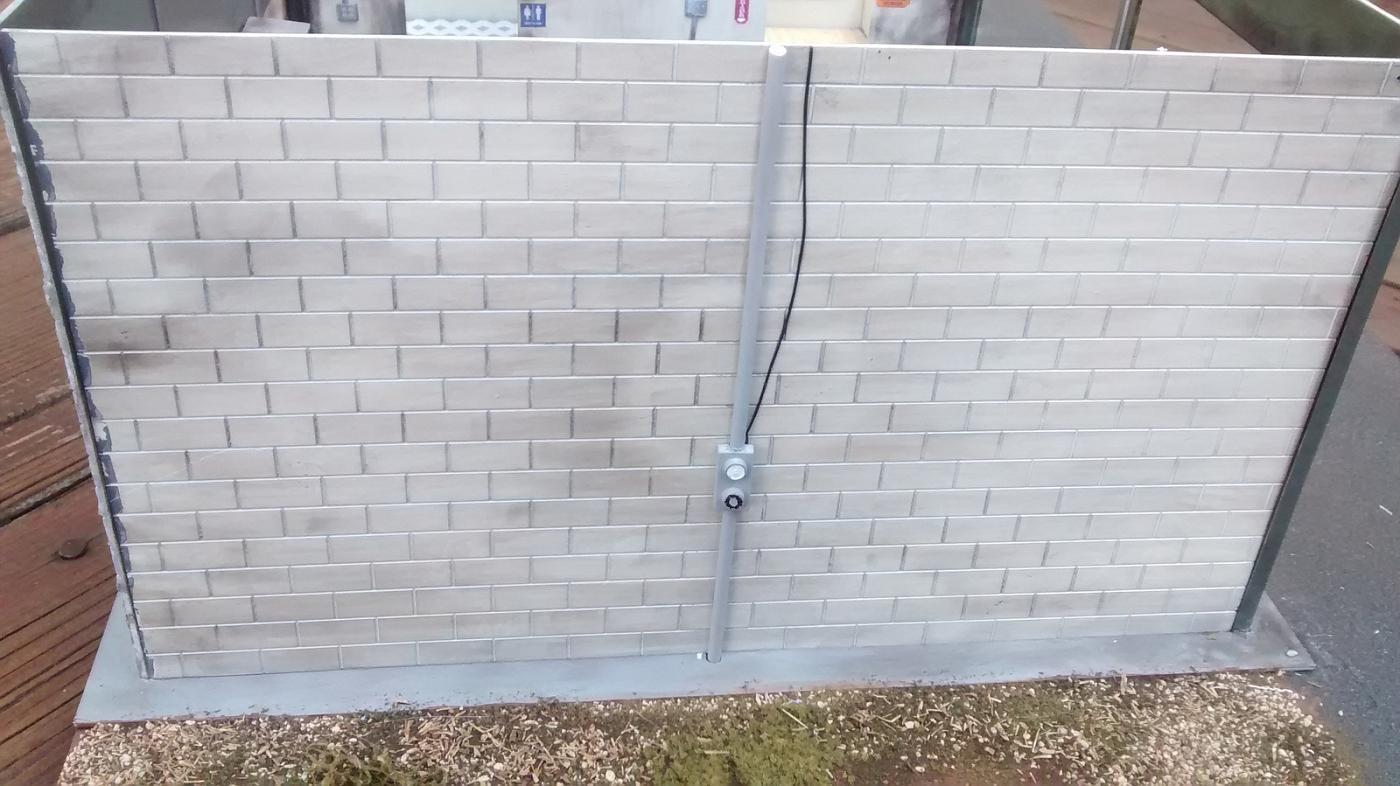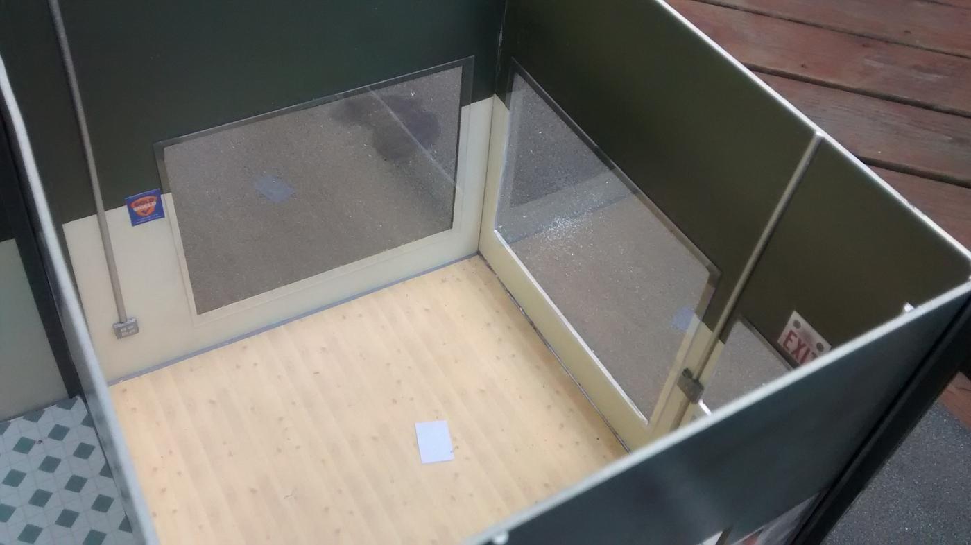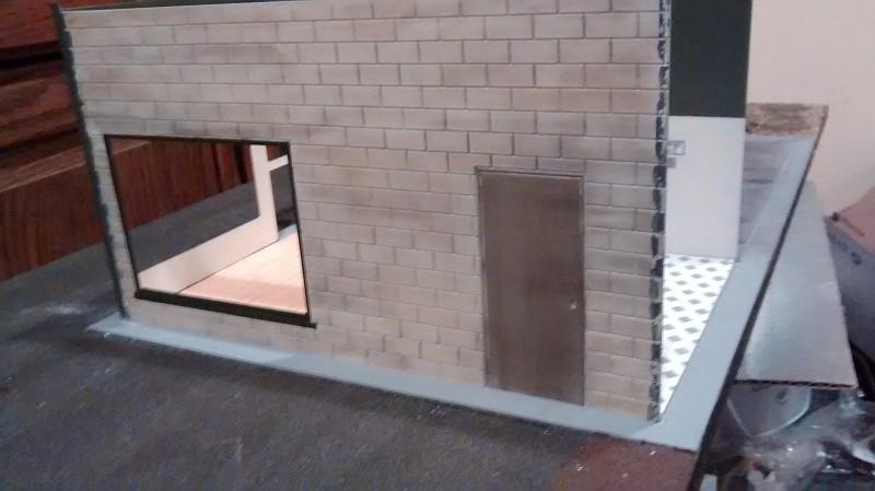 I got all of the walls lined up and finished weathering them, then installed the shelves, exhaust rack, conduit, light switches and outlets. The conduit is half-round styrene, the switches and outlets are balsa wood. The shelves and exhaust rack were made from V shaped styrene and sheet styrene. To make the back and side wall removable, I glued two styrene rods to the wall, then drilled holes in the base to make a slip-in piece. I then drilled two holes at the top and used thin wire to snug up the removable wall to the stationary one. The back won't be visible when displayed, so I'm not sure if I'm going to put any more work into it. I did the same with the side wall, but dressed up the support rod to make it look like an electrical line/meter. The meter, don't laugh, is a Lego brick carved out with a file to fit around the rod. After a little more detailing it should look pretty decent.