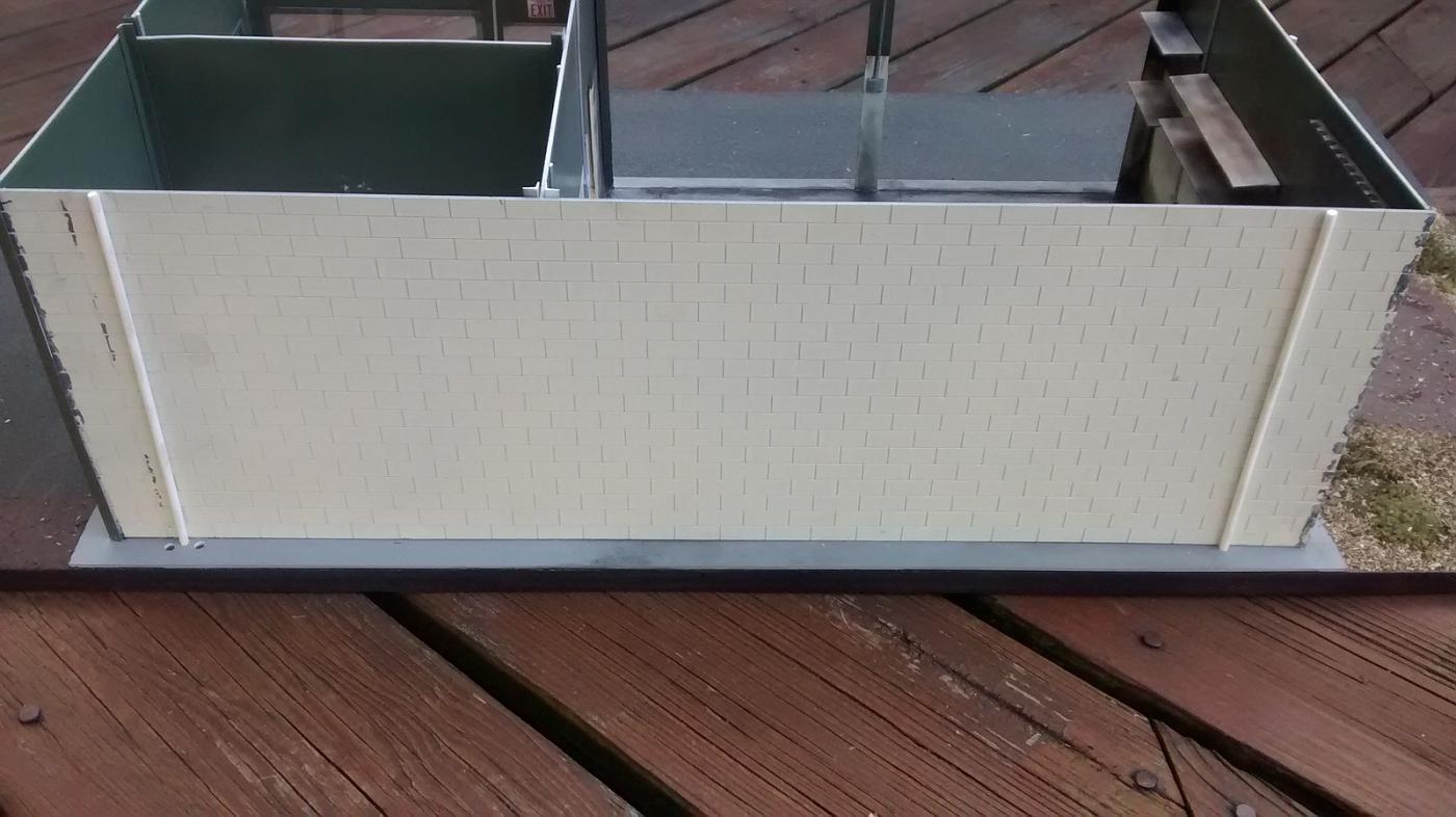 I got all of the walls painted and weathered most of the way, but doing the final mockup is proving to be a challenge. Lots of trimming had to be done to get everything to fit. I'm also trying to make the back and one of the walls on the side removable so that's making things a bit more difficult. To do this, I cut some angled plastic to make slip-in supports along the bottom.