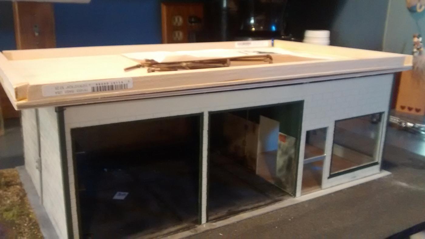 So I was bored waiting for some paint to dry, had some extra lights and couldn't leave well enough alone. I started off by building a box using some scrap wood and styrene sheet, then painted to match the roof. It's a bit big but it's the smallest I could go to accommodate the lights. I then placed a little aluminum foil around the inside, hoping that would reflect and diffuse some of the light. These little LEDs are pretty bright but in small space seemed to be more directional than I wanted. The aluminum did it's job well in a test run so I went on to the next step. The next step was wiring the lights and putting them in place. This was a mostly painless process that was only complicated by the ridiculously thick solder I was using. Despite that, 20 minutes later the lights were snug in their new home and working as they should. After screwing around with MS Word for a while, I came up with a name and design for the shop. I printed it out on photo paper, cut to size and attached it to the light box. Then I smeared some epoxy on the back, propped it up with a parts tree and went to work while it dried. I came home from work, hooked up the last remaining wires and this is the end result.