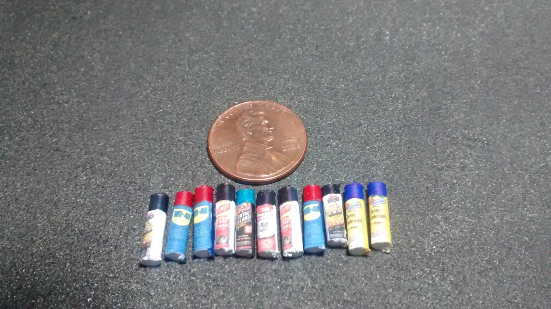 Then I got some more work done, mostly just stuff to start filling up the inside. First was a quick, waiting for paint to dry project. I made some spray cans out of some leftover styrene rod I used for the wall braces. Easy enough, just paint the rod in sections (you can do them individually, I just thought they were easier to hold this way), find images of your favorite automotive products on google, crop, resize and print. Glue them on the rod, cut the cans to size and you're good to go. They could've come out better, but like I said, this was one of those on a whim things