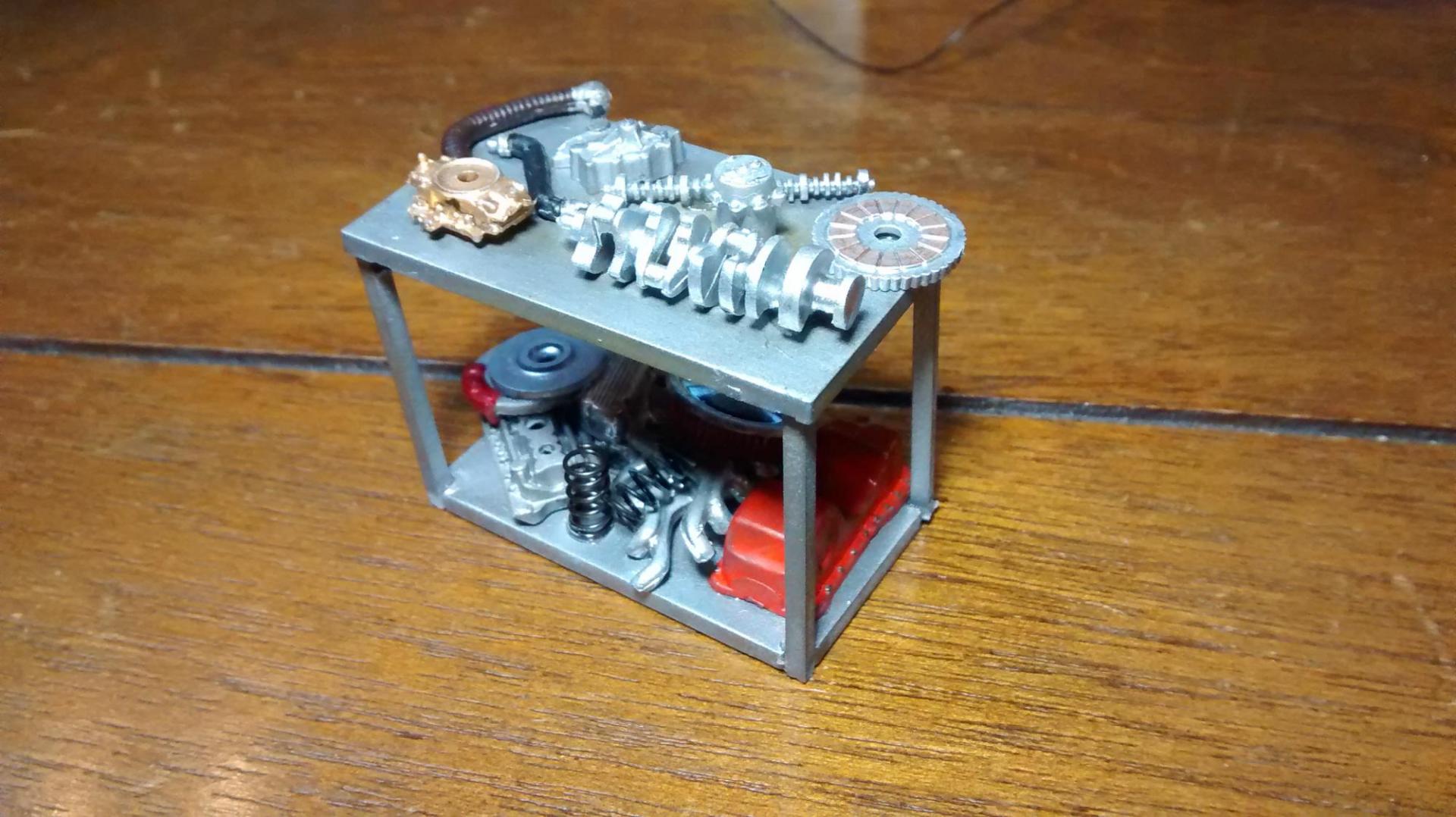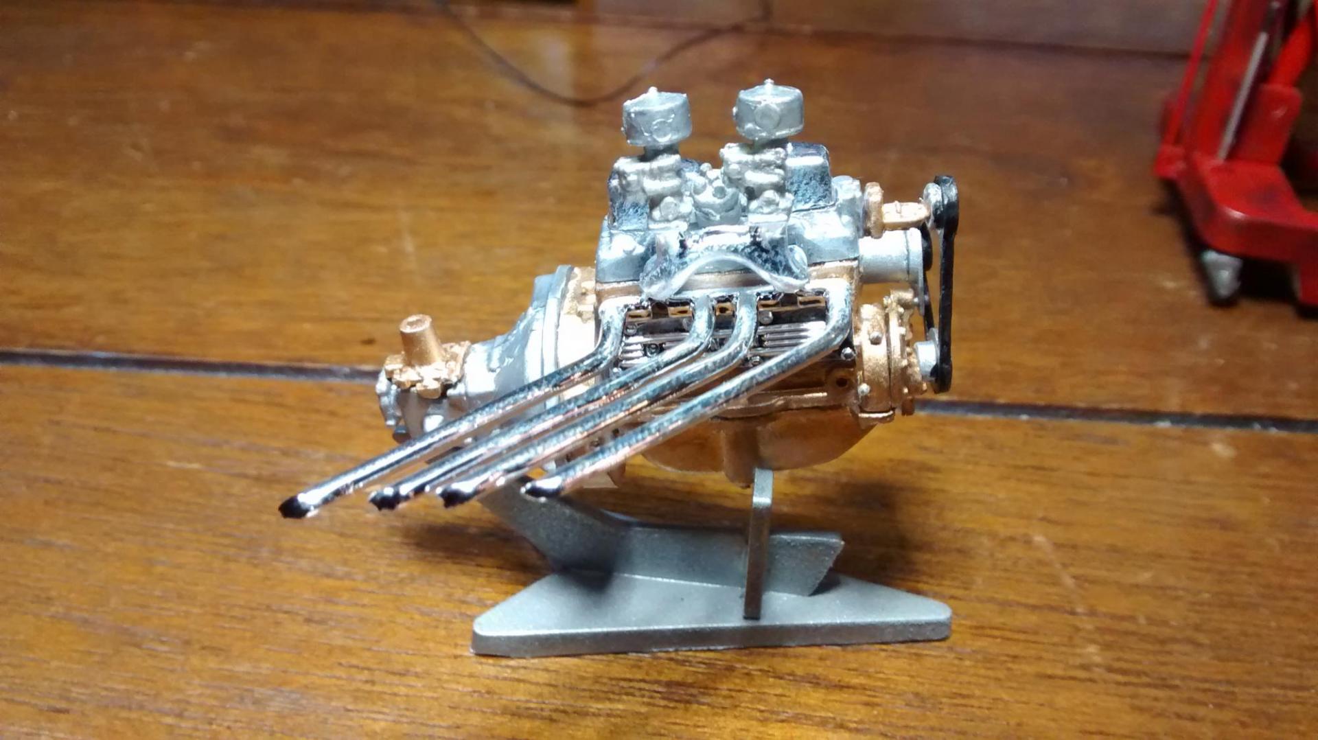 The front office window will be the home for this Ford 4 banger robbed from a Revell Model A. Stand is from a AMT 57 T-Bird (miserable kit, btw)