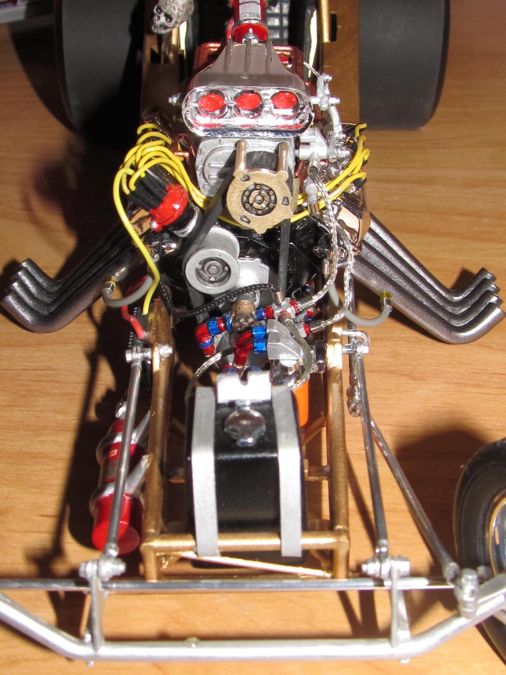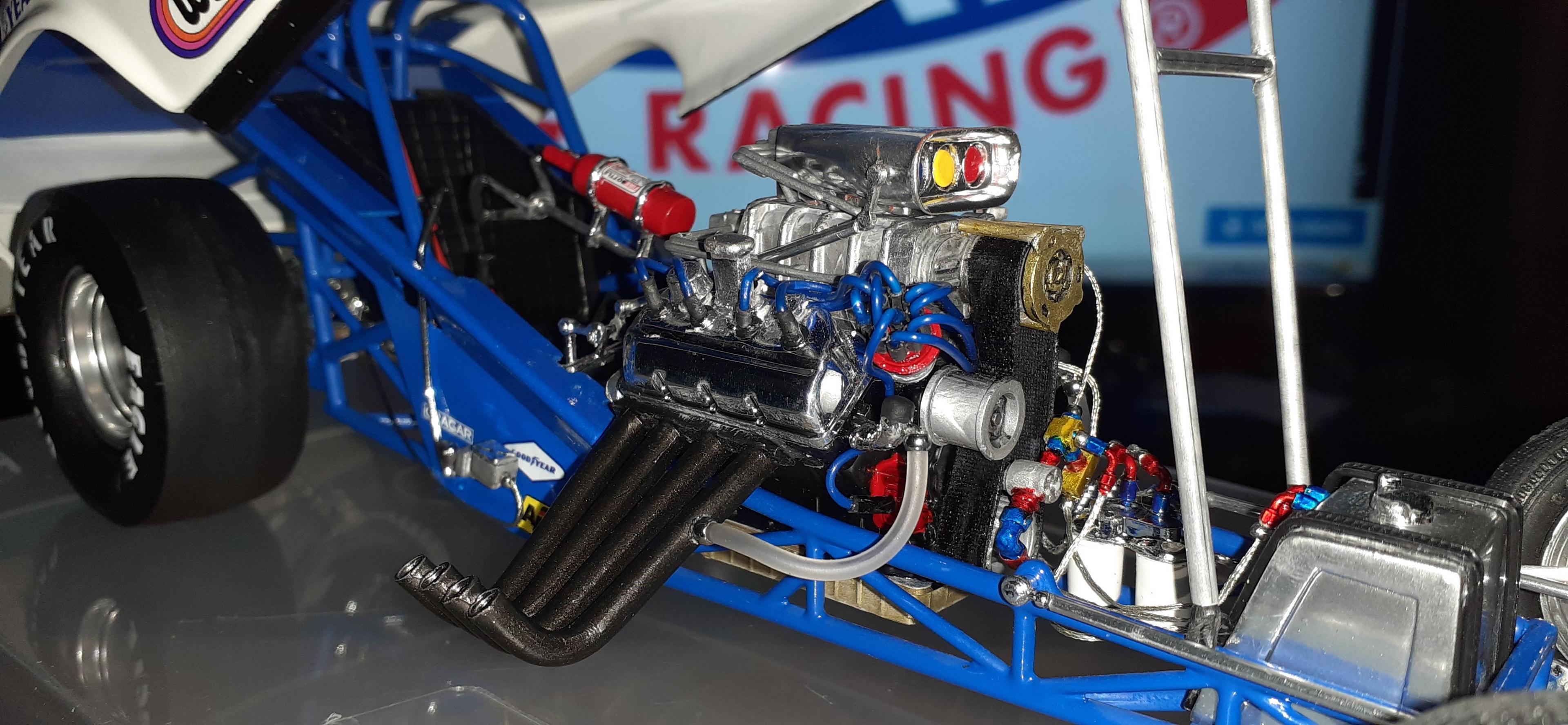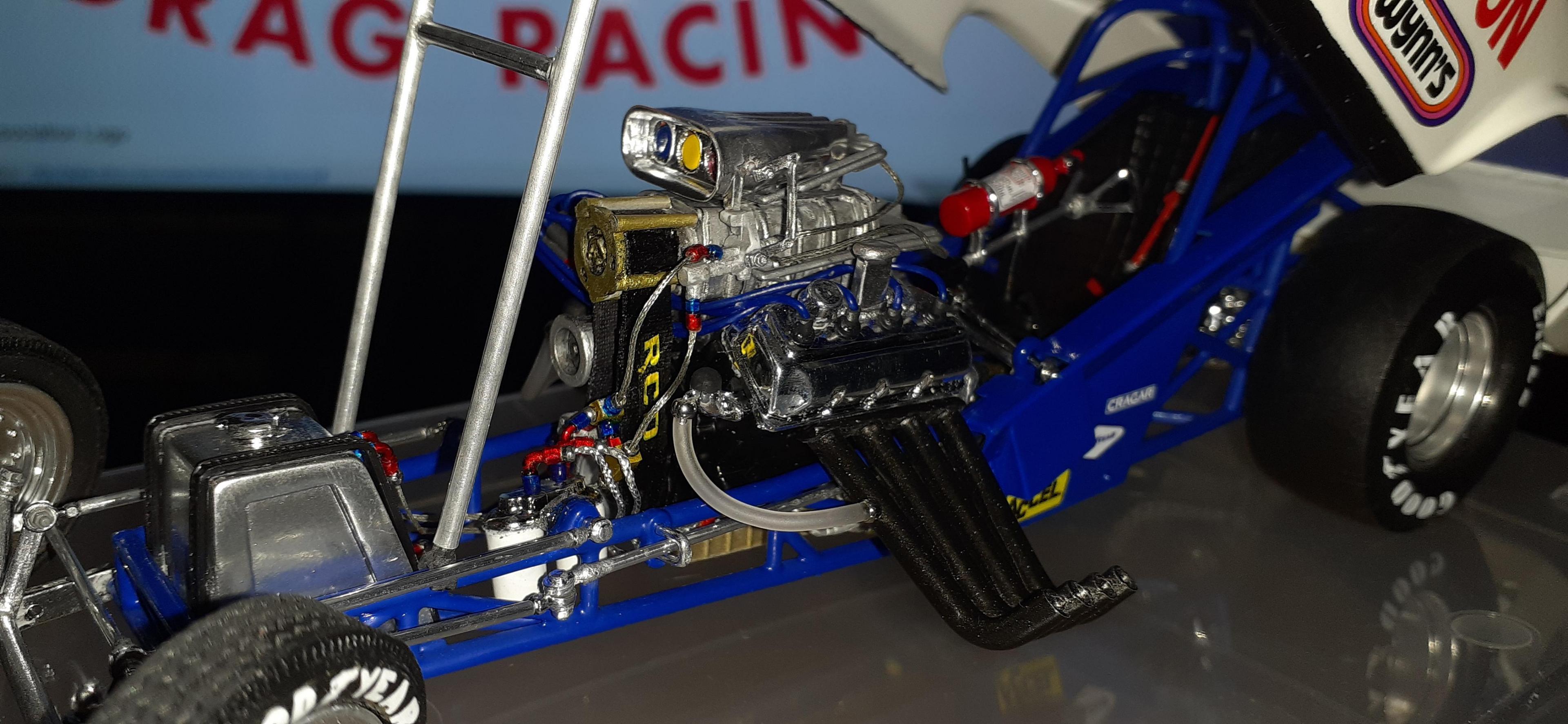 Built this a couple years ago, added details, braided lines with A&N fittings, electrical box, extra fire extinguisher, aluminum rod for steering and radius rods, lowered the chassis, added rocker trim and spoiler extensions, bolt detail around front/rear glass, also used new tires and rims from re-released Hawaiian funny car.