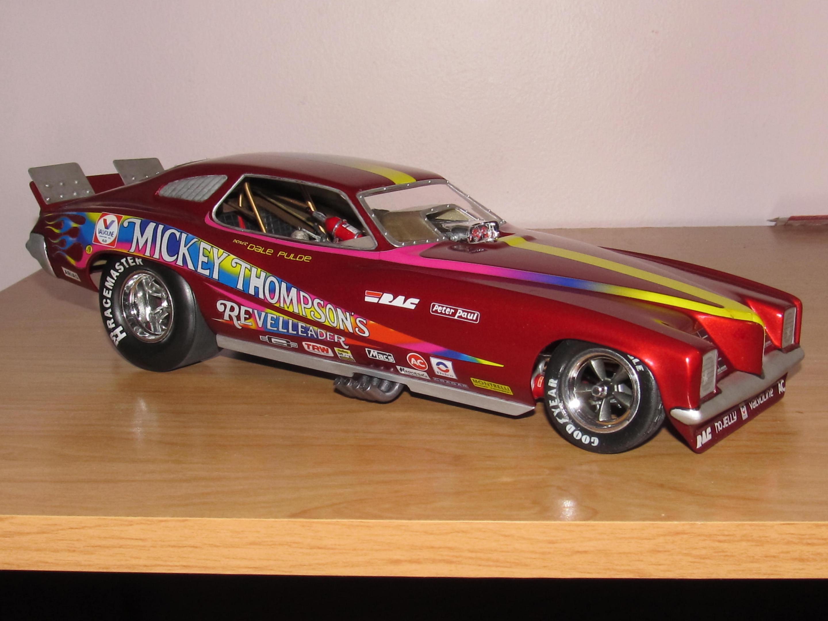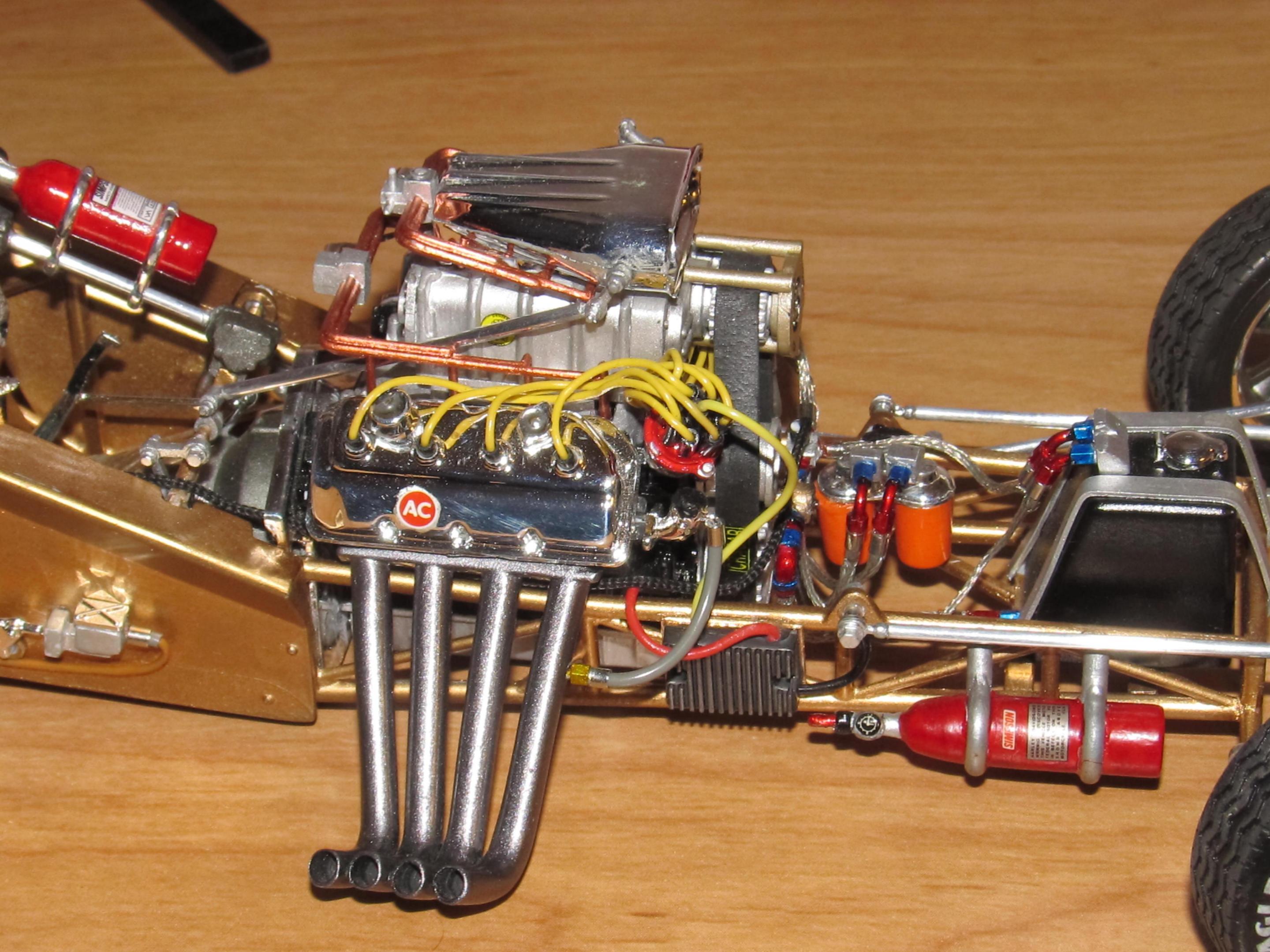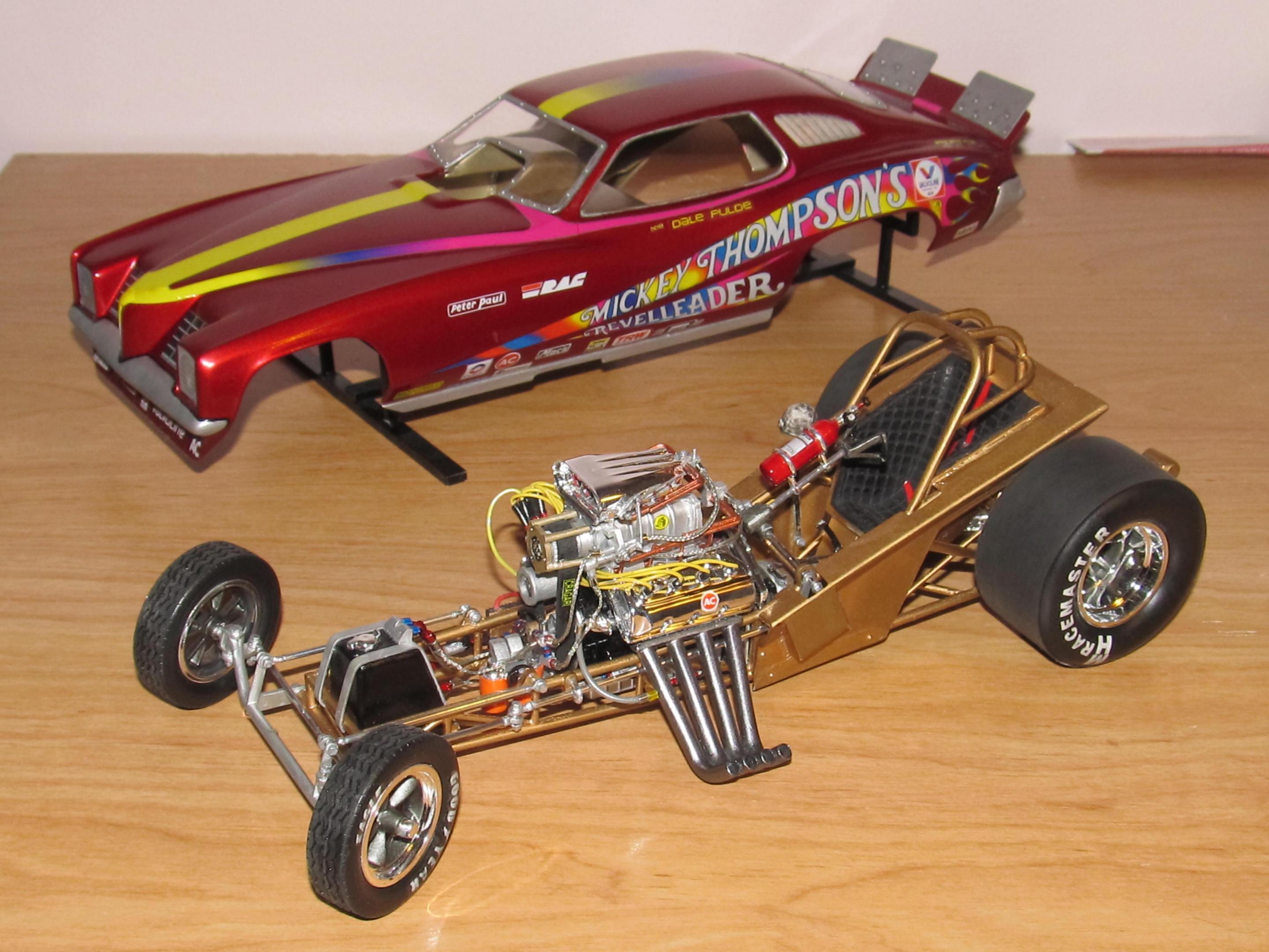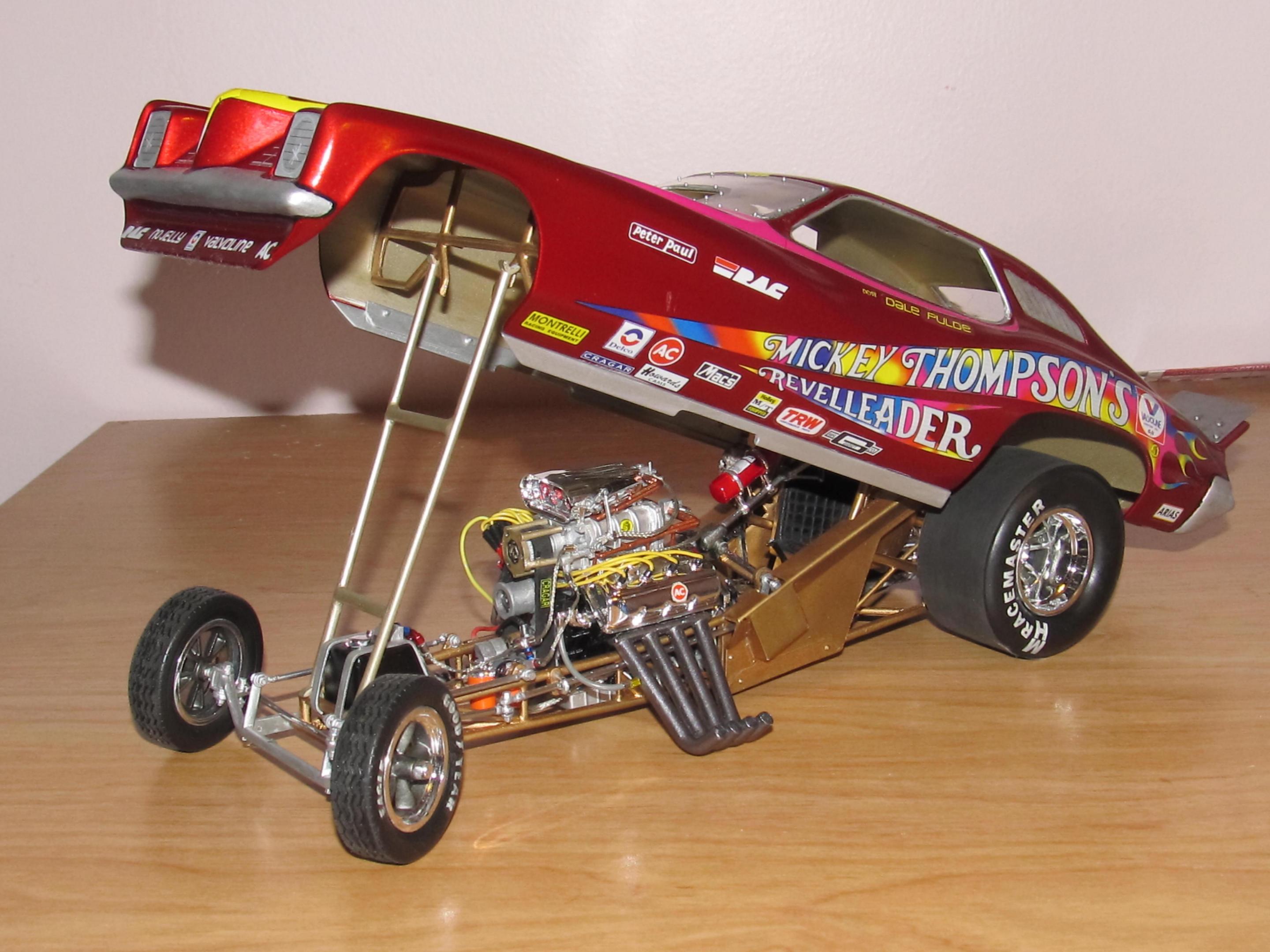 Built this a couple years ago, added details, braided lines with A&N fittings, electrical box, extra fire extinguisher, aluminum rod for steering and radius rods, lowered the chassis, added rocker trim and spoiler extensions, bolt detail around front/rear glass, also used new tires and rims from re-released Hawaiian funny car.