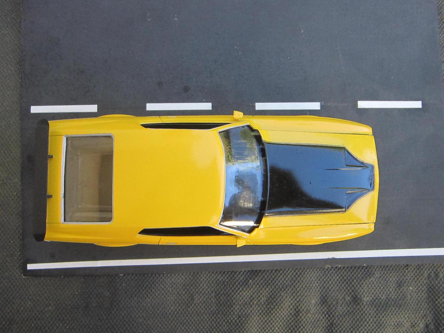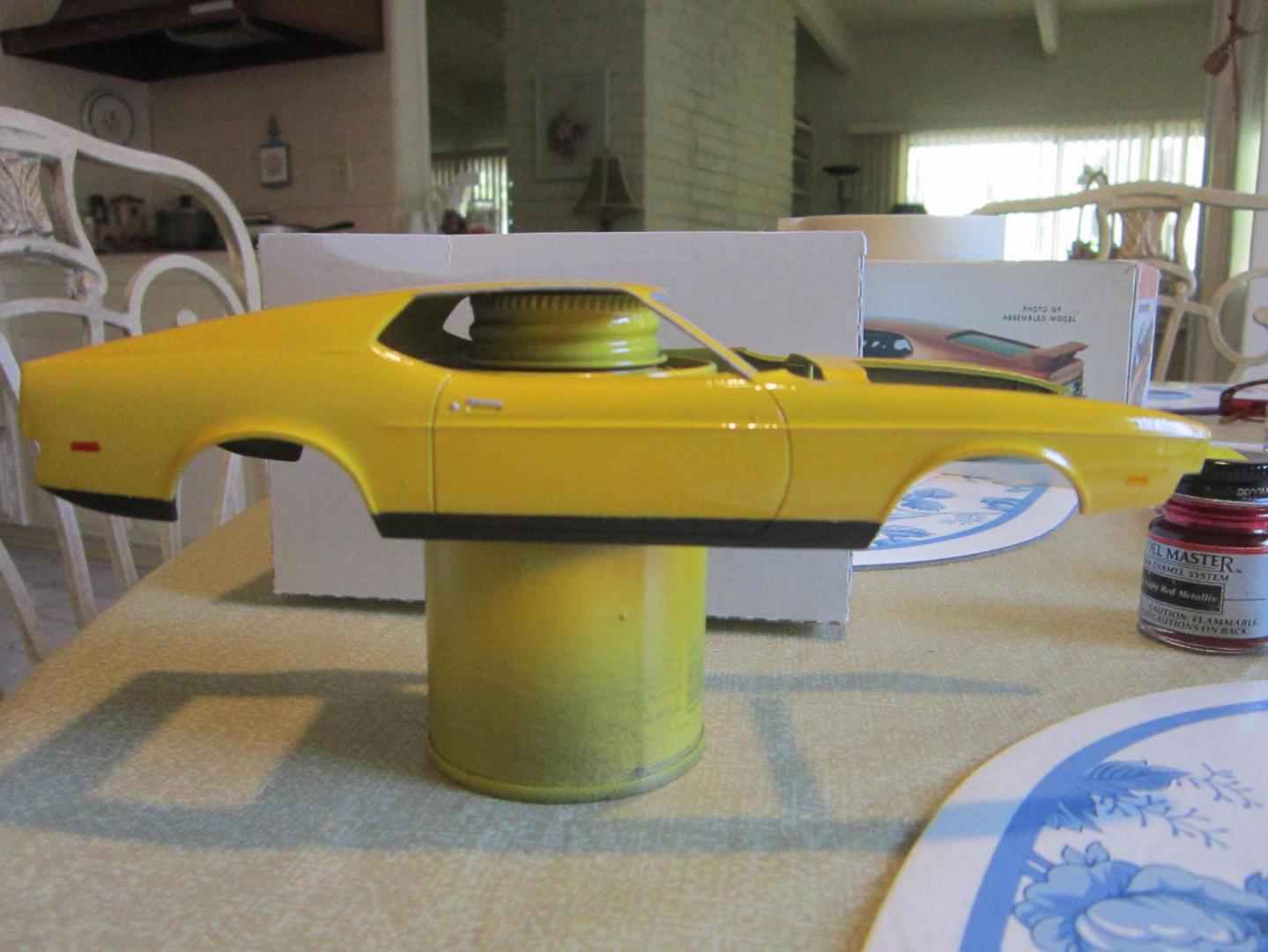 painted with Rustoleum "Sunburst Yellow". side markers stenciled in using masking tape. going to do some masking/striping on the hood yet. 351 Cleveland engine. finished chassis.