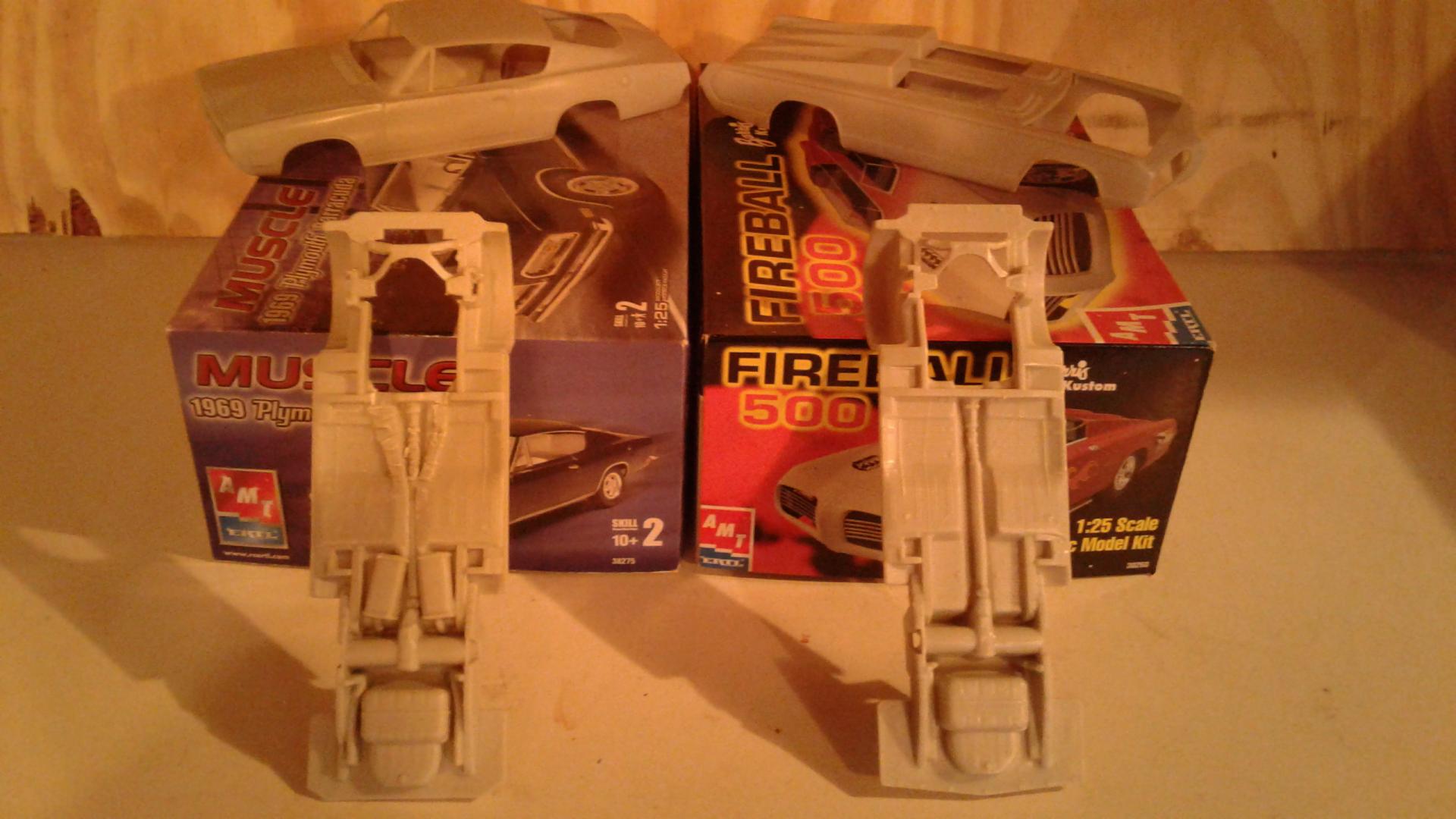 So while attempting to hack away at the ugly molded-in exhaust On the old AMT 'cuda kit, i stumbled on the Fireball 500 kit that i Had in my stash. Upon inspection, they share the same AMT chassis Except theres NO UGLY EXHAUST pipes/mufflers molded in. A real time saver. Still not a great chassis.....just better.