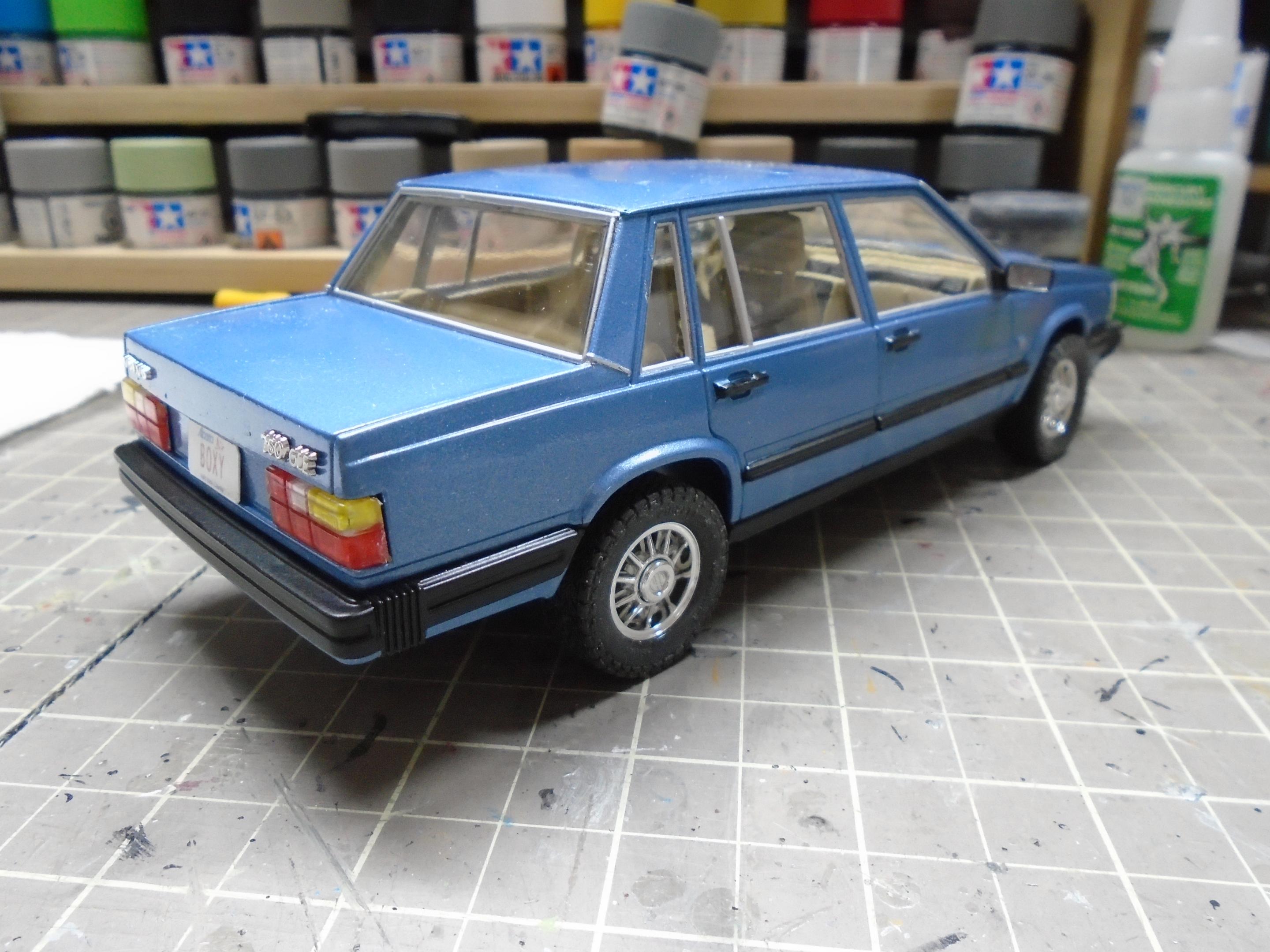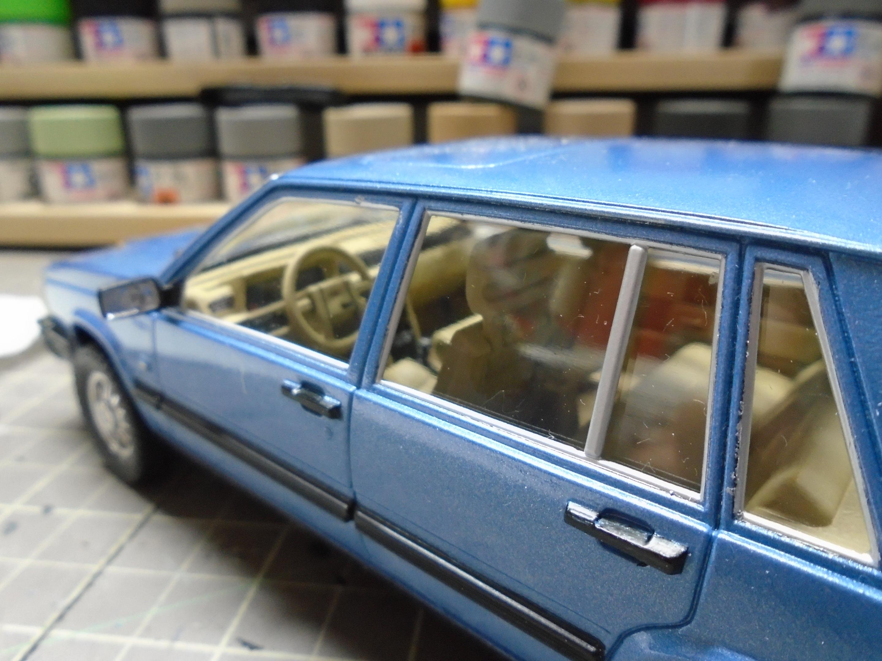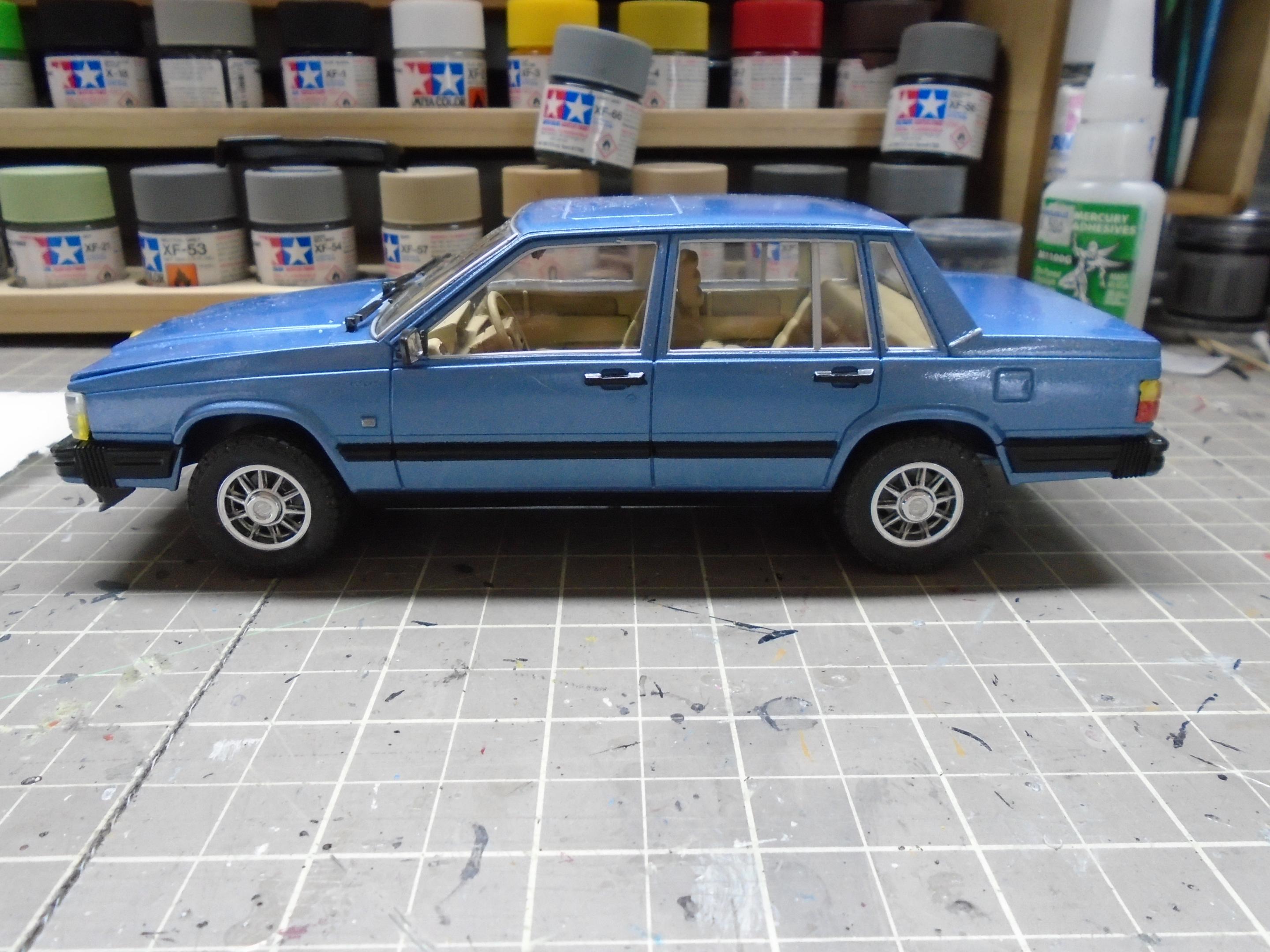 Something a little different. This is Italeri's Volvo 760 GLE, I believe original issue from the 80s. Very simple kit that produces a reasonable facsimile of this boxy classic. Went together well, but I had two issues. First, the ride height. The pics you see are AFTER i shaved off some parts to try and lower it. I guess with some black trim, this could be easily turned into a 760 XC! Second, the front grille/headlights did not fit well. Sanded, trimmed, shaved. Just not a great fit. And the hood seemed too flat. Still, I like this kit, and wouldn't mind grabbing one of the new reissues and building a modified version. Lowered suspension, BBS wheels, etc. Paint is Duplicolour's GM Light Blue Metallic. Interior is a Duplicolour Vinyl & Fabric paint. Suitably 80s colour combo. Built box stock, with the addition of some flocking. Turned out okay. The inspiration for colours. And the pics.